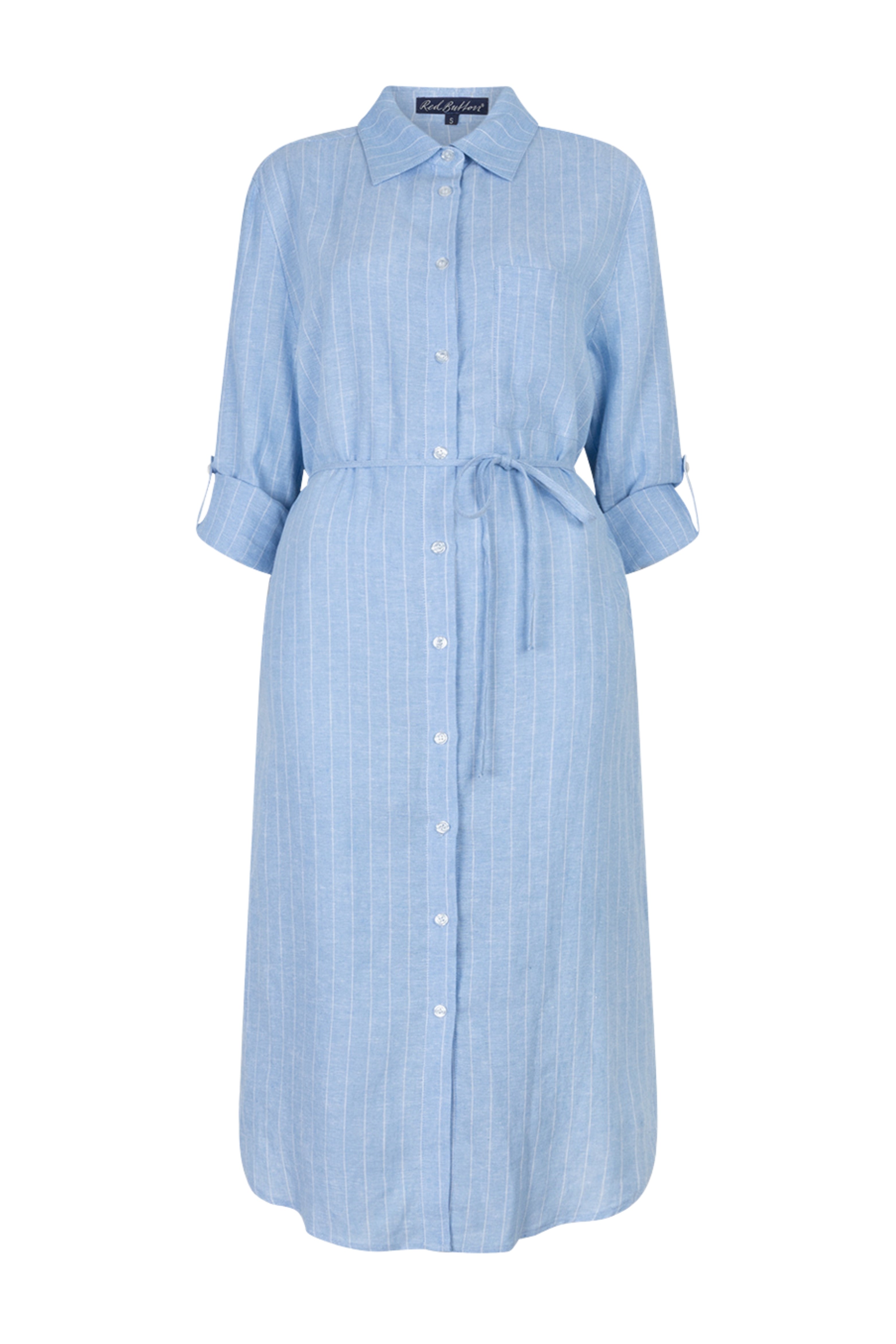 De Jurk Linen Visco Pinstripe Light Blue van Red Button is een luchtige doorknoopjurk met een verfijnde pinstripe. De linnen-viscosemix en het strikceintuur zorgen voor een comfortabele, vrouwelijke fit met een frisse uitstraling.