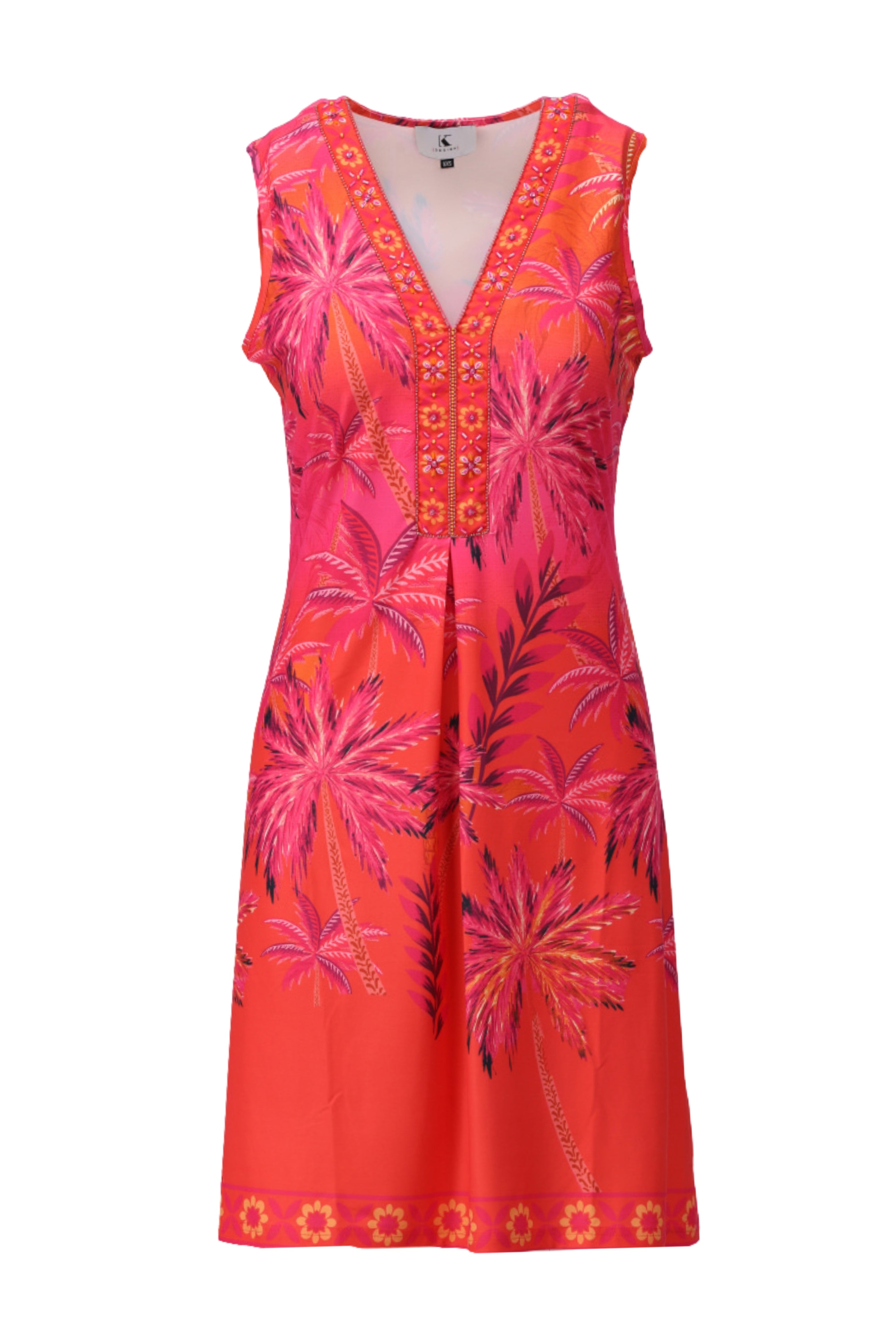 De Jurk Mouwloos Met Design van K-design is een vrouwelijke jurk met V-hals. De soepele stof en kleurrijke bloemenprint geven een zomerse, moderne look. Ideaal voor vakantie of een zomers diner.
