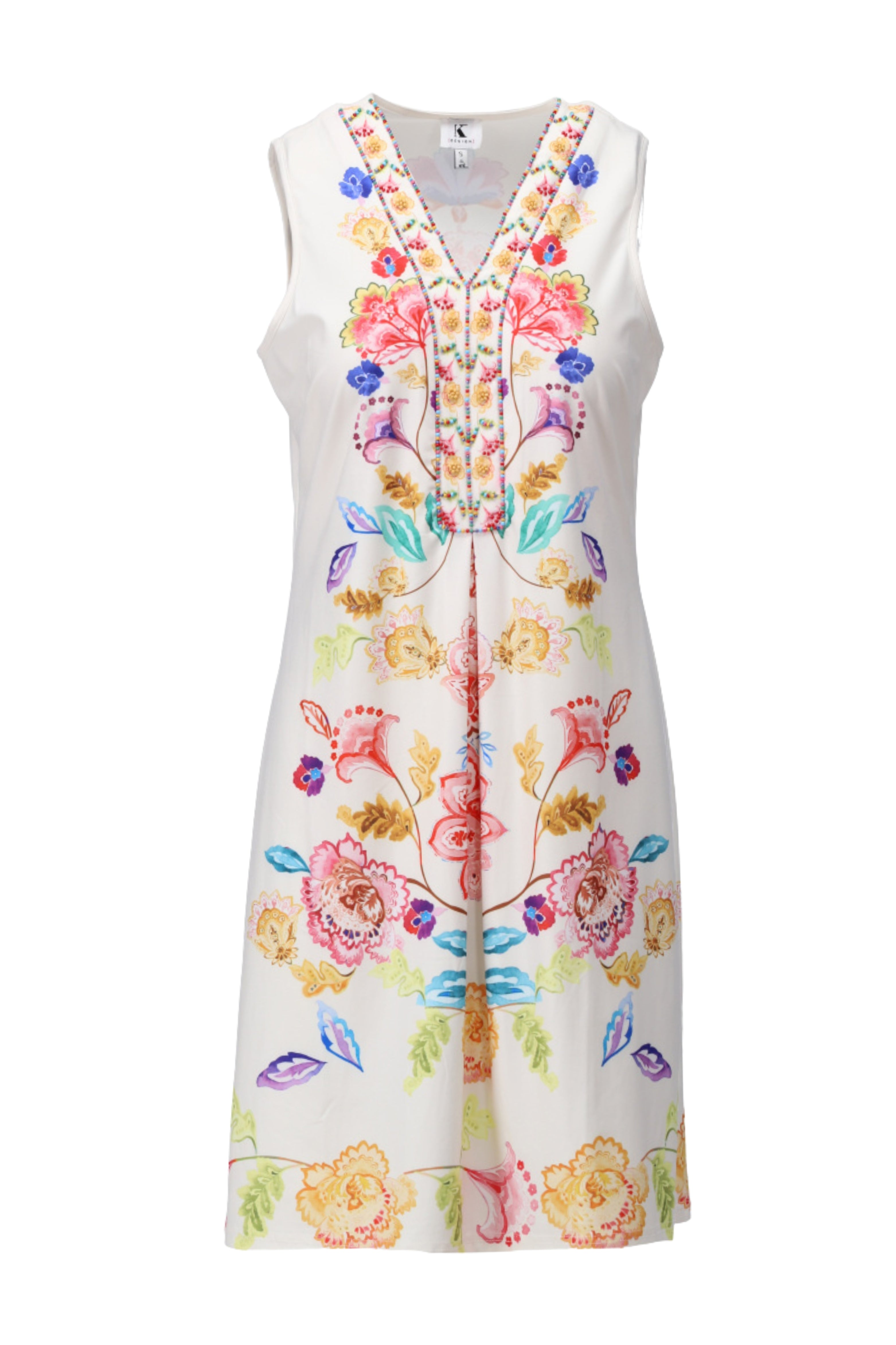 De Jurk Mouwloos Met Design van K-design is een jurk met V-hals. De soepele jersey en kleurrijke bloemenprint geven een elegante, zomerse look. Ideaal voor vakantie of tuinfeest.