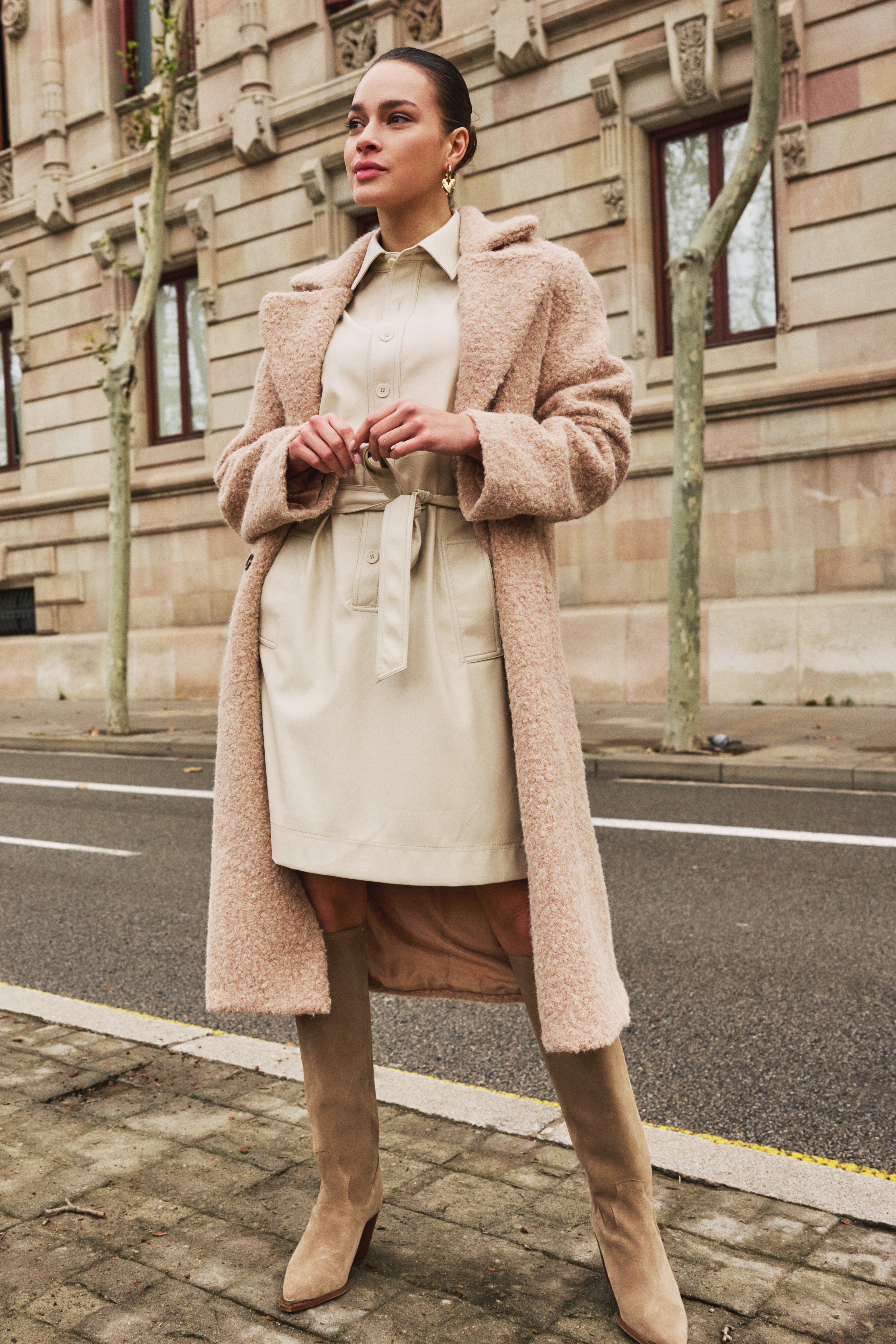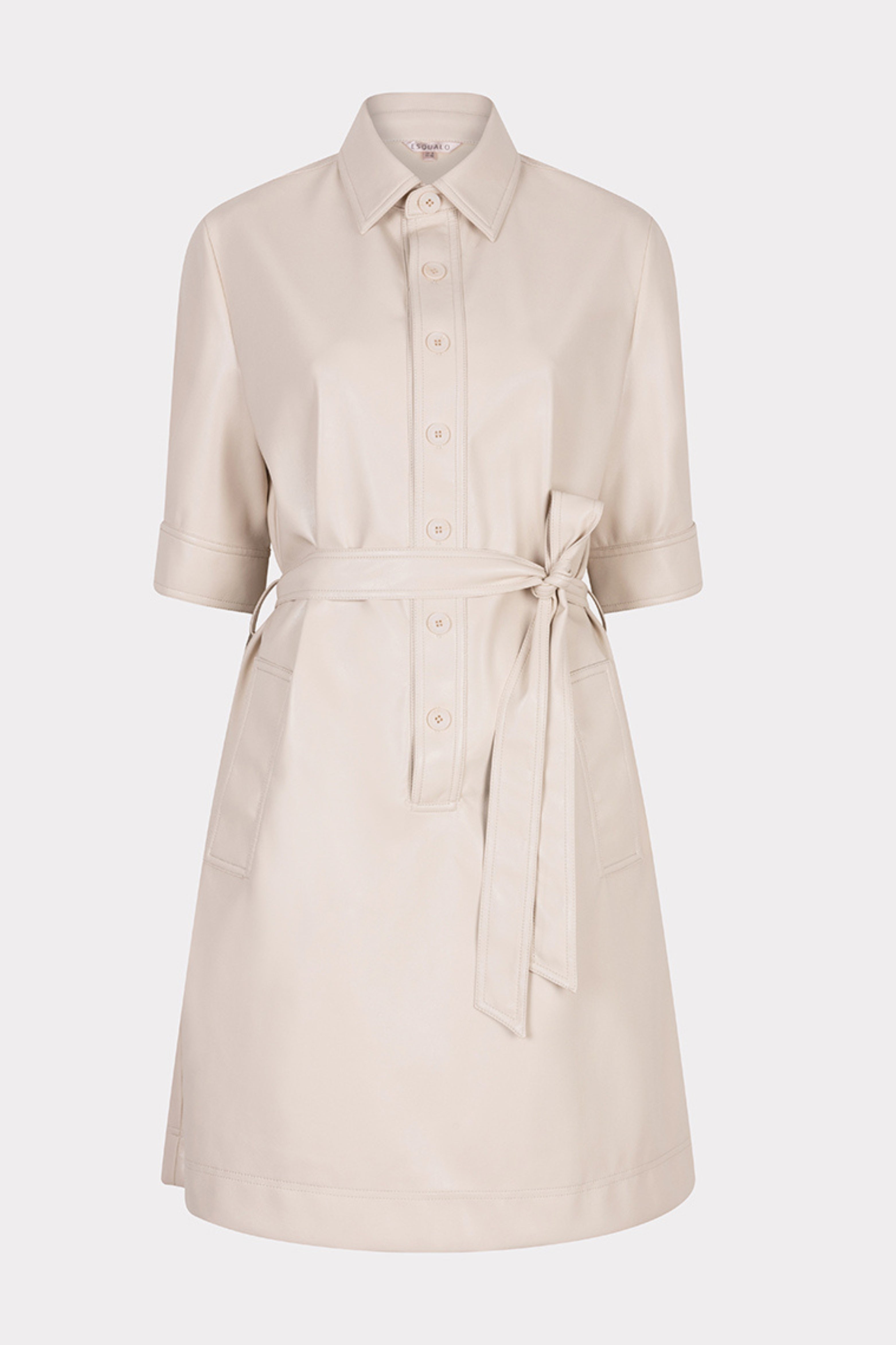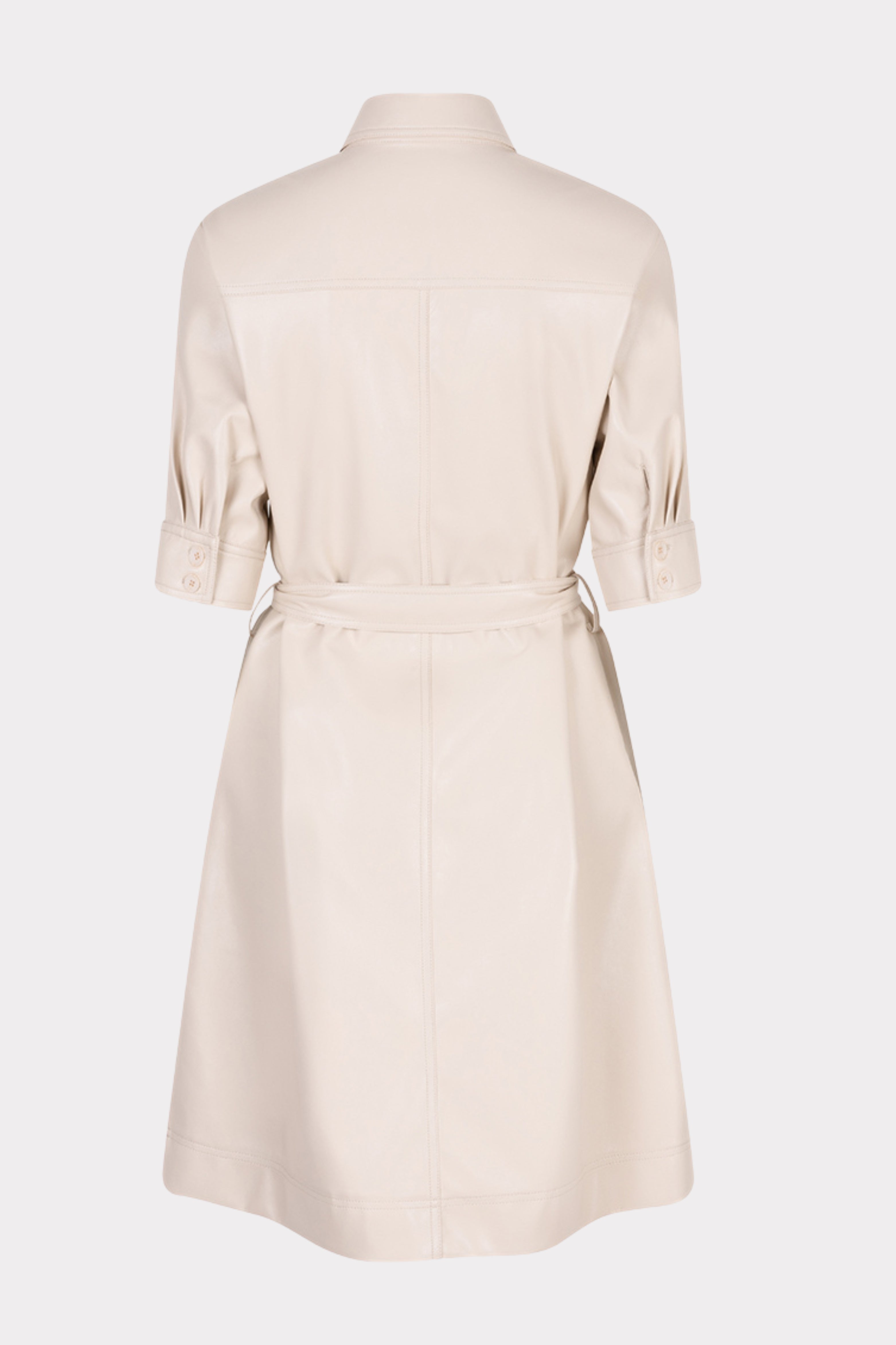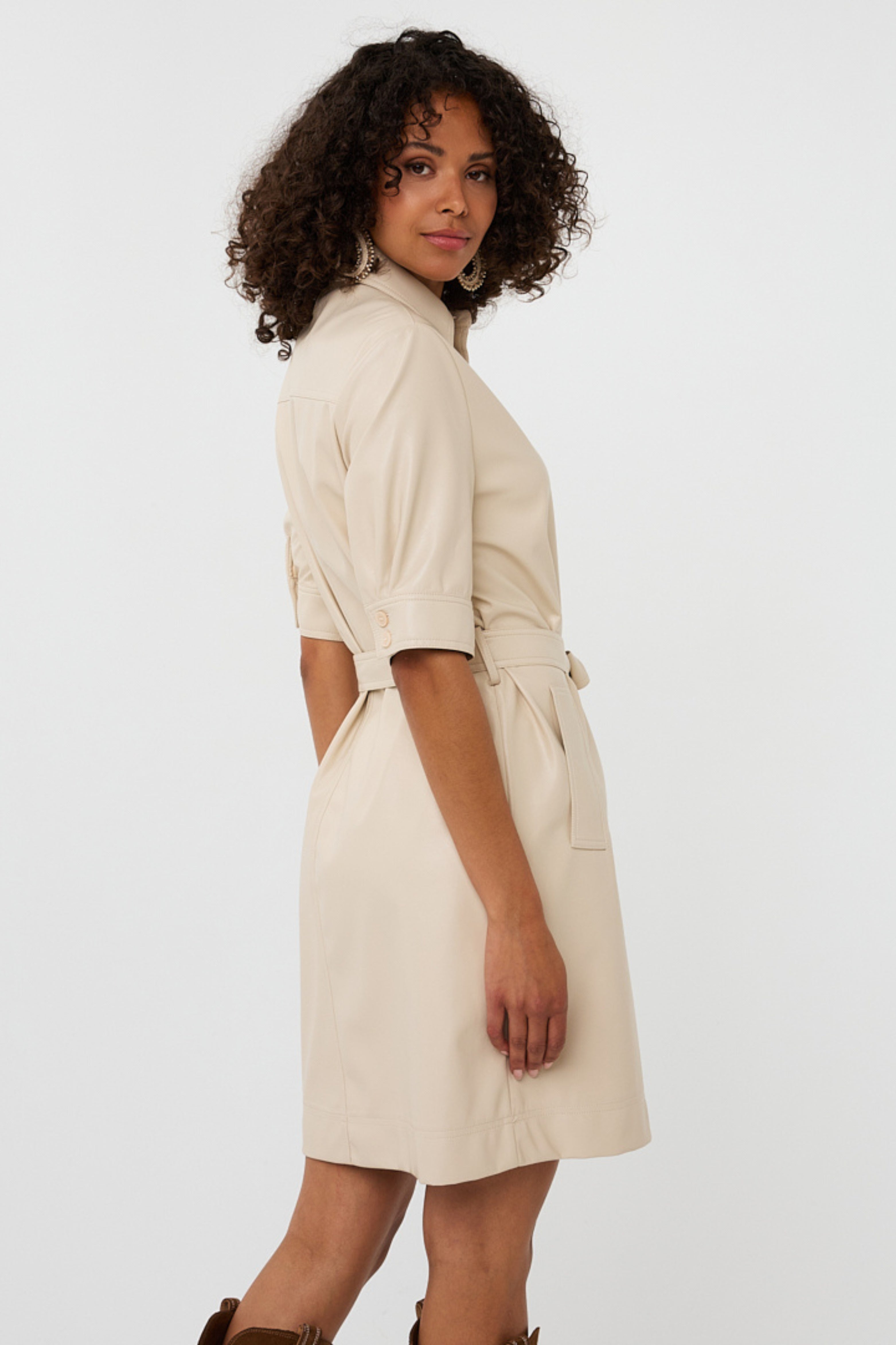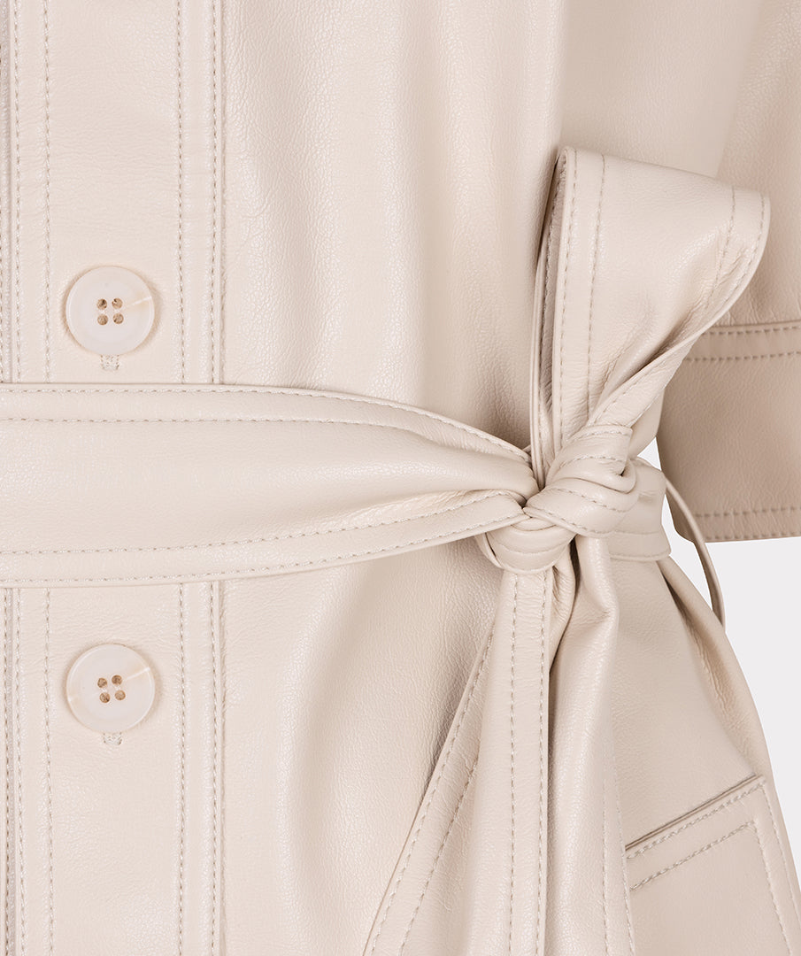Deze doorknoopjurk van superzacht vegan leer voelt luxe en draagt heerlijk. De bijpassende ceintuur accentueert je taille, terwijl de licht zandkleur een elegante, tijdloze uitstraling geeft. Perfect voor een chique maar stoere look.