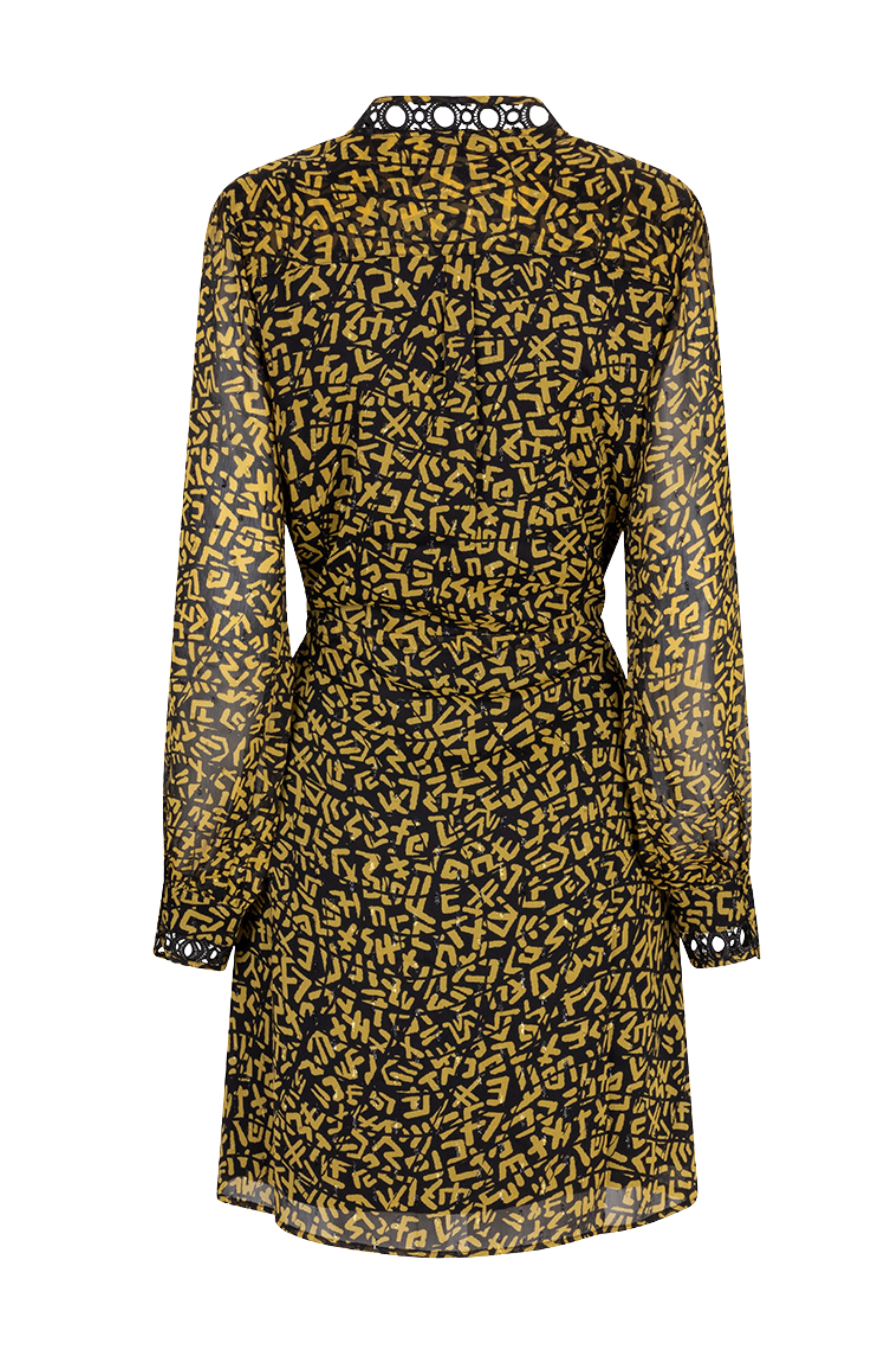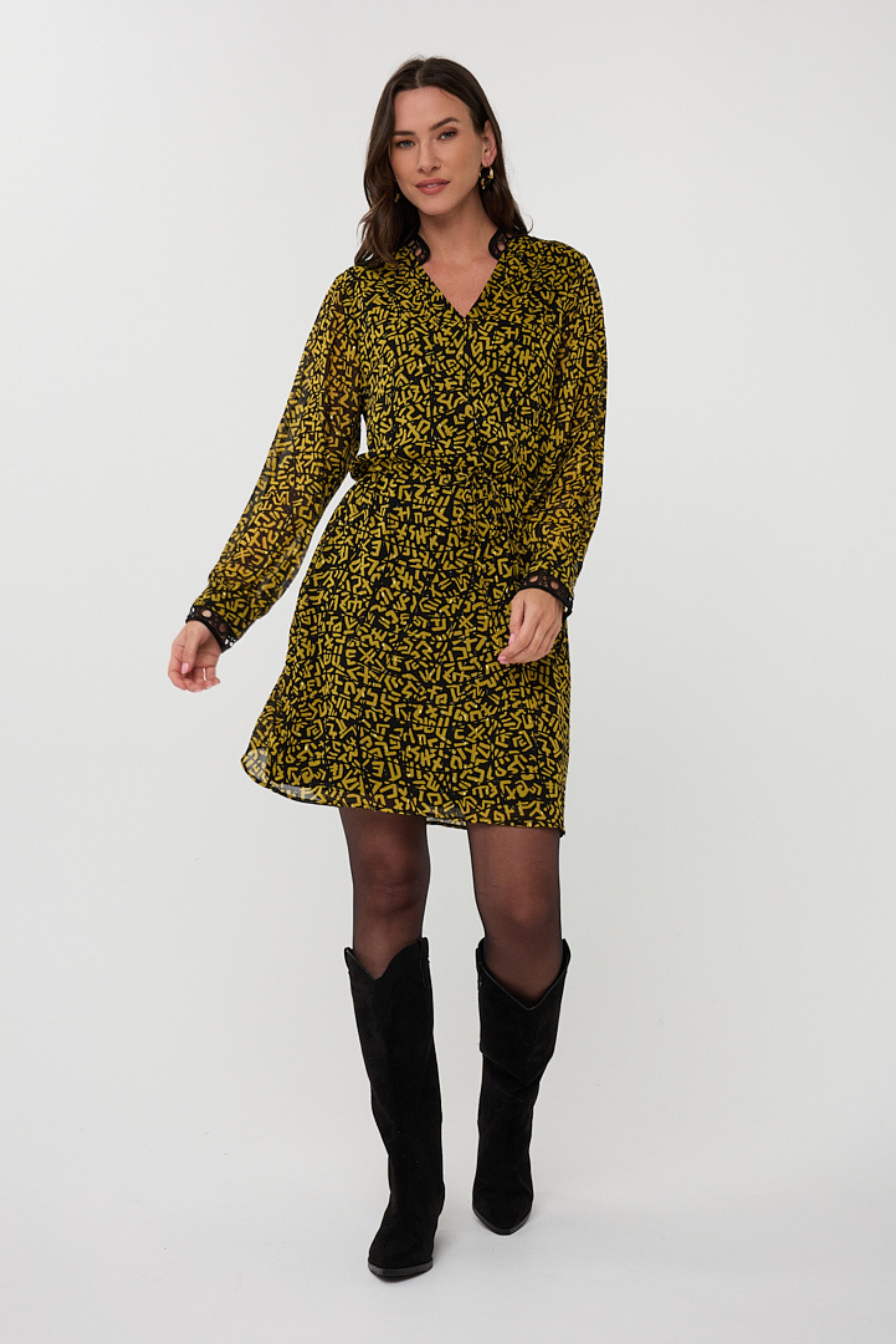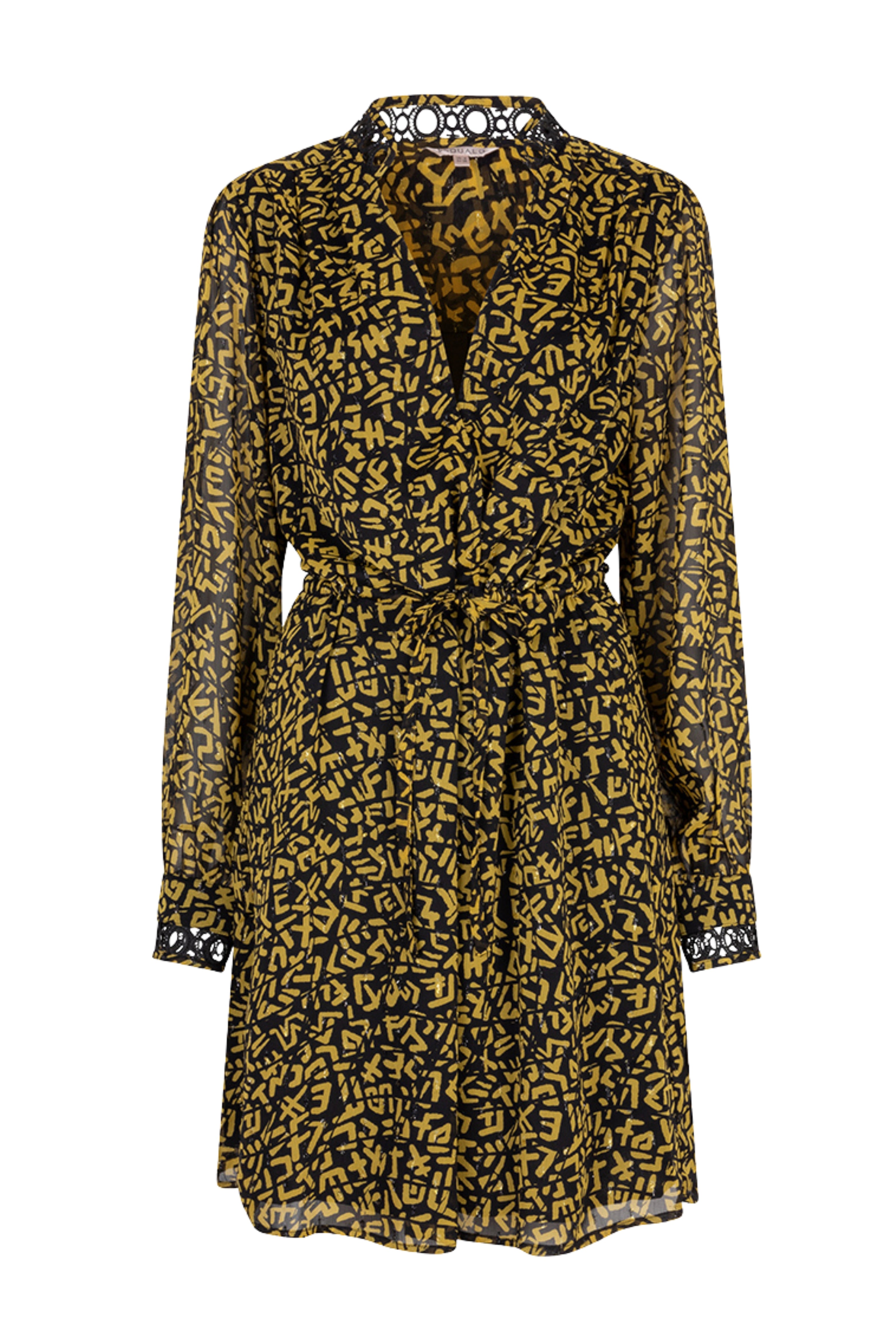 Jurk Unified Print van EsQualo heeft een speelse grafische print in zwart en geel. De jurk valt soepel, heeft een strikceintuur voor een vrouwelijke taille en is afgewerkt met kanten details aan hals en mouwen.