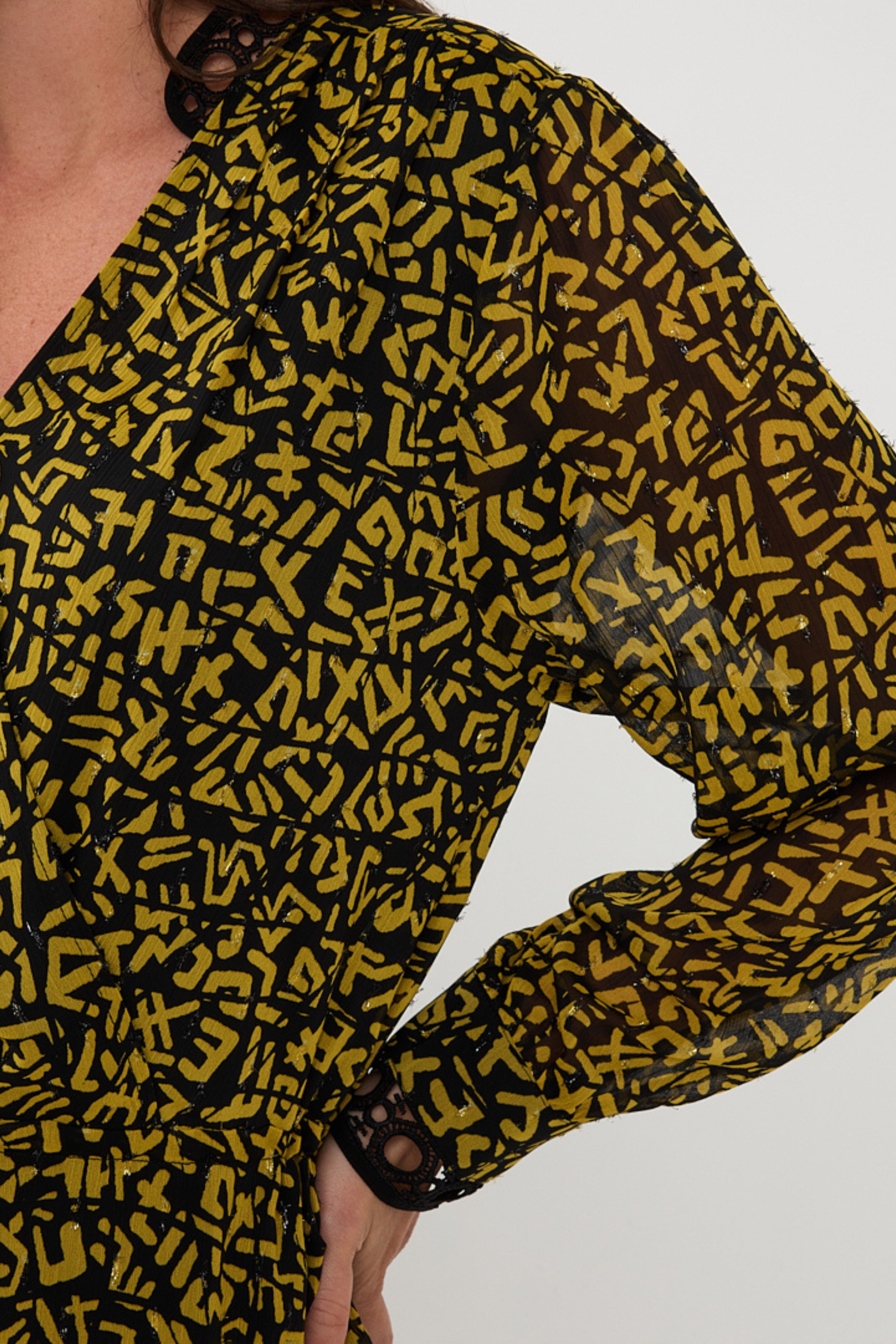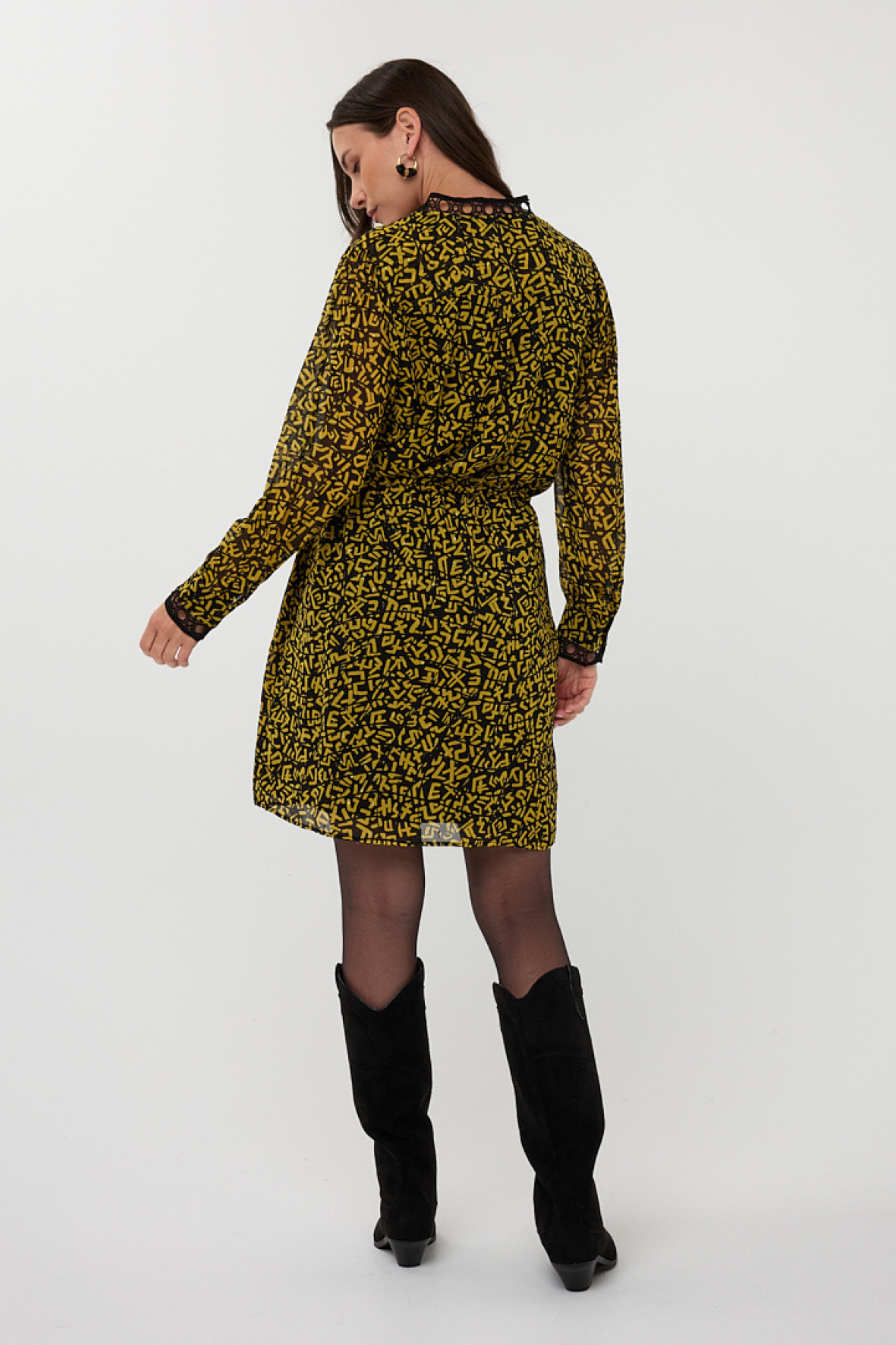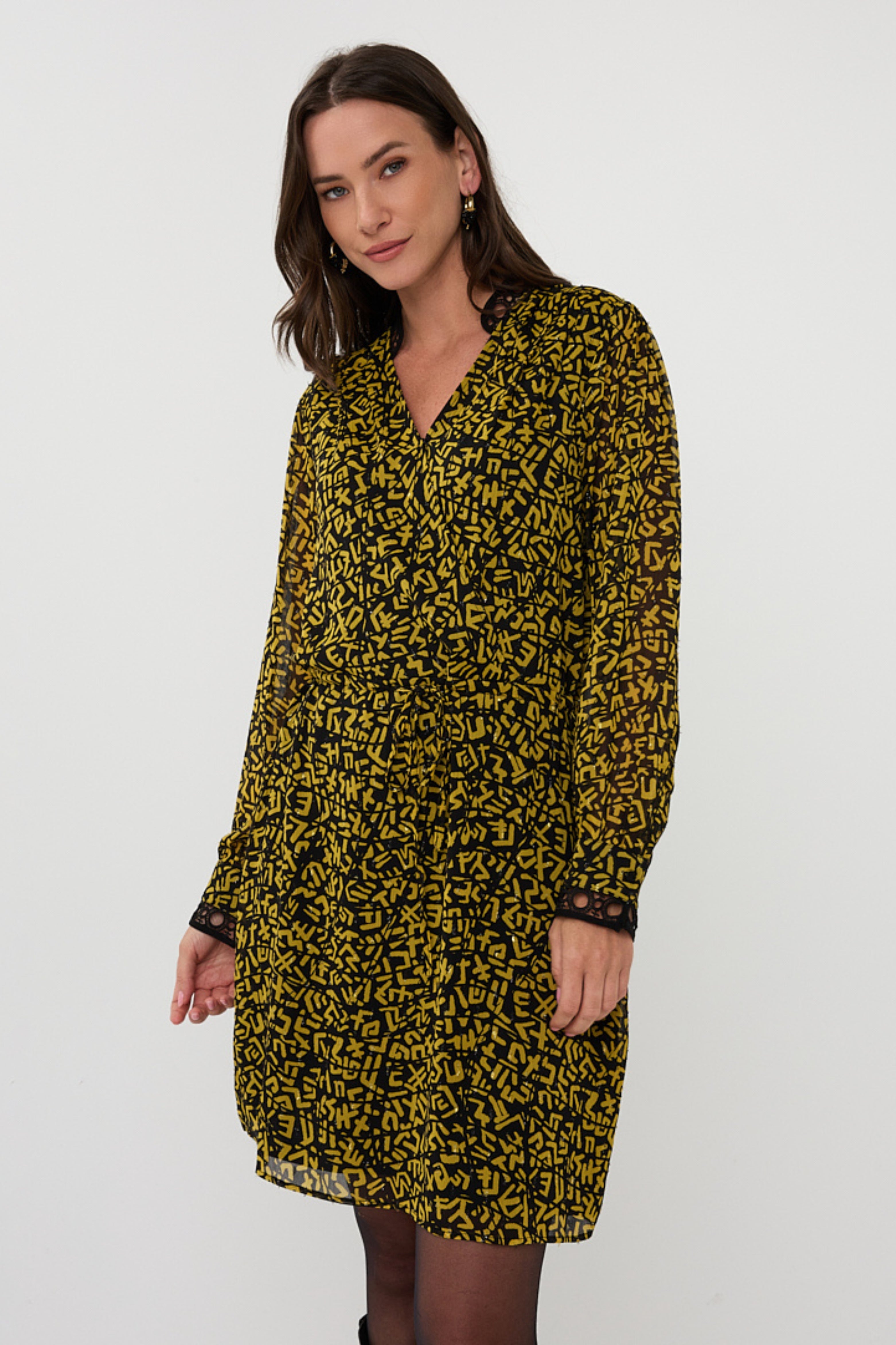 Jurk Unified Print van EsQualo heeft een speelse grafische print in zwart en geel. De jurk valt soepel, heeft een strikceintuur voor een vrouwelijke taille en is afgewerkt met kanten details aan hals en mouwen.