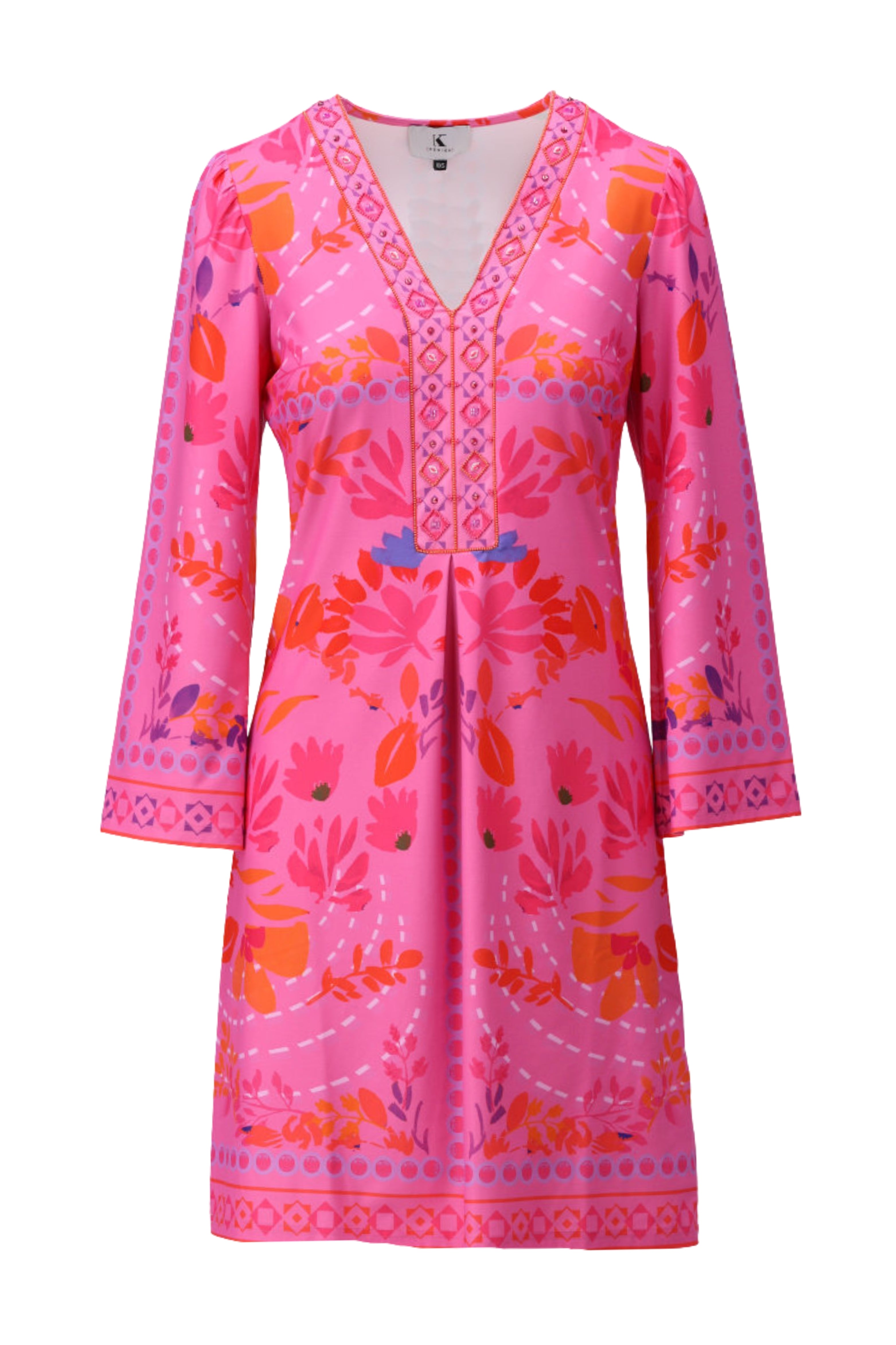 De Jurk V-hals Met Design van K-design is een vrouwelijke jurk met V-hals. De soepele stretchstof en de kleurrijke print zorgen voor een flatterende, moderne look. Ideaal voor zomerse gelegenheden of een diner op terras.