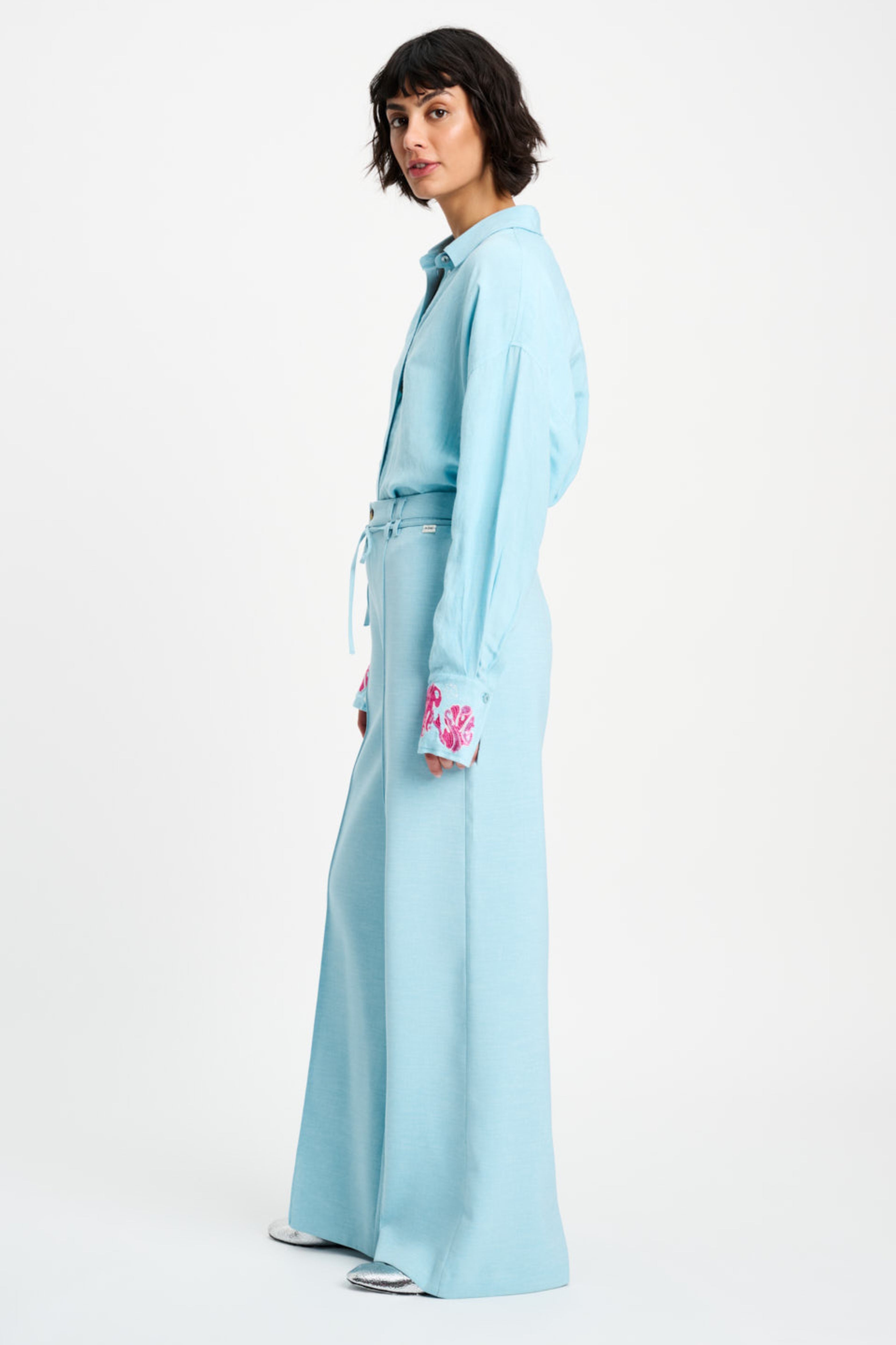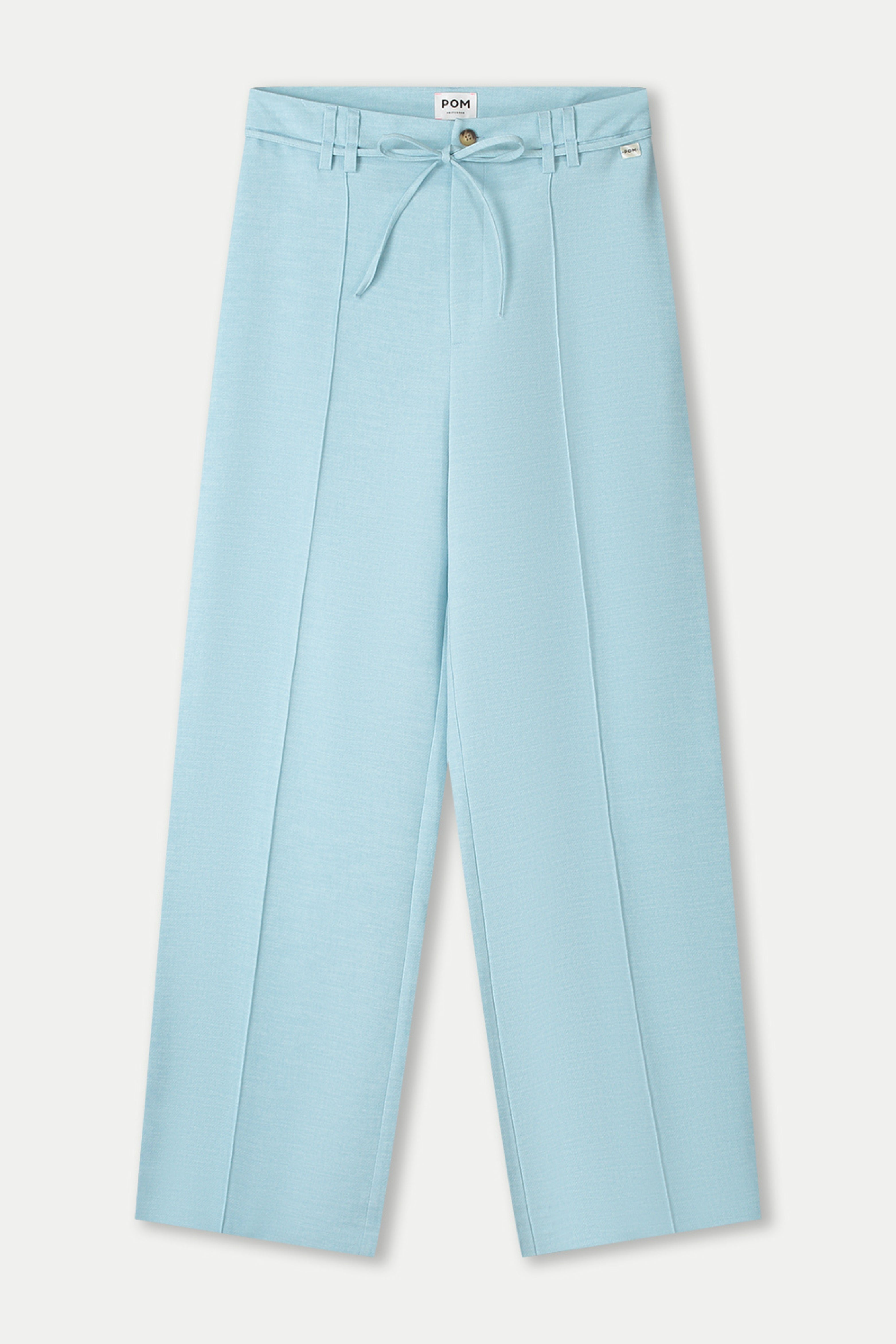 De Pants Jess Blue Mist van POM Amsterdam is een elegante, lichtblauwe broek met wide-leg pasvorm. Met persvouwen, striksluiting en riemlussen geeft dit stijlvolle model elke outfit een frisse, moderne uitstraling.