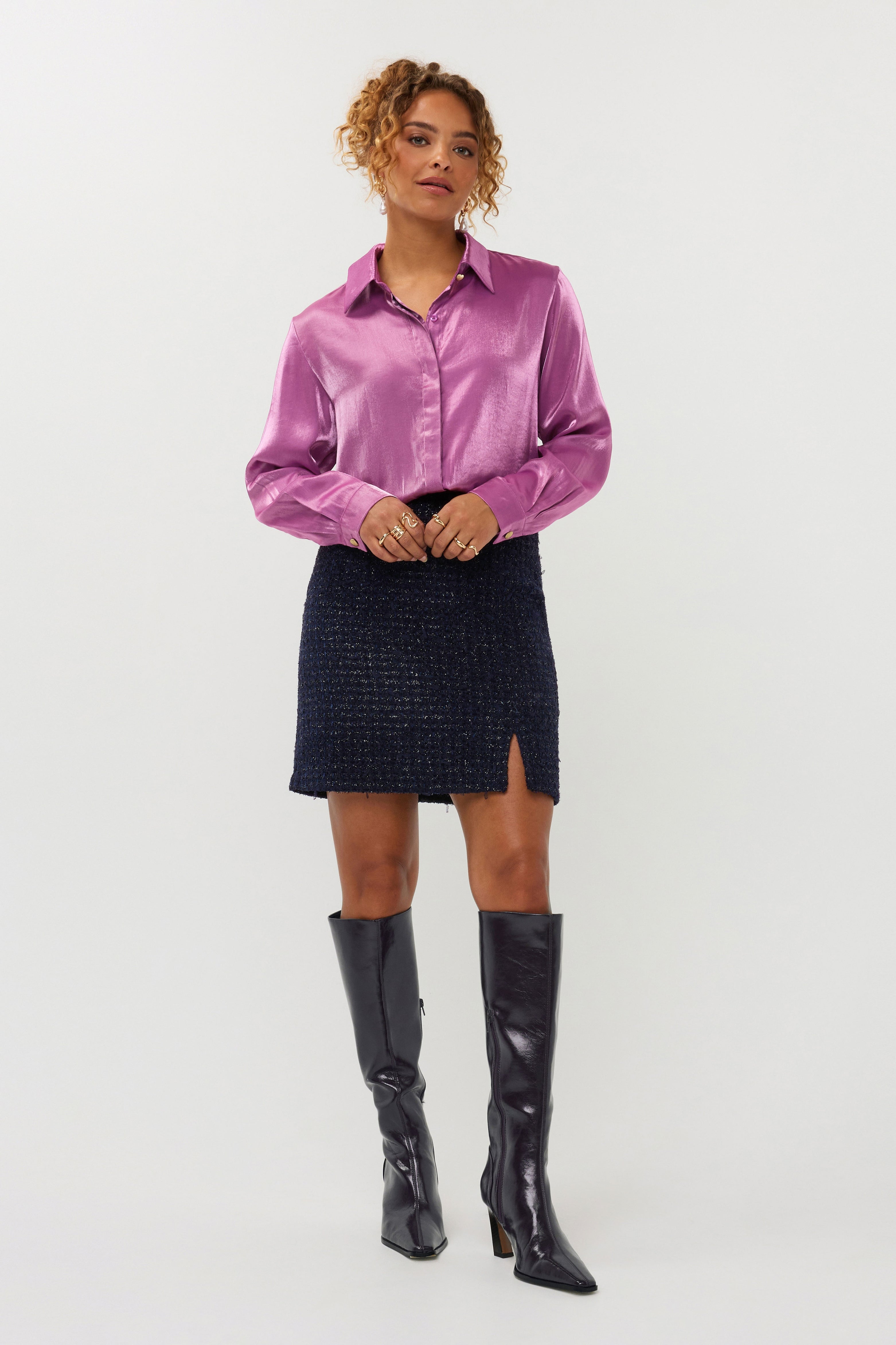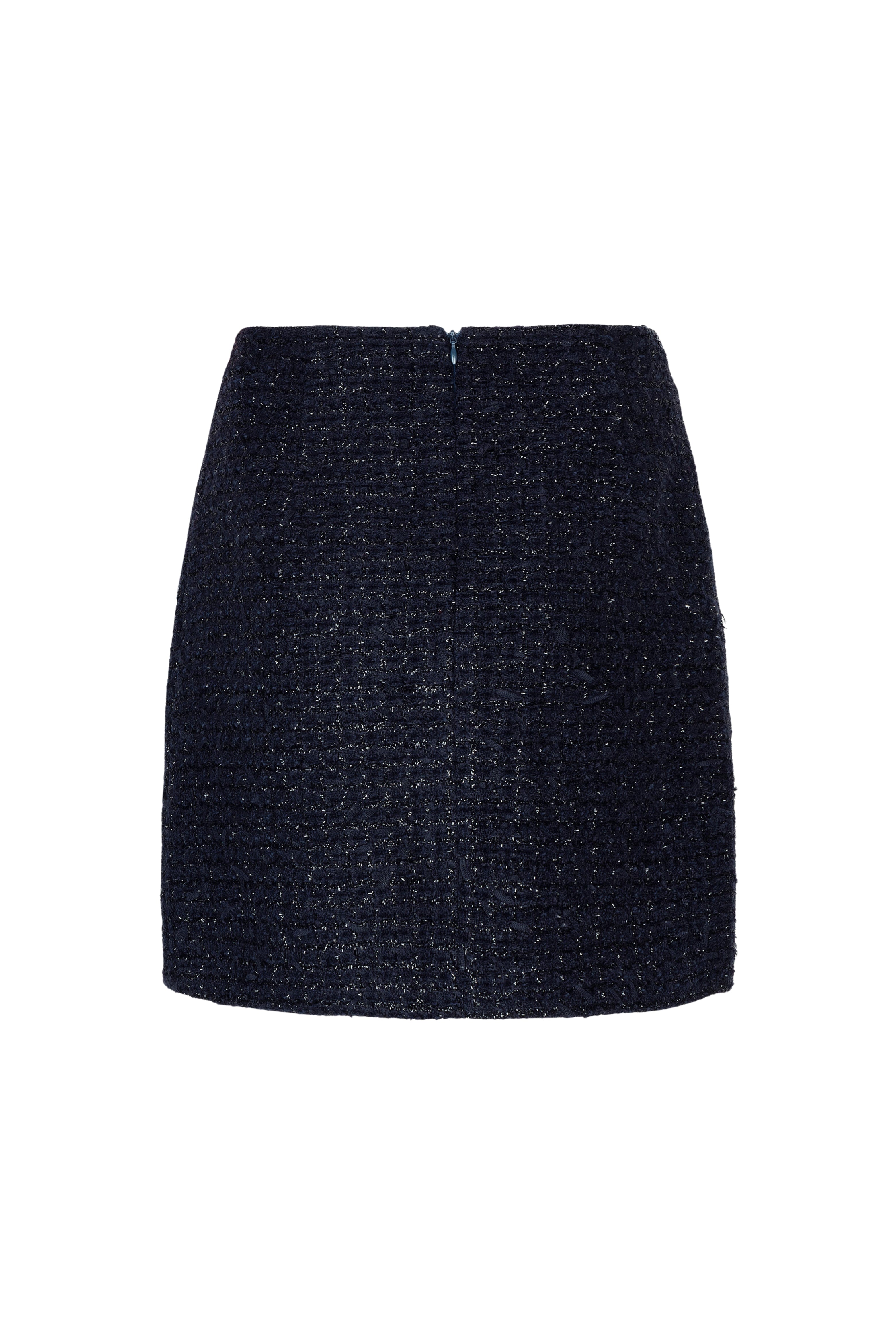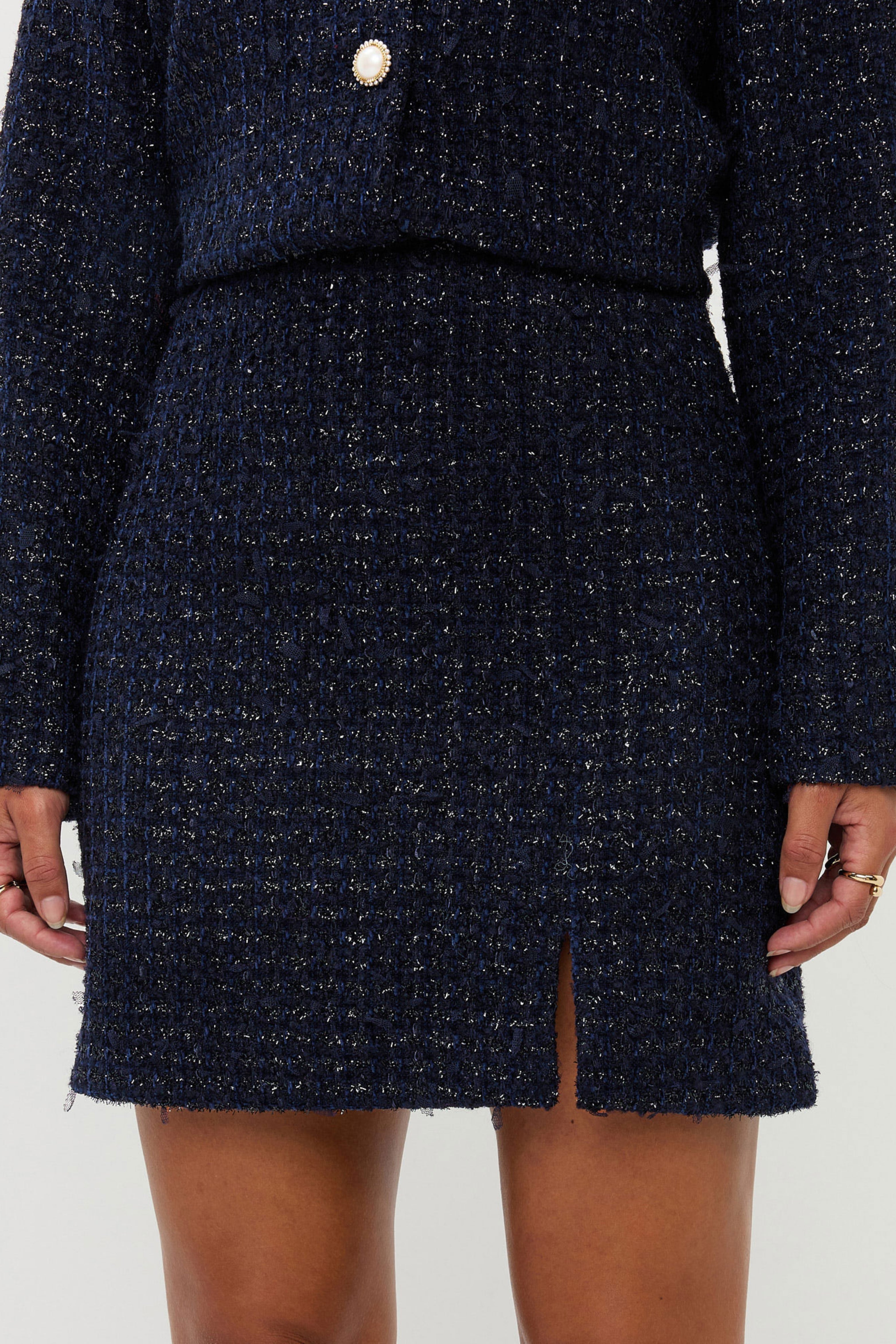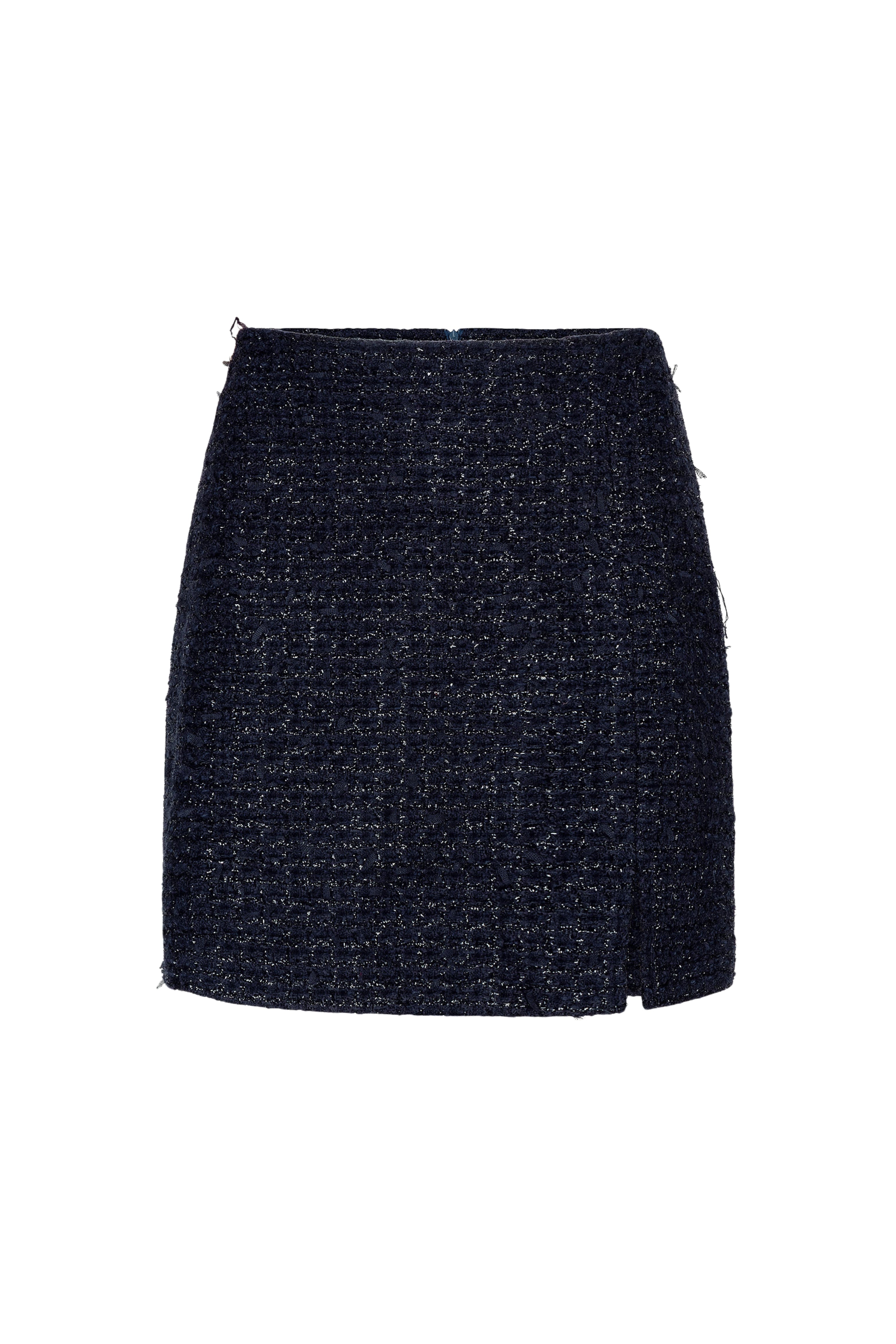 De Rok Femke Navy van Ydence is een elegante mini-rok met een verfijnde boucléstructuur. De subtiele split aan de voorkant en de aangesloten pasvorm zorgen voor een stijlvolle, vrouwelijke look. Perfect te combineren met het Wiske Jacket voor een chique set.