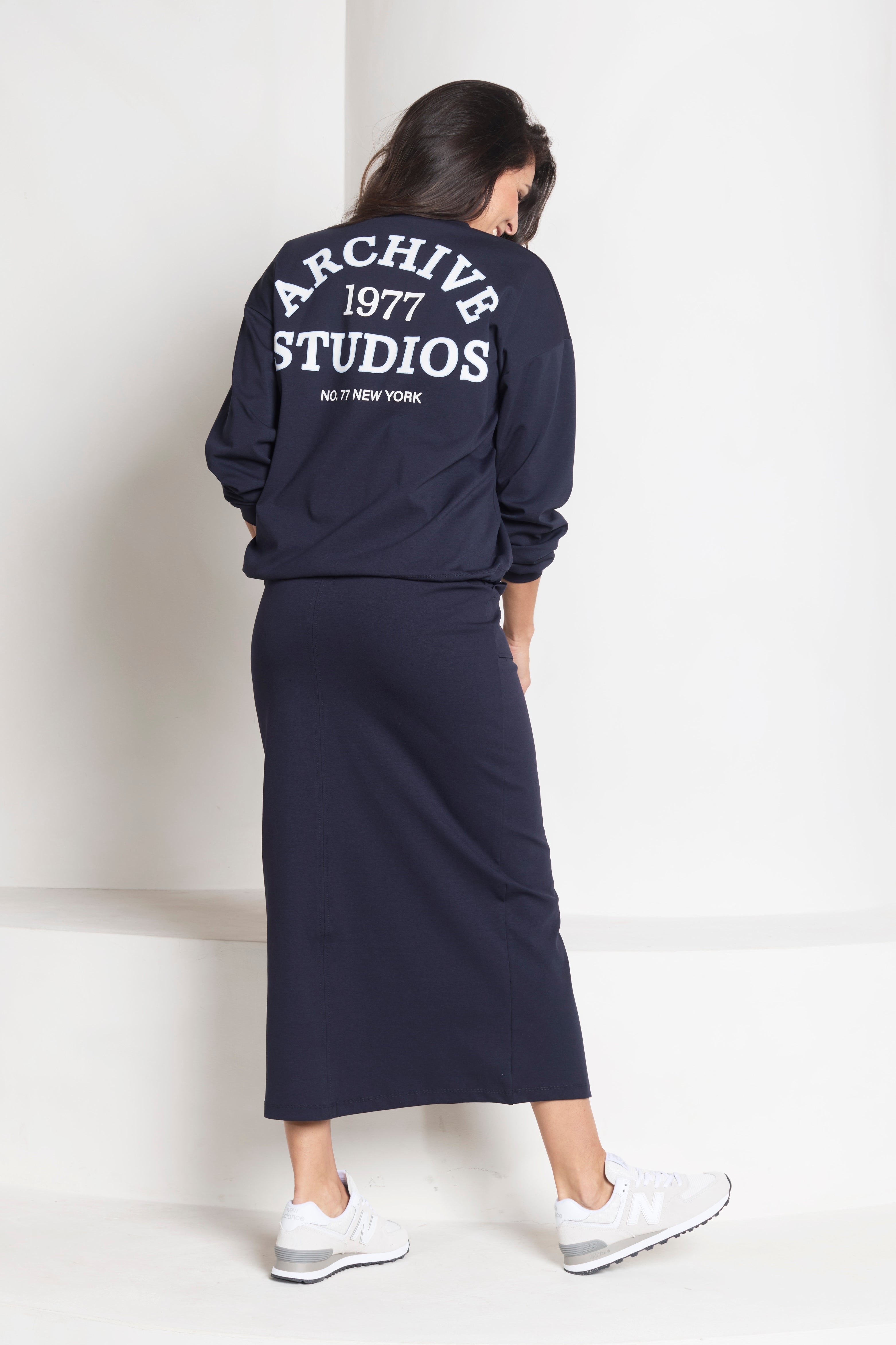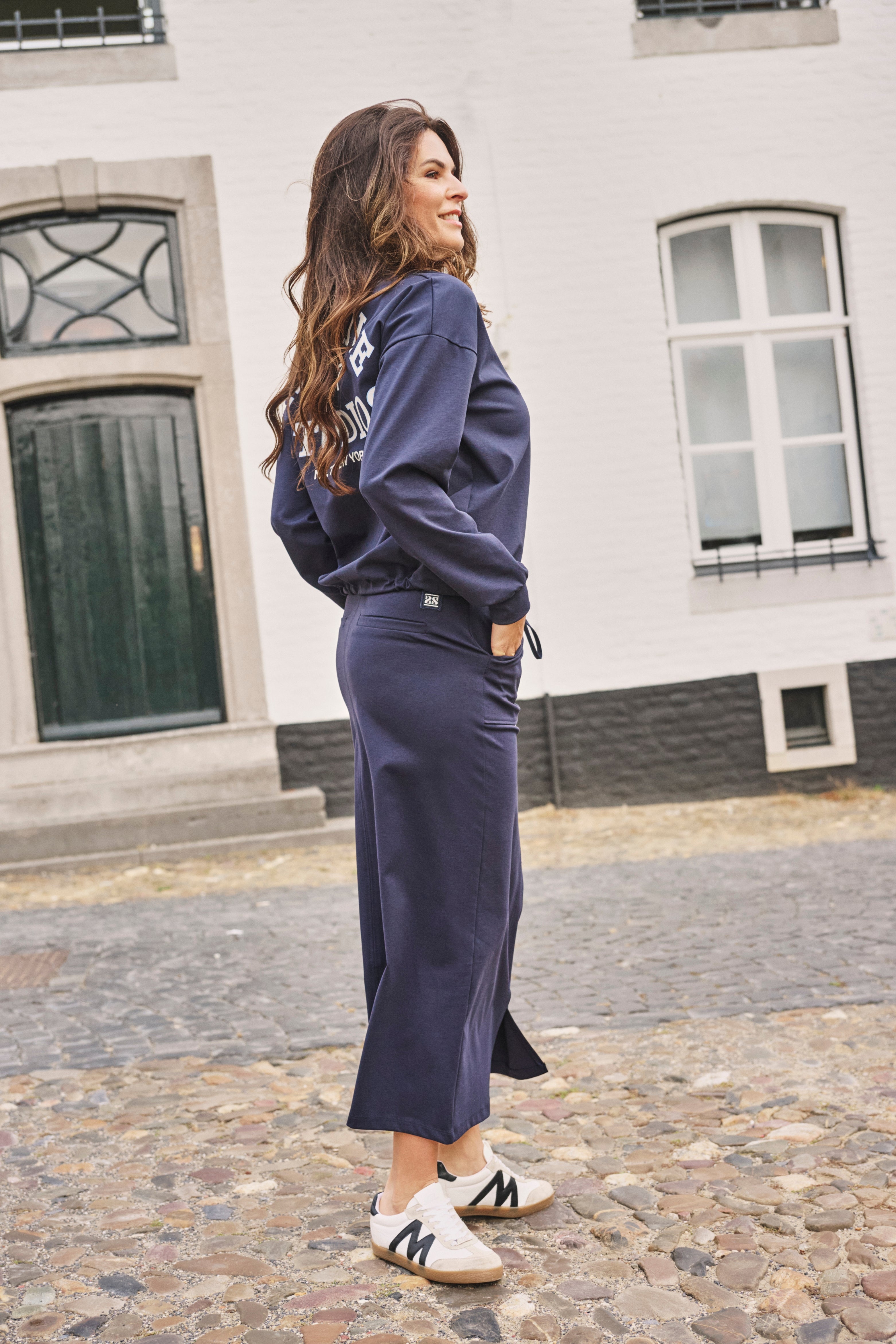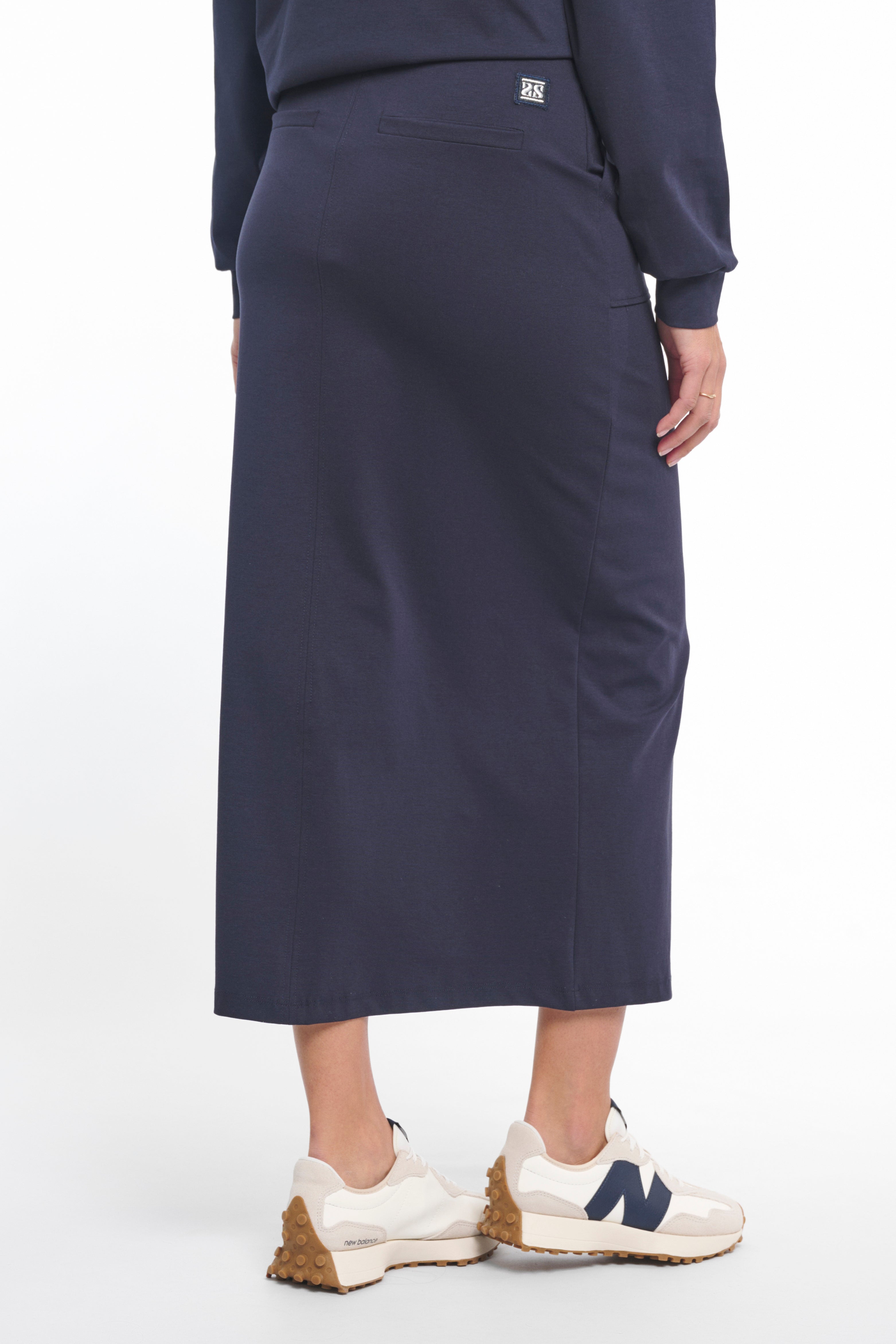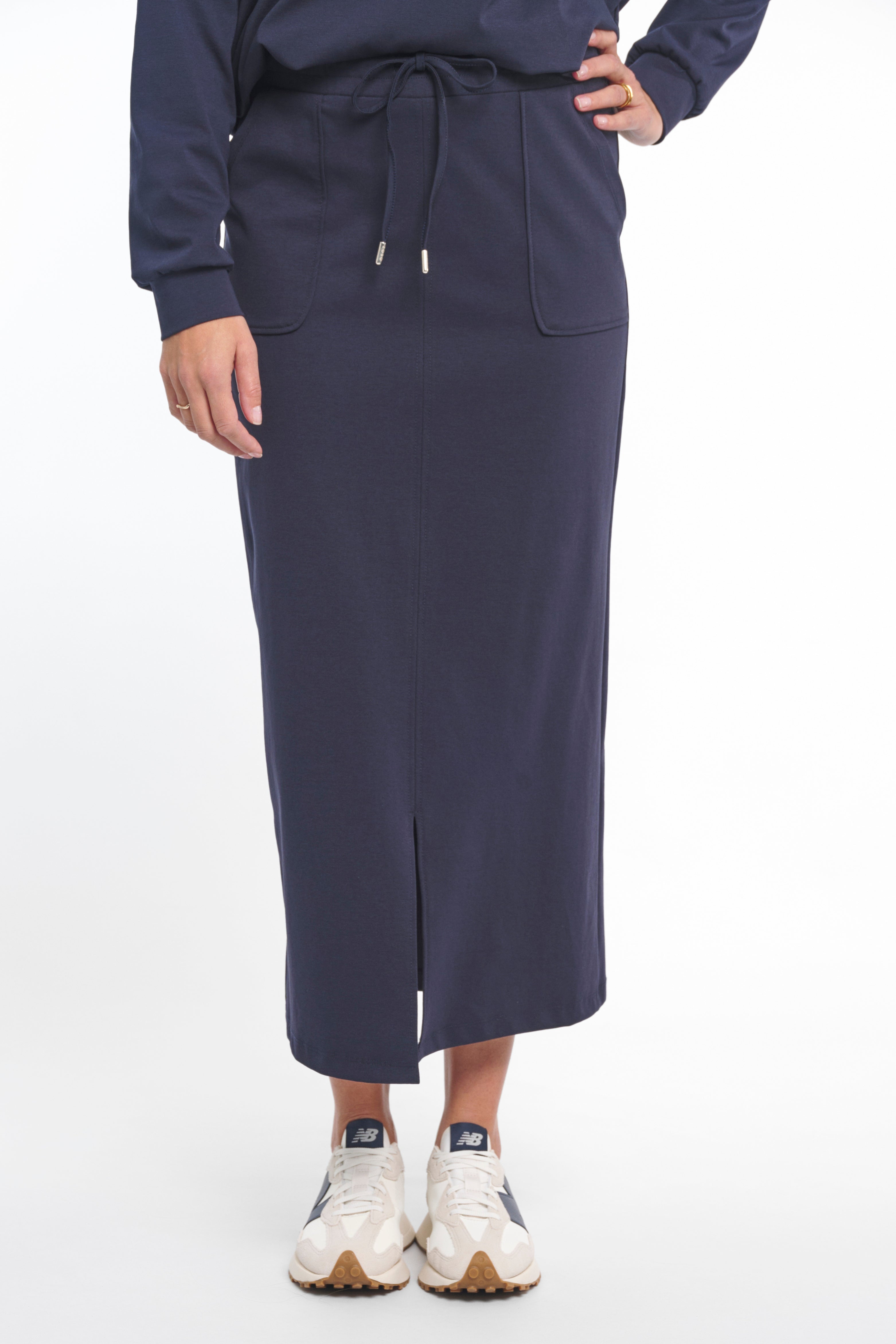Rok Fonda Navy is een comfortabele midi rok met een sportieve uitstraling. De elastische tailleband met koord en de handige steekzakken zorgen voor een moeiteloze pasvorm. De subtiele split aan de voorzijde geeft het model extra bewegingsvrijheid en een vrouwelijk look.