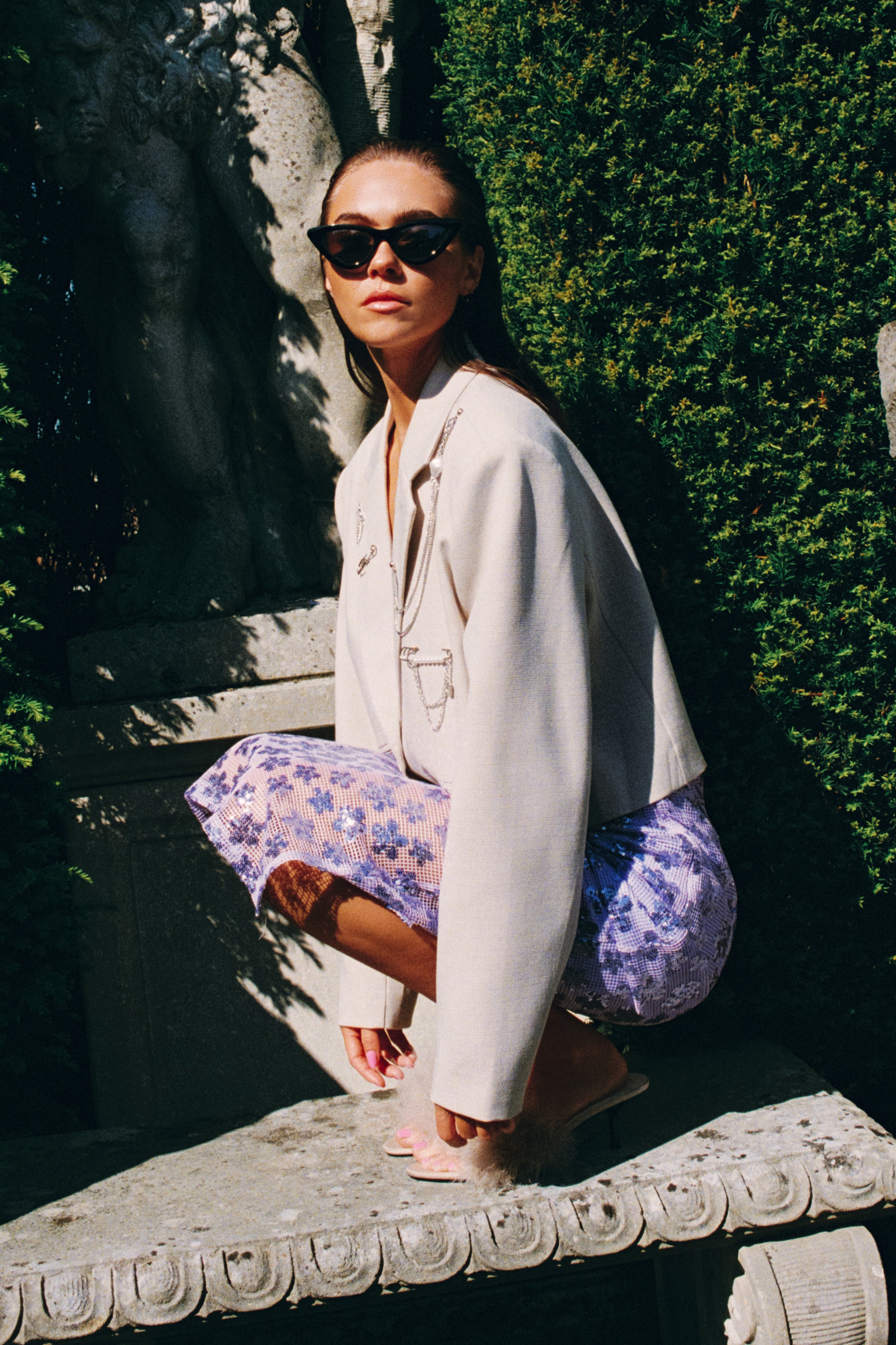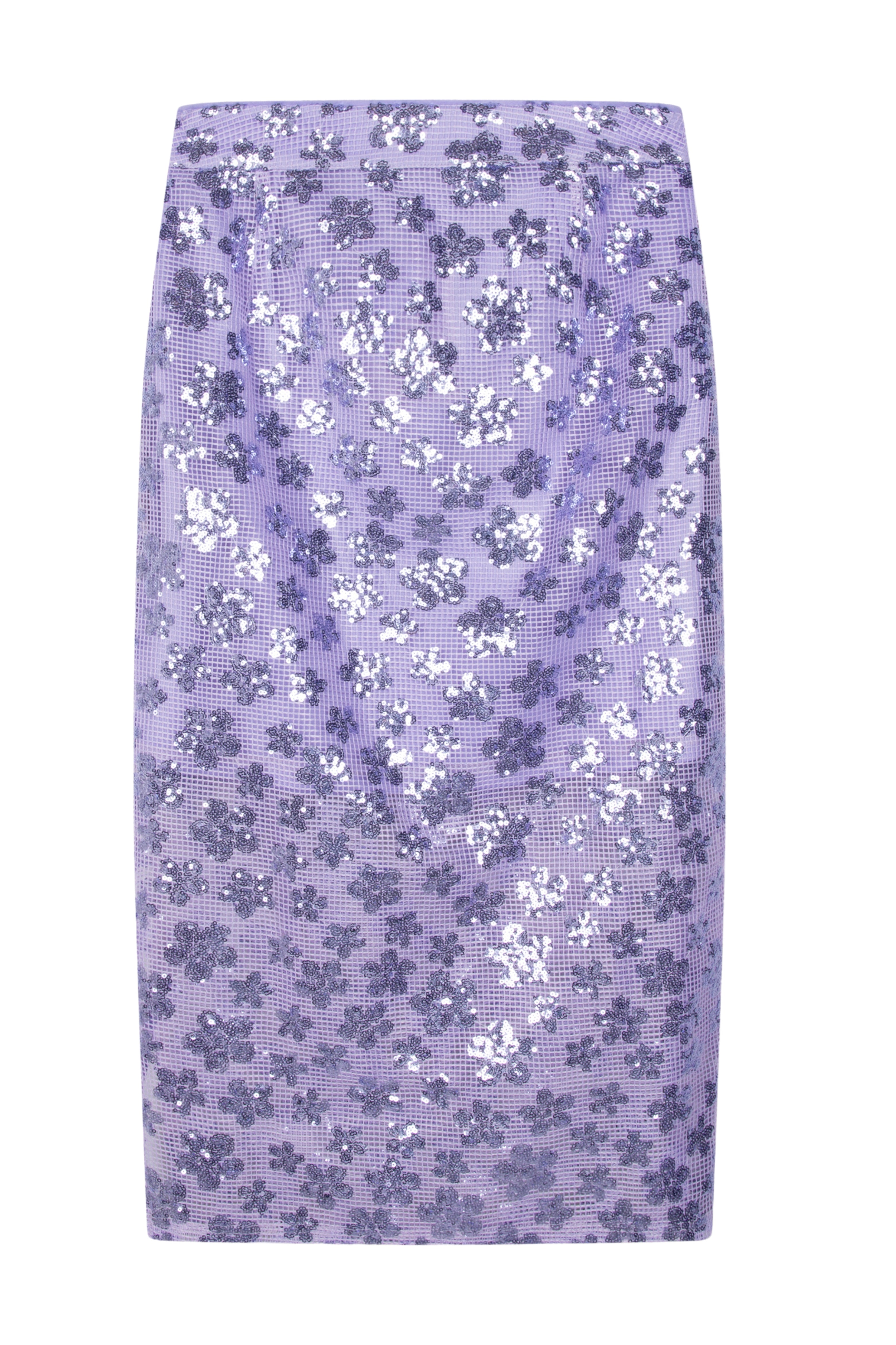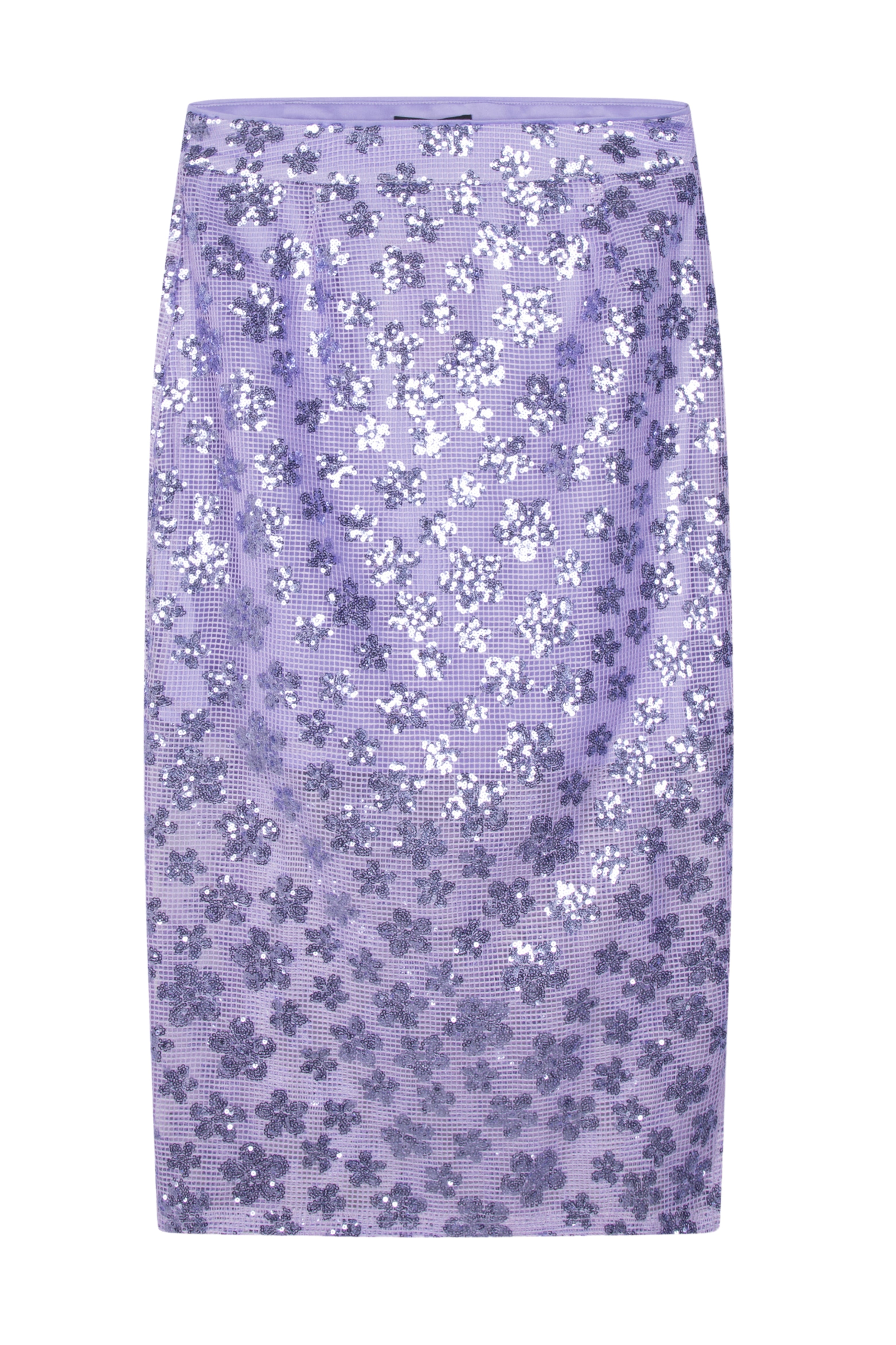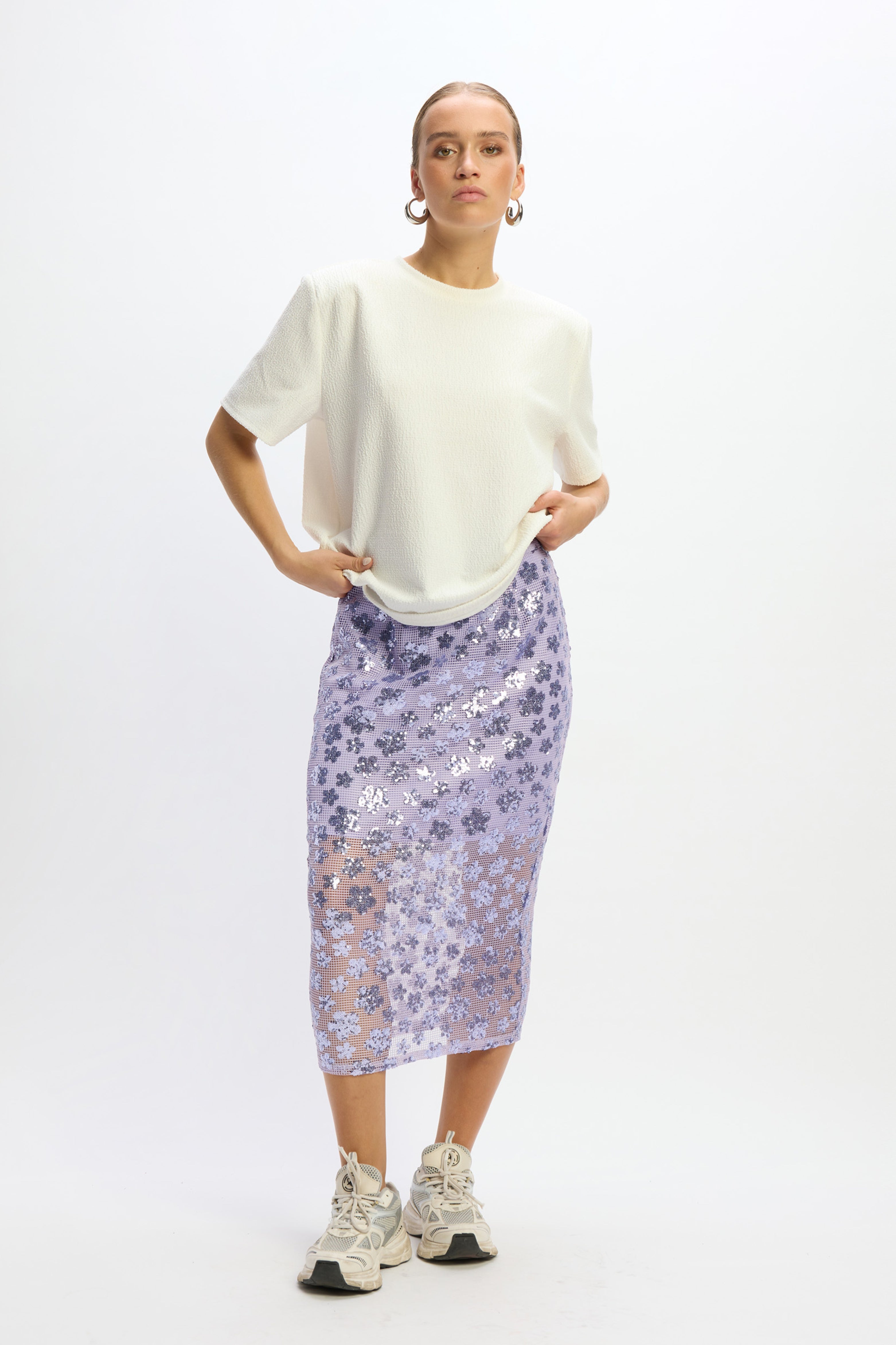 De Jayla Flower Midi Lilac Skirt is een echte eyecatcher met all-over paillettenbloemen op transparant mesh. De midi-lengte en lavendelkleur maken deze rok perfect voor feestelijke en modieuze zomerdagen.