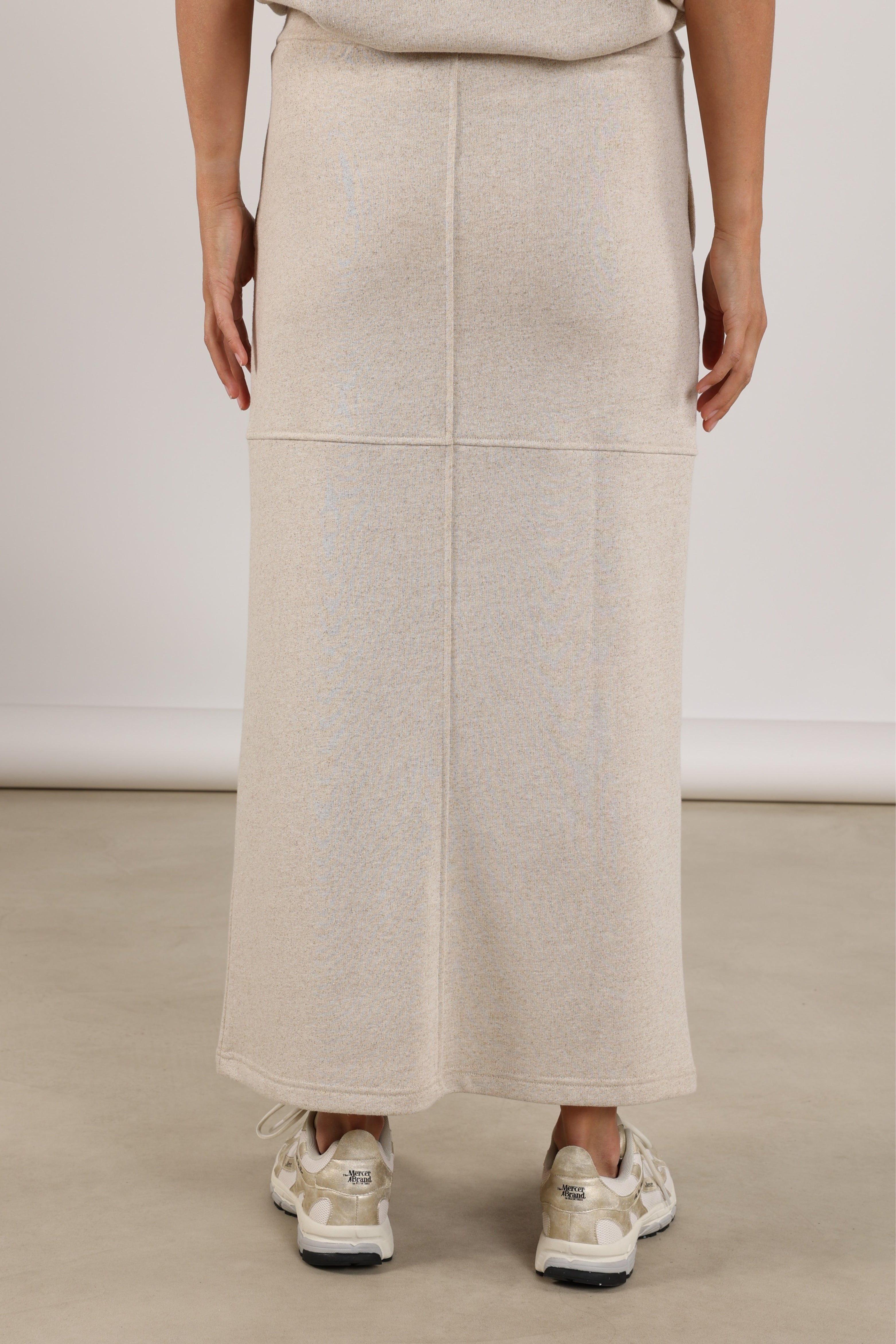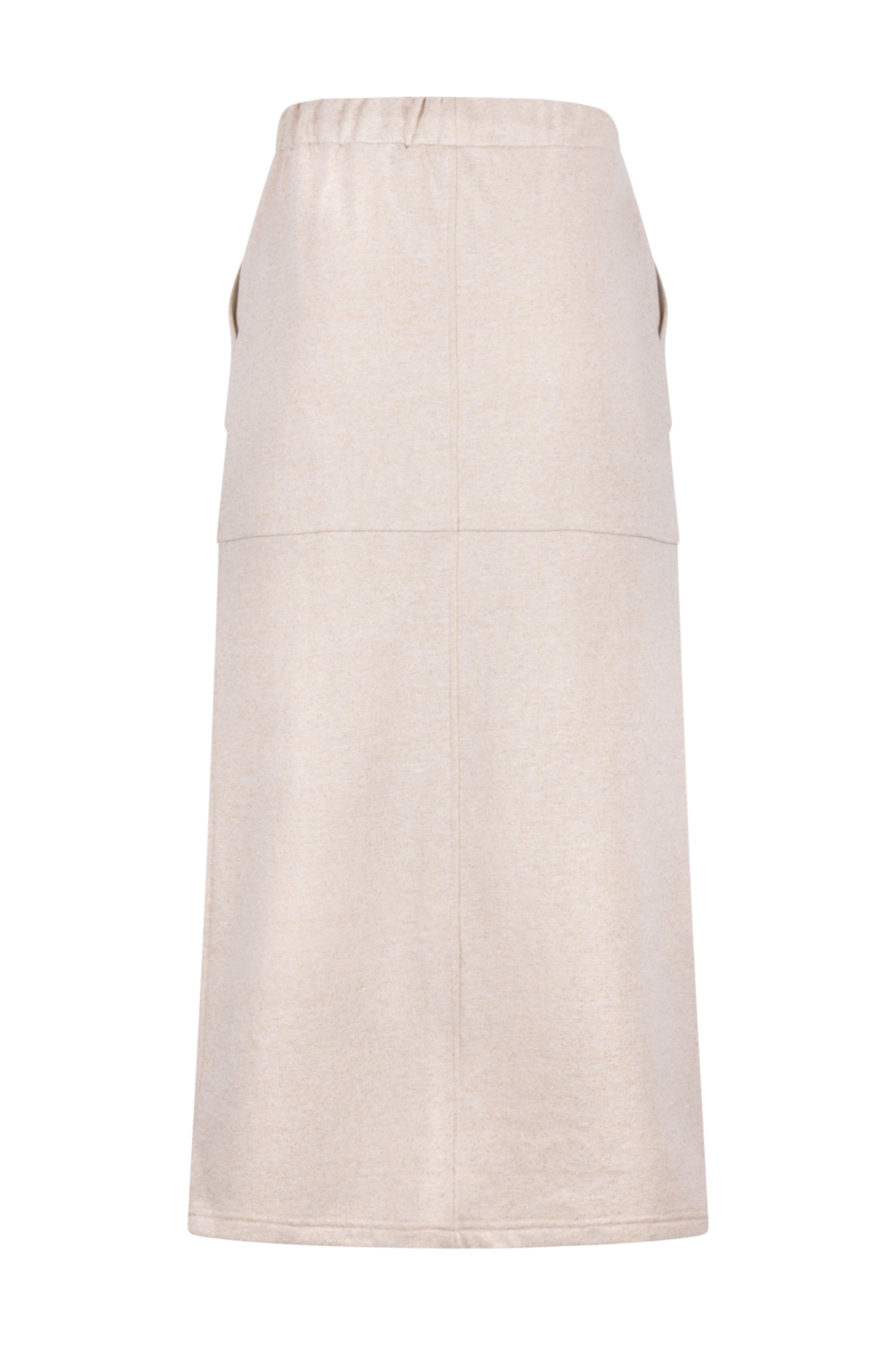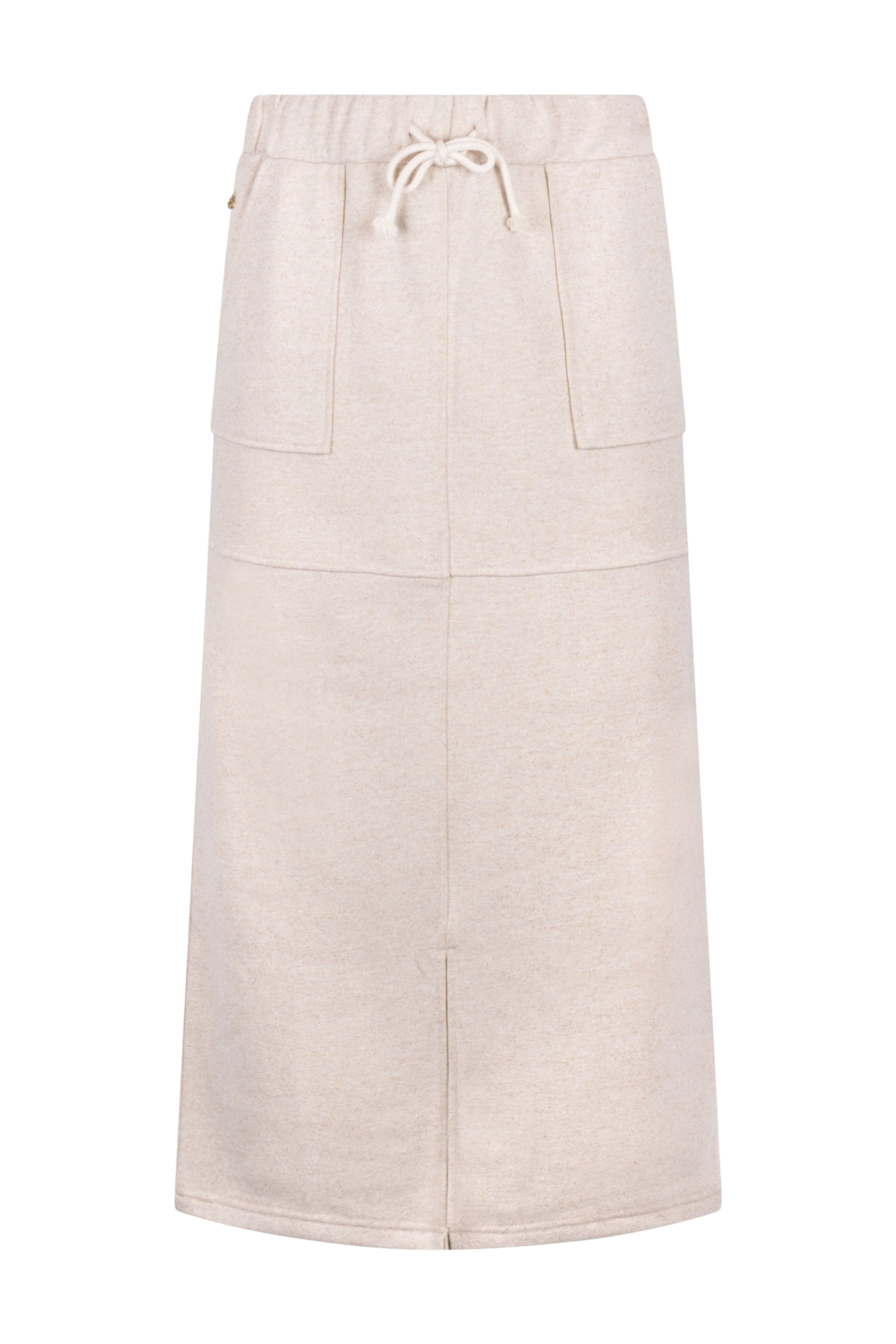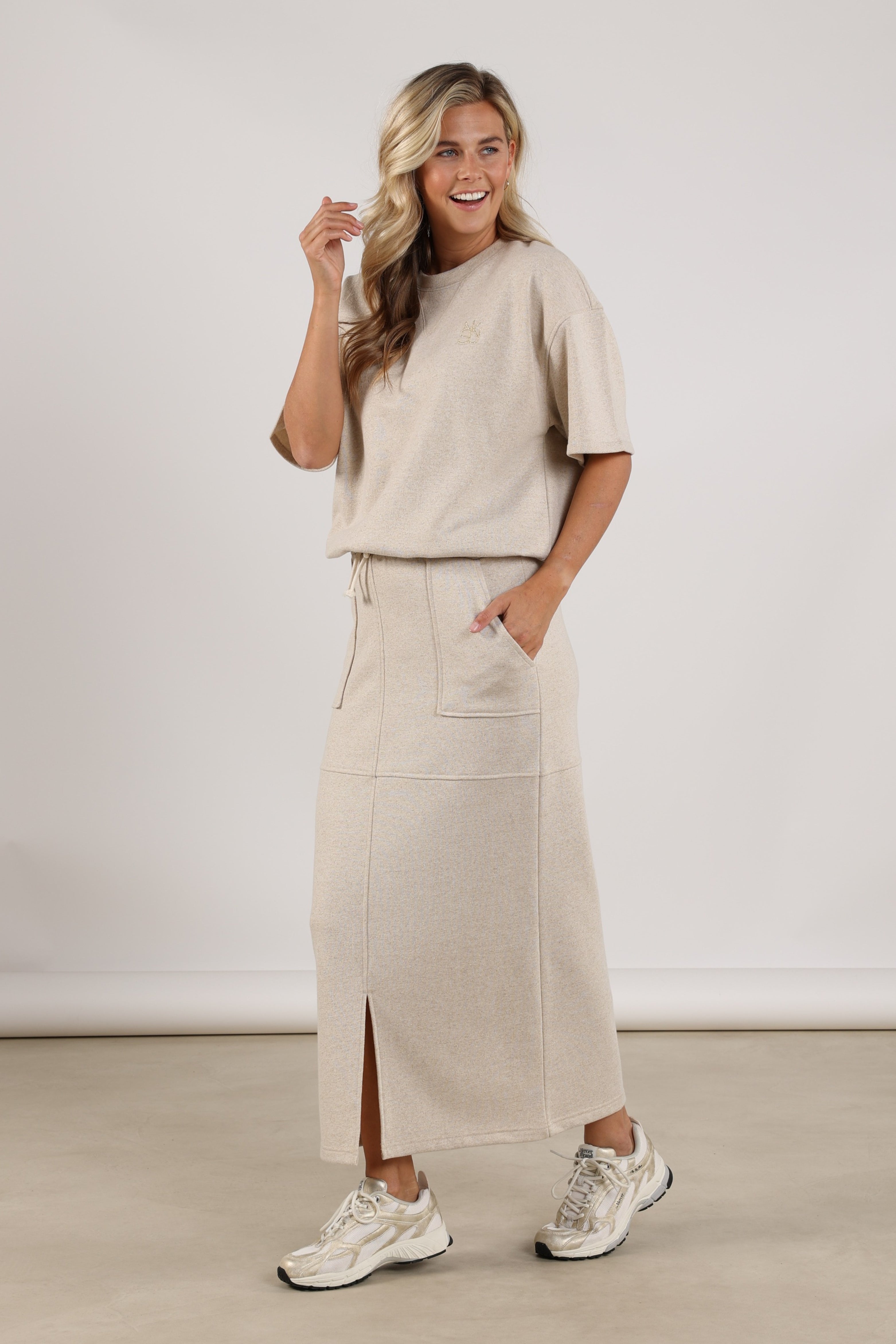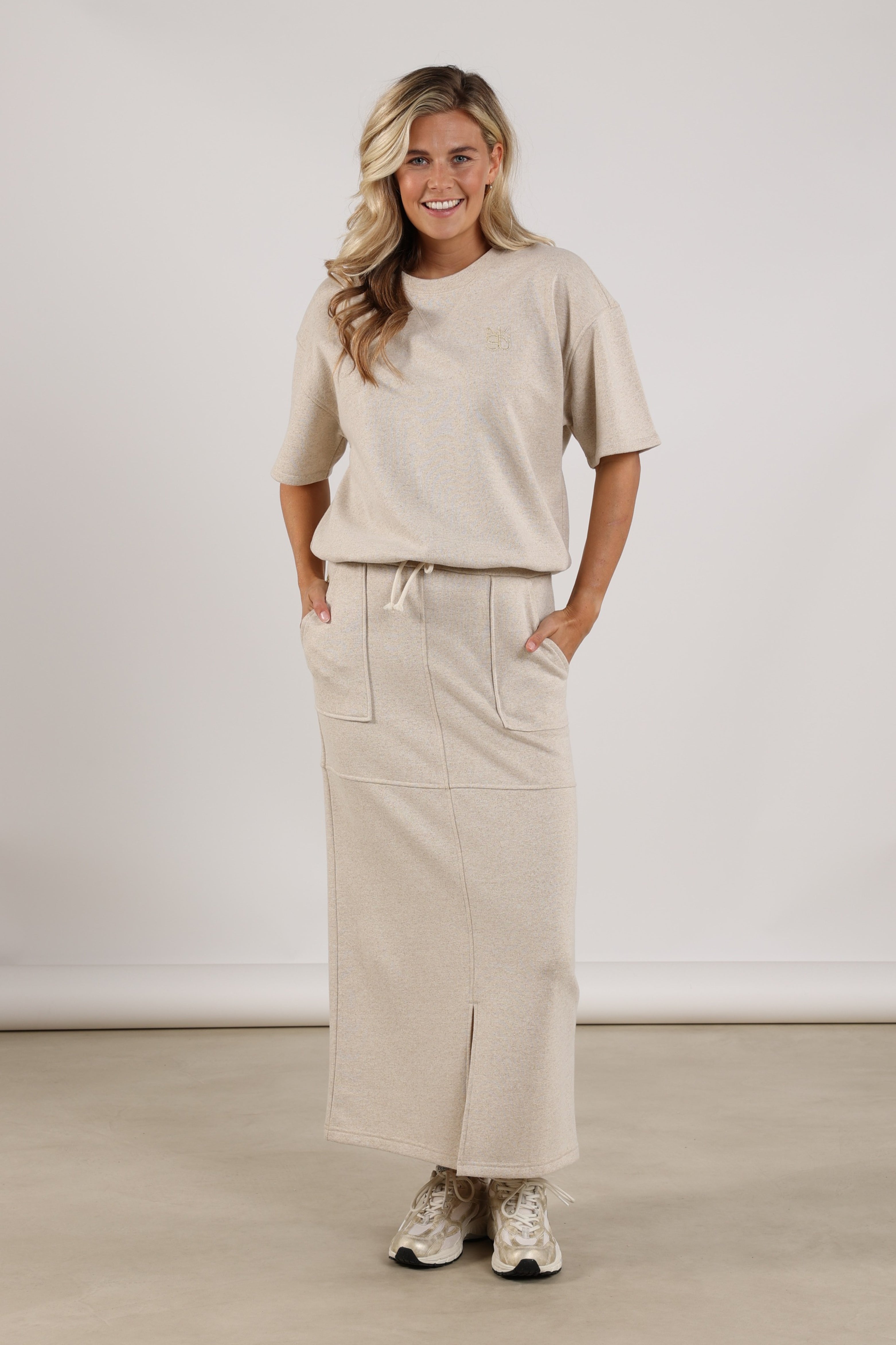 De Rok Maartje Lurex Sand van Nukus is een comfortabele maxi-rok met subtiele lurex glans. Voorzien van elastische taille met koord, steekzakken en split voor. Mooi te combineren als set.