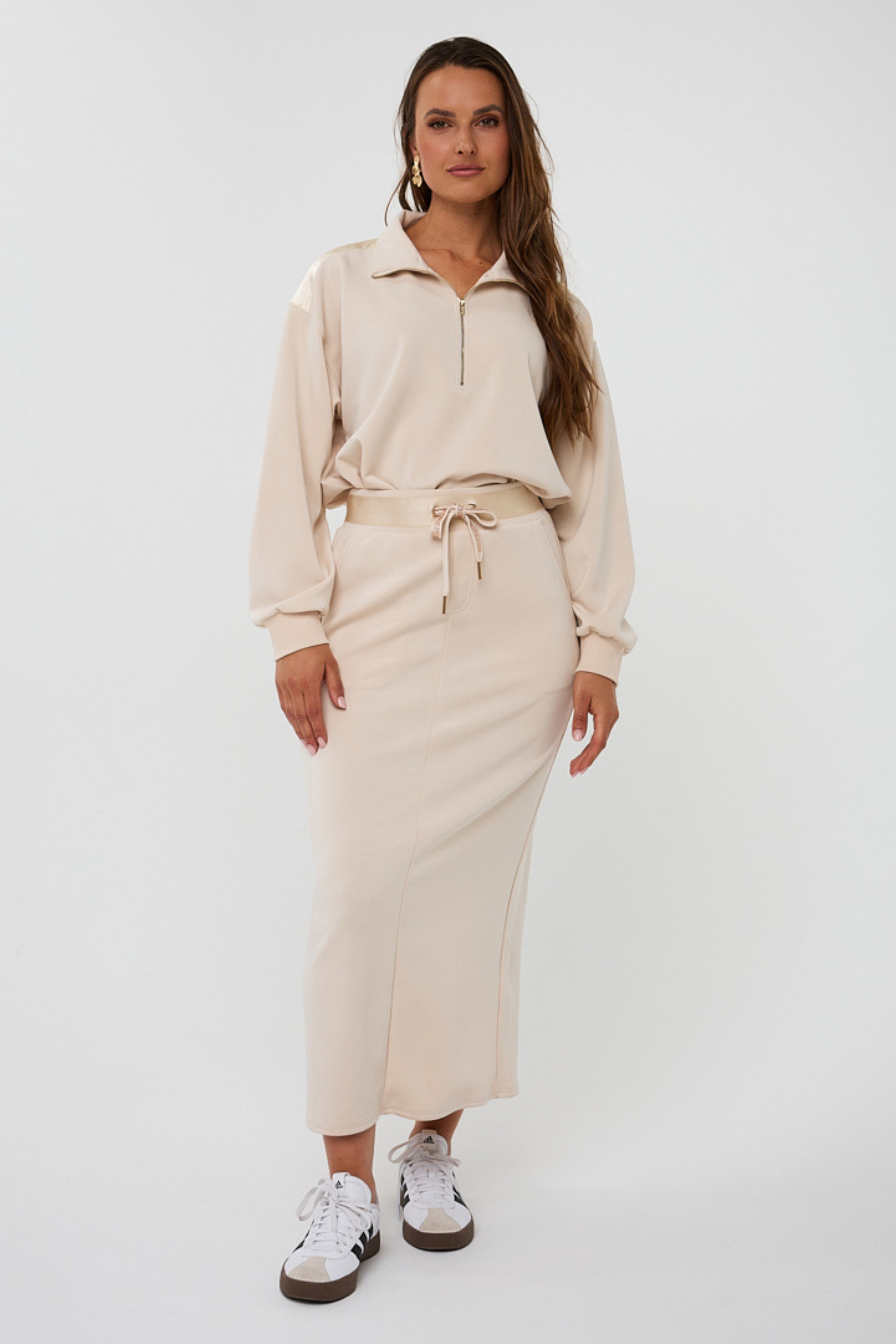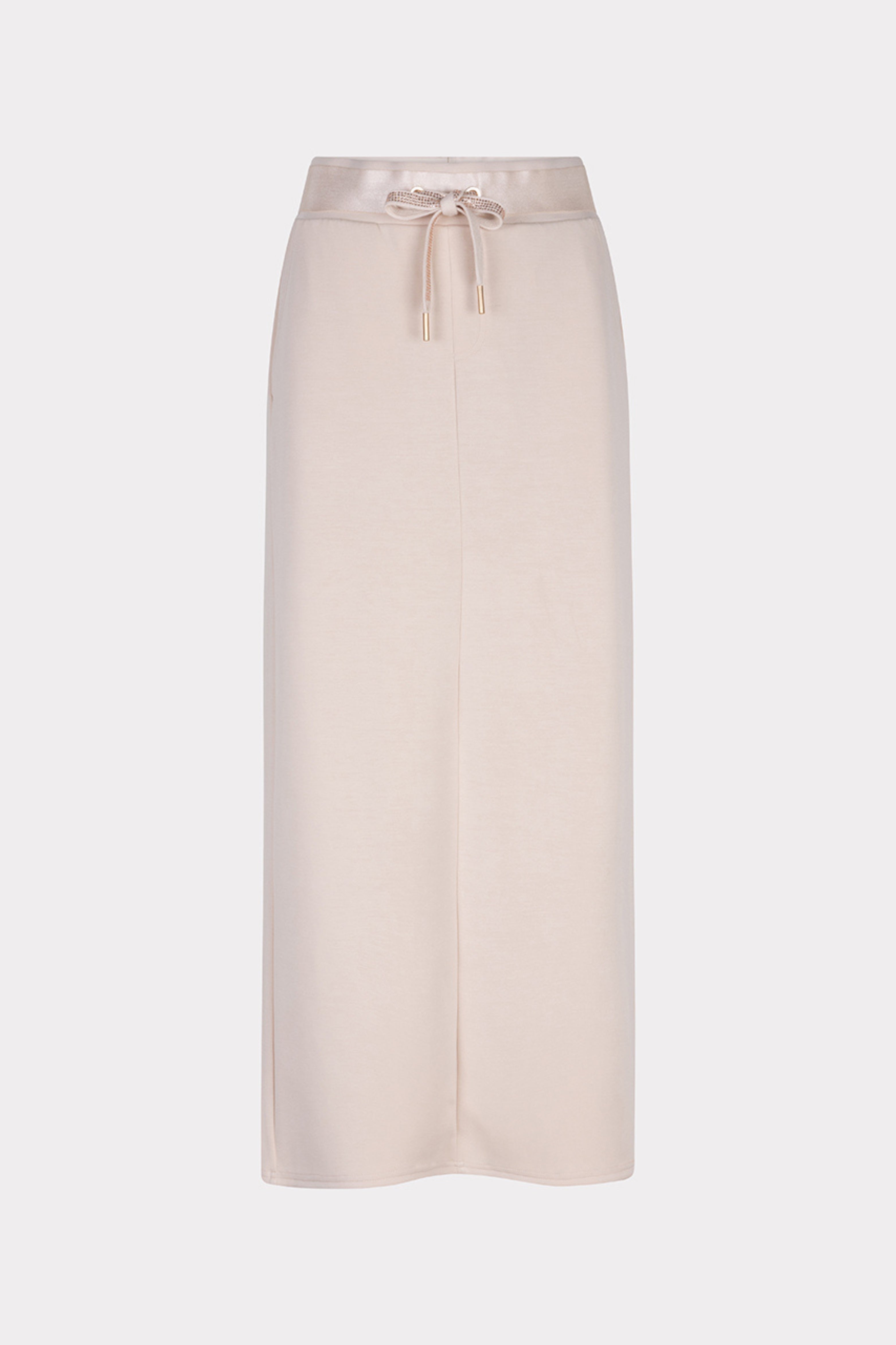 Elegantie en comfort komen samen in deze natuurlijke midi-rok. De soepele stof en elastische taille met glanzend koord zorgen voor een vrouwelijke, relaxte look. Perfect voor stijlvolle dagen of comfy chique avonden.