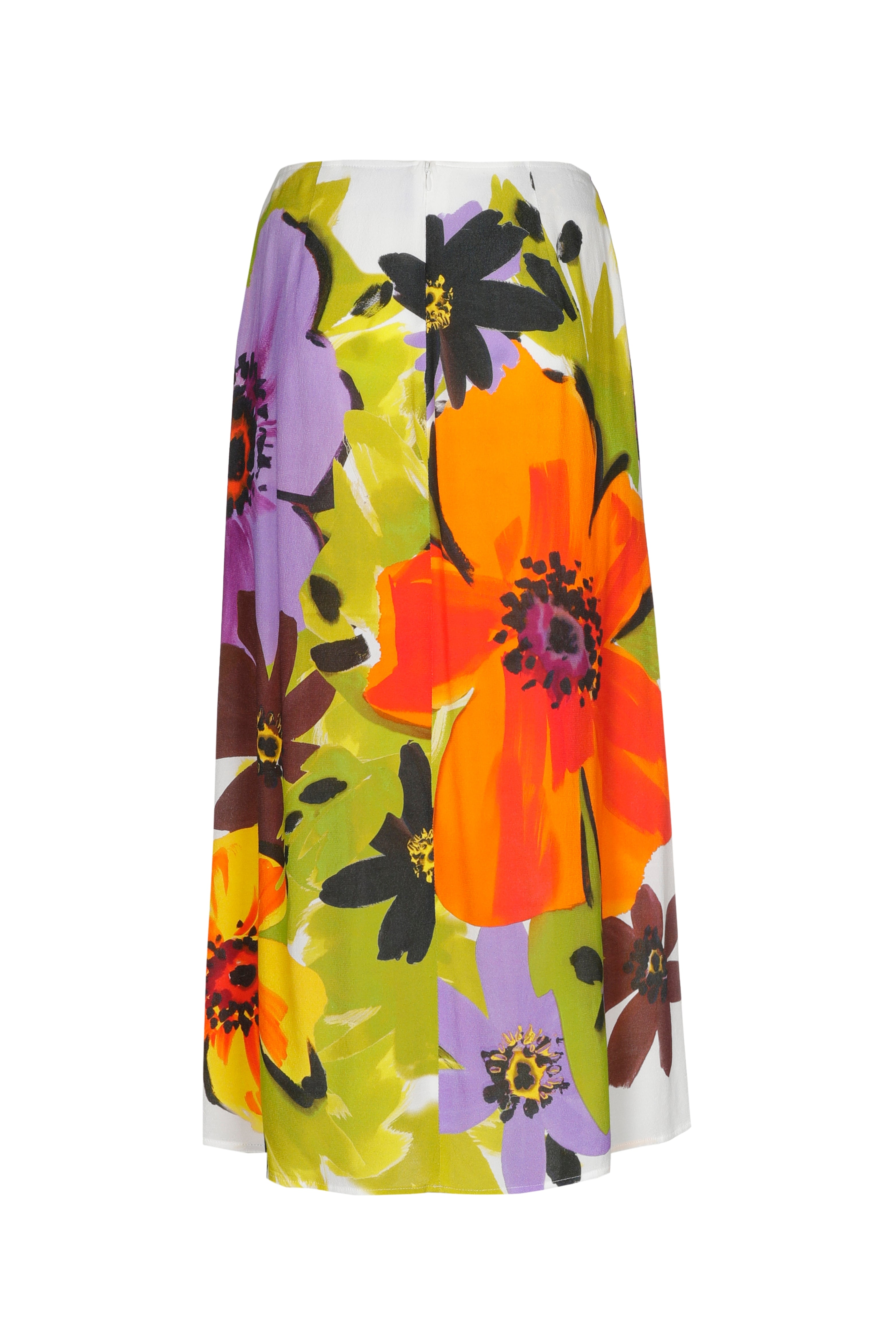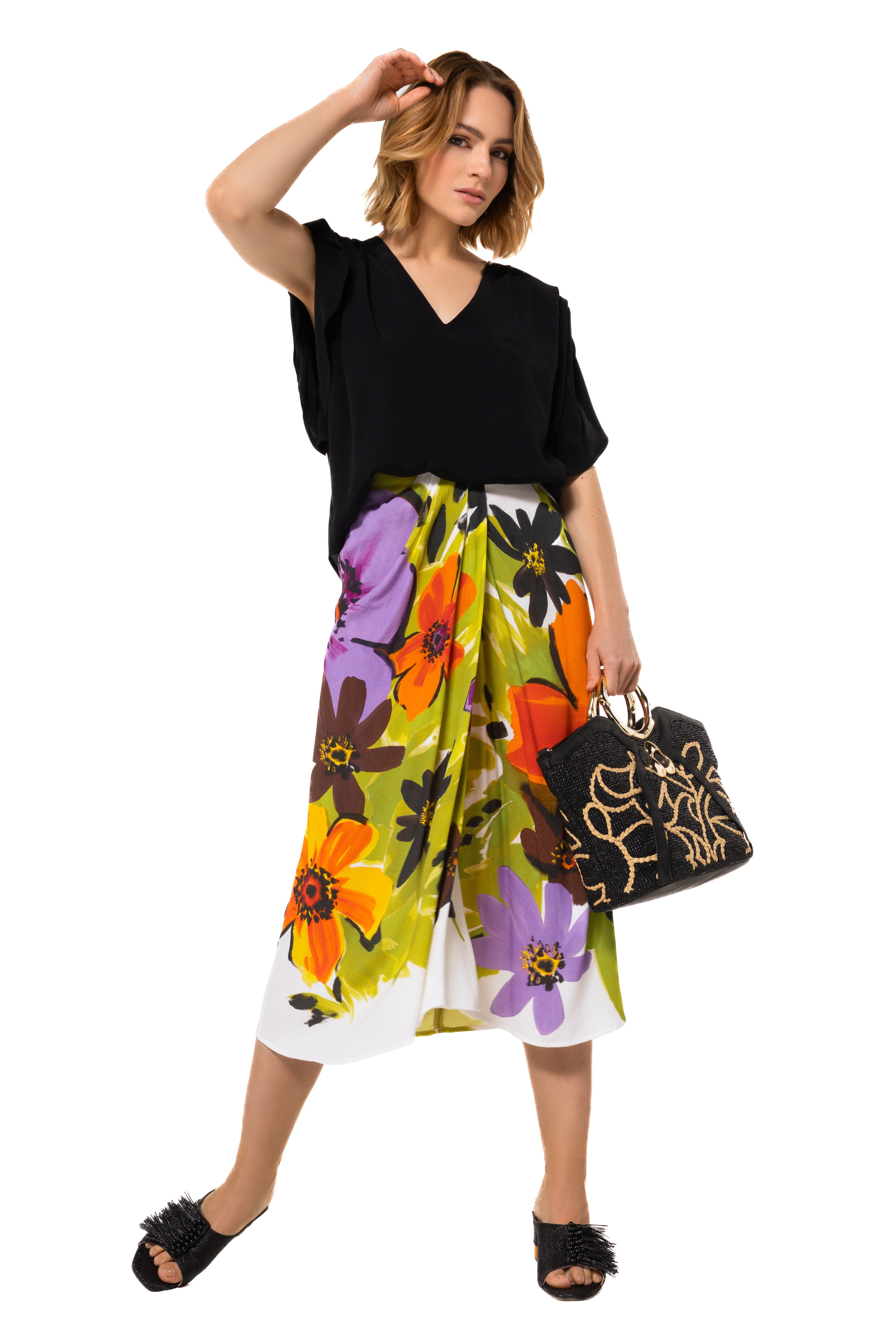 De Rok Midi Multi Color van Caroline Biss is een vrouwelijke midi-rok met zwierige A-lijn. De kleurrijke bloemenprint en de speelse asymmetrische overslag geven elke zomerse look een opvallend en elegant accent.