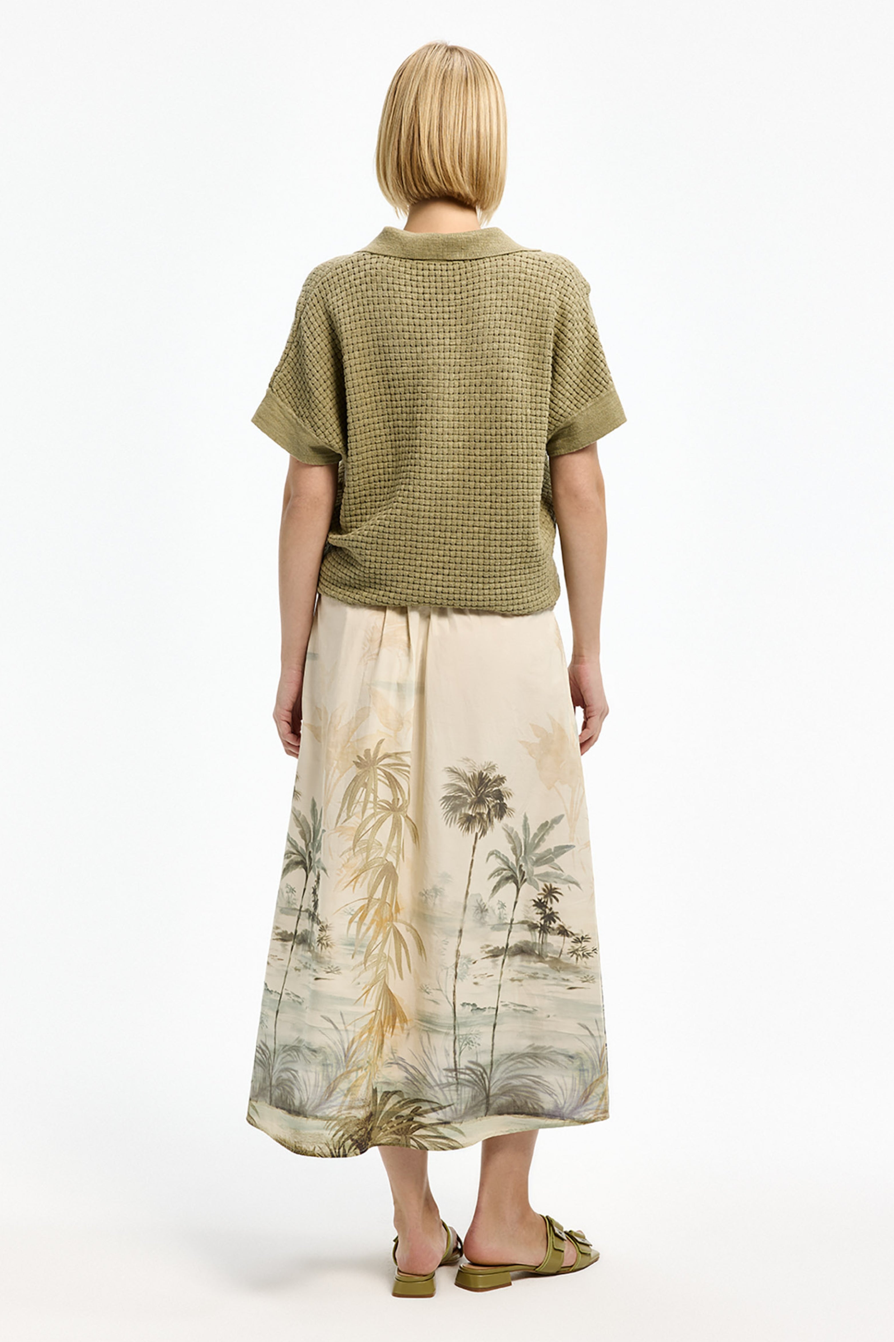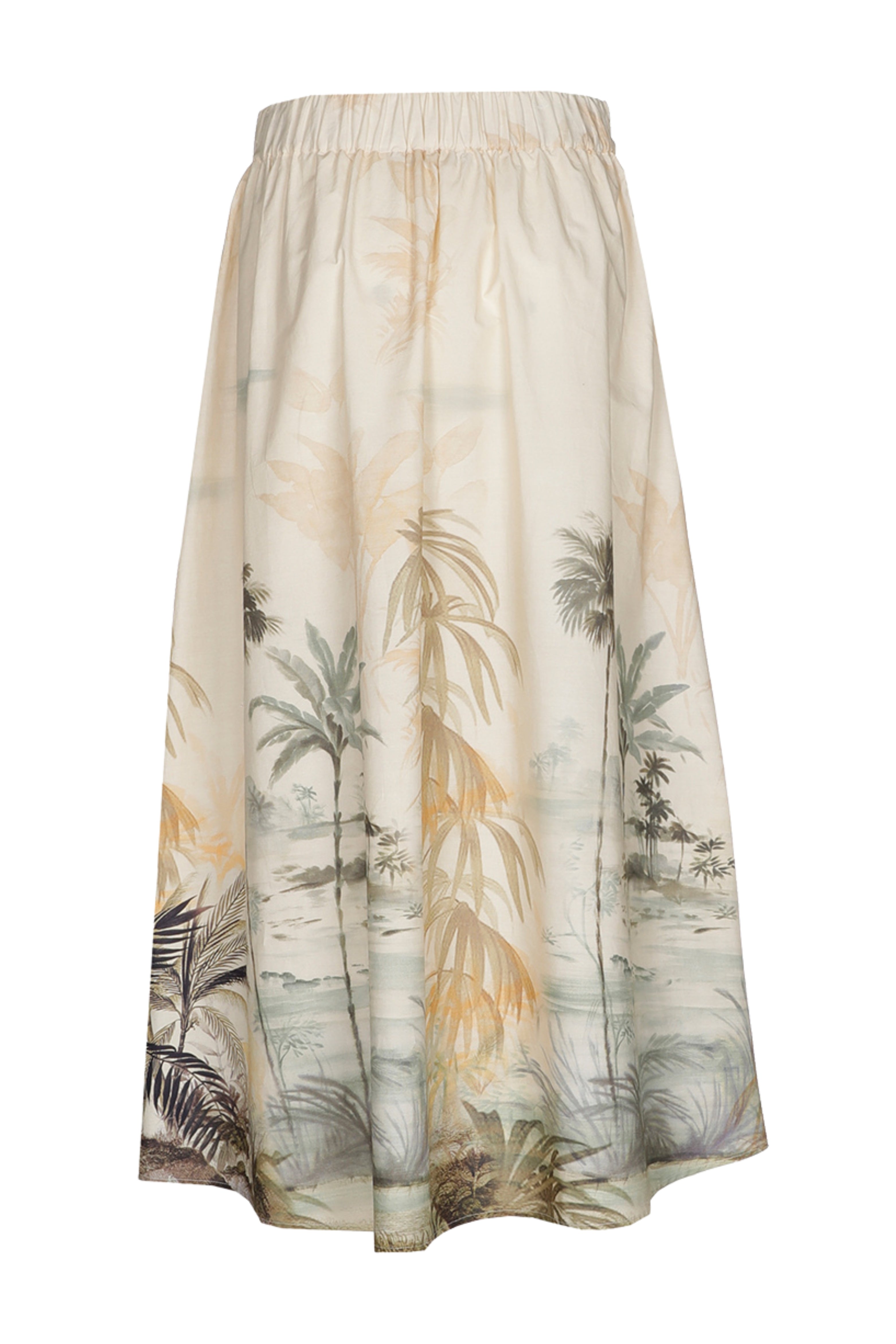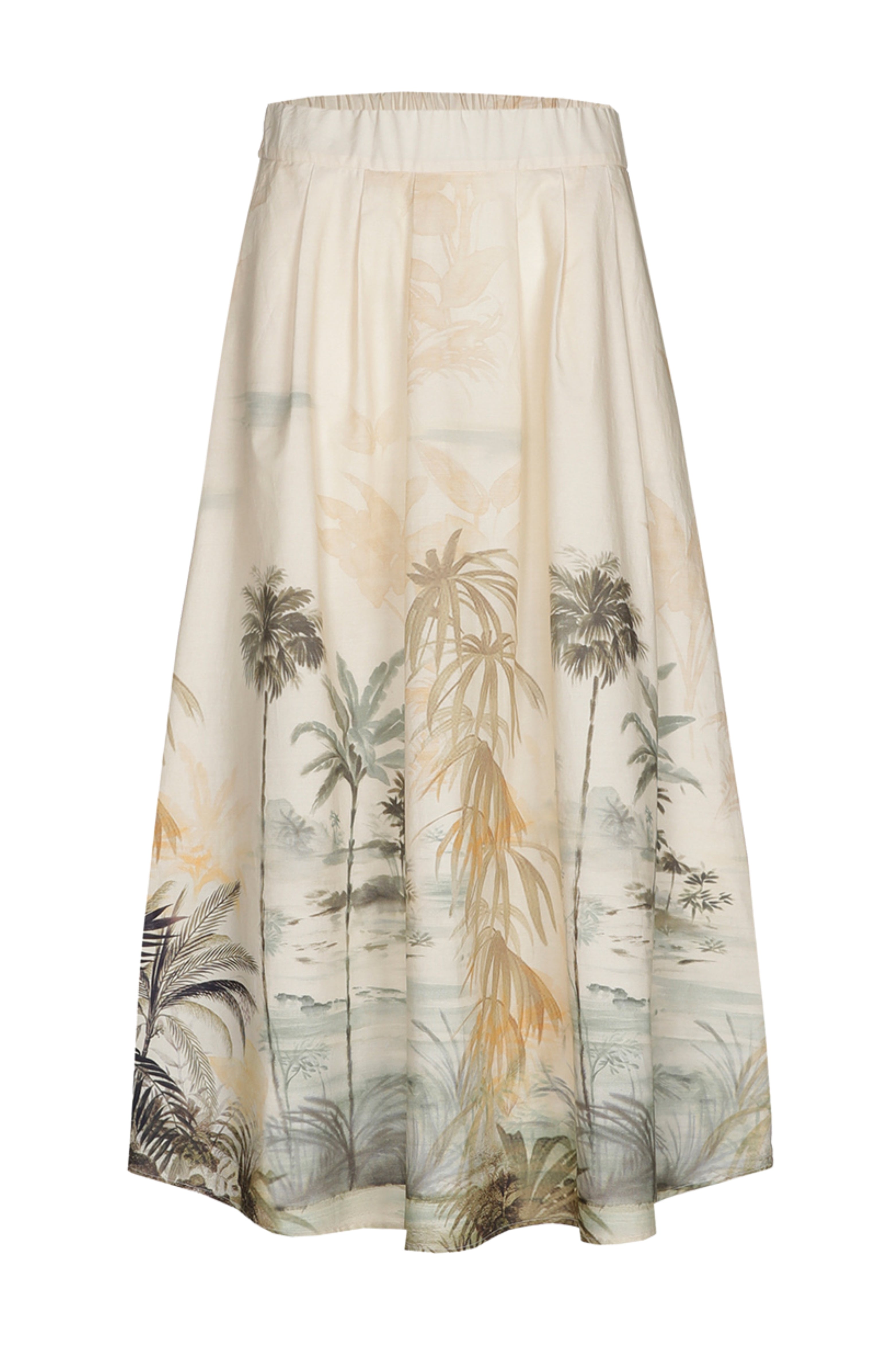 De Rok Rolo Misty Aqua van Xandres is een elegante, zwierige rok met elastische taille. De soepele stof en tropische palmprint geven een luchtige, zomerse look. Perfect voor vakantie, citytrips en zomerse gelegenheden.
