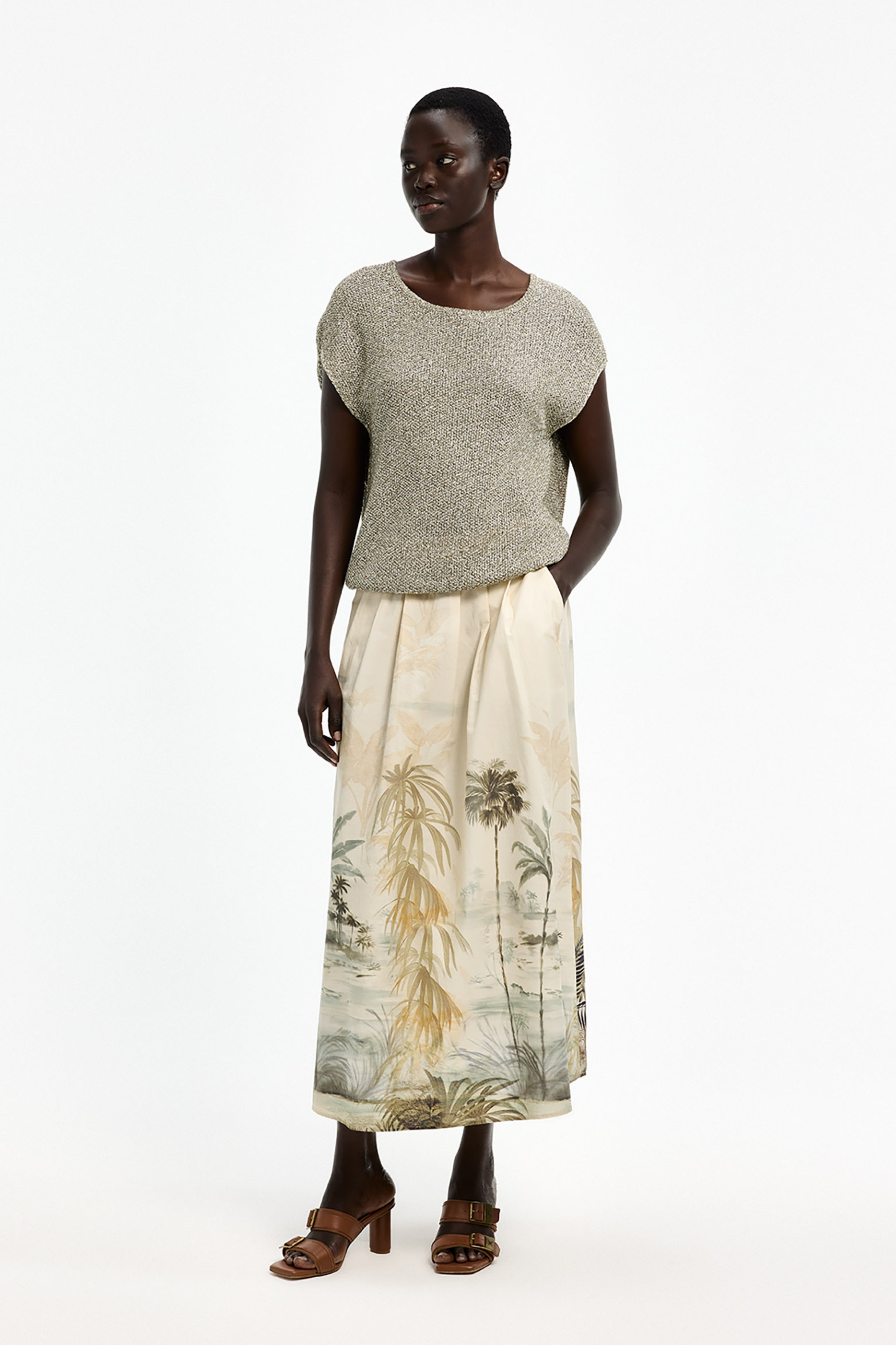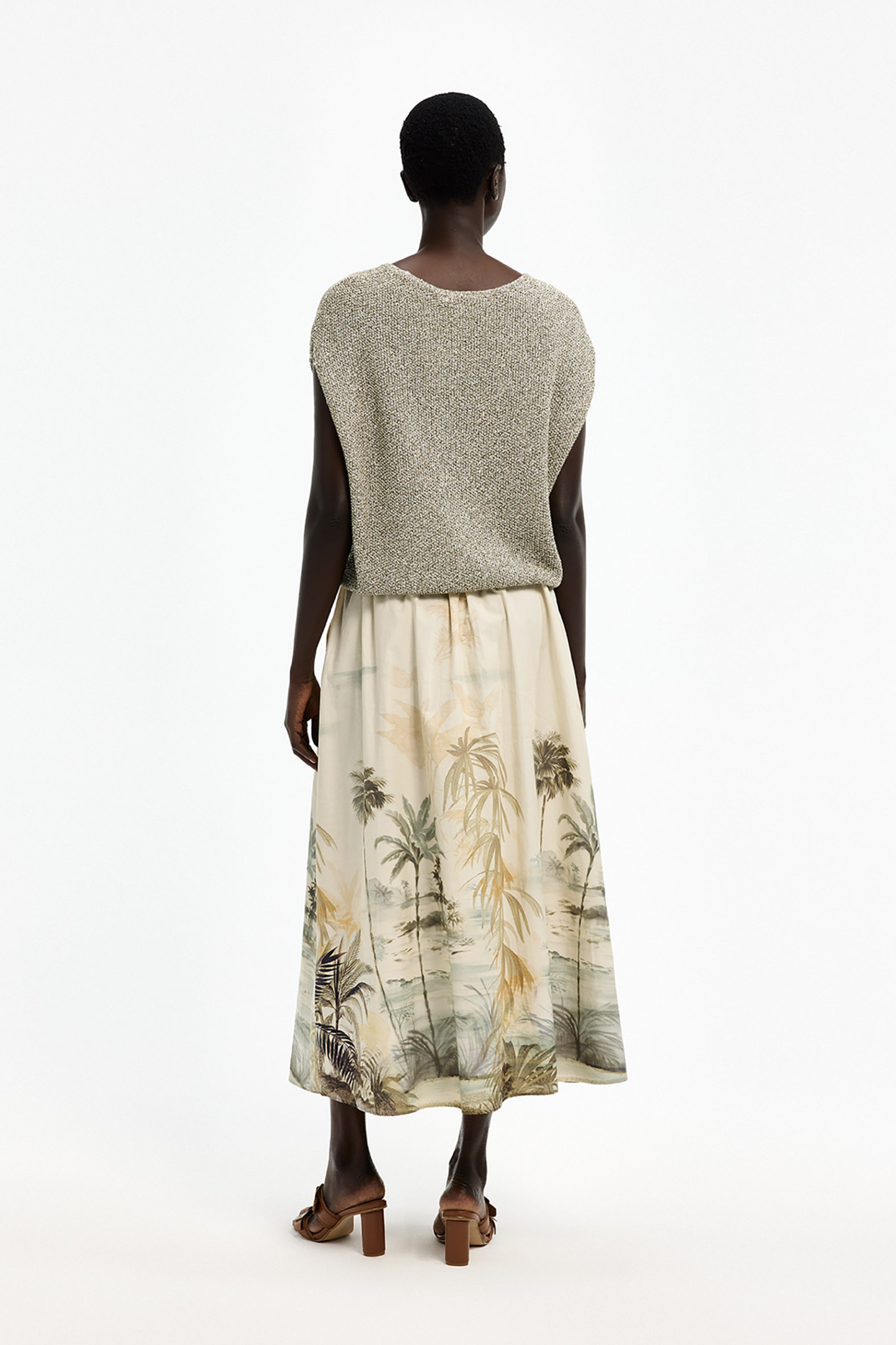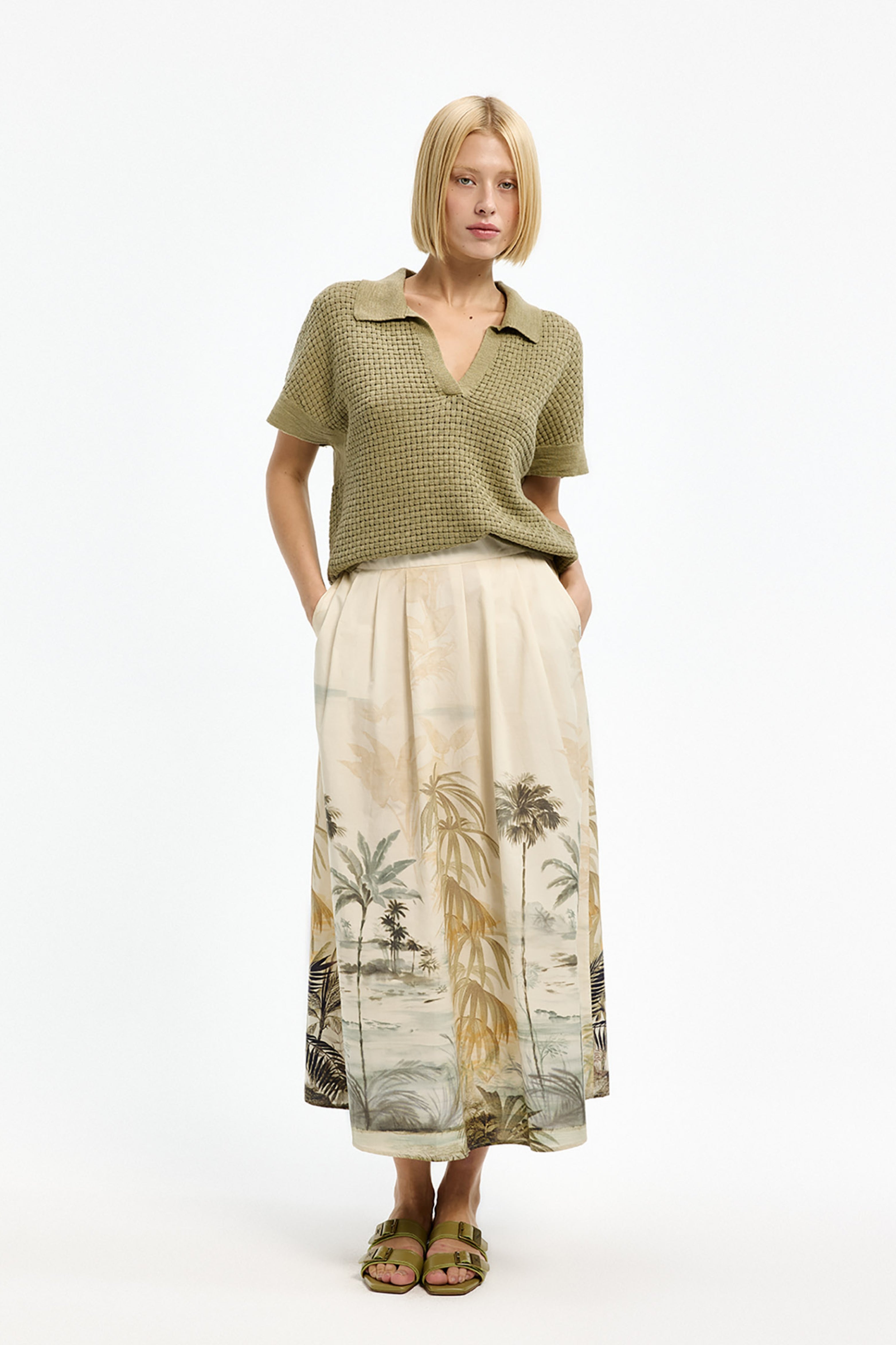 De Rok Rolo Misty Aqua van Xandres is een elegante, zwierige rok met elastische taille. De soepele stof en tropische palmprint geven een luchtige, zomerse look. Perfect voor vakantie, citytrips en zomerse gelegenheden.