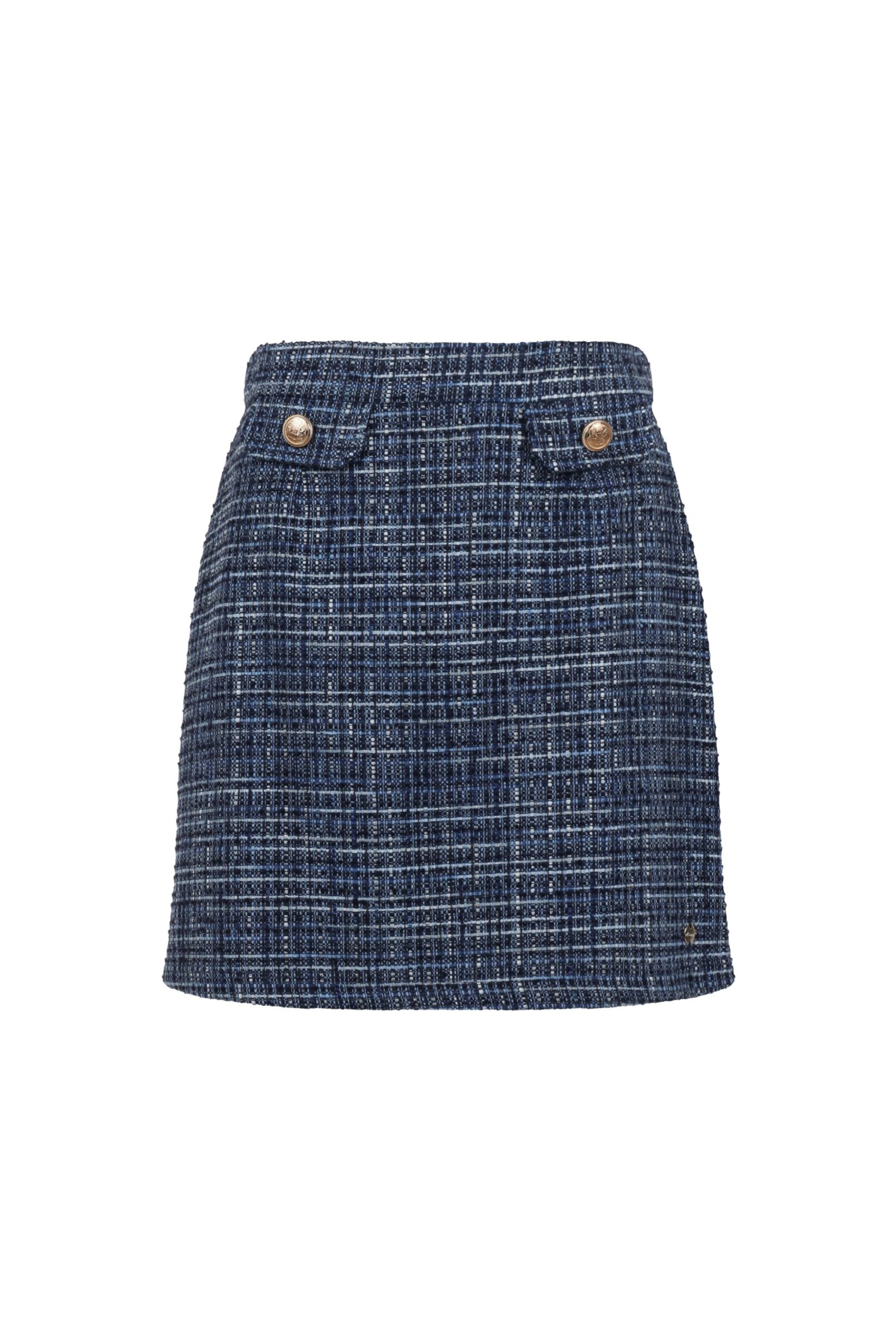 De Rok Romee Blue Bouclé van Elvira is een stijlvolle rok met een luxe uitstraling. Uitgevoerd in een prachtige bouclé-stof in blauwtinten, straalt deze rok elegantie en klasse uit. Het recht gesneden model met subtiele A-lijn zorgt voor een vrouwelijke en flatterende pasvorm.