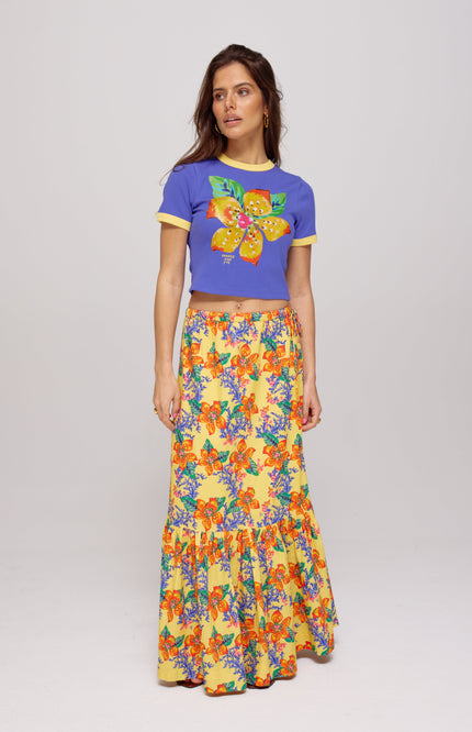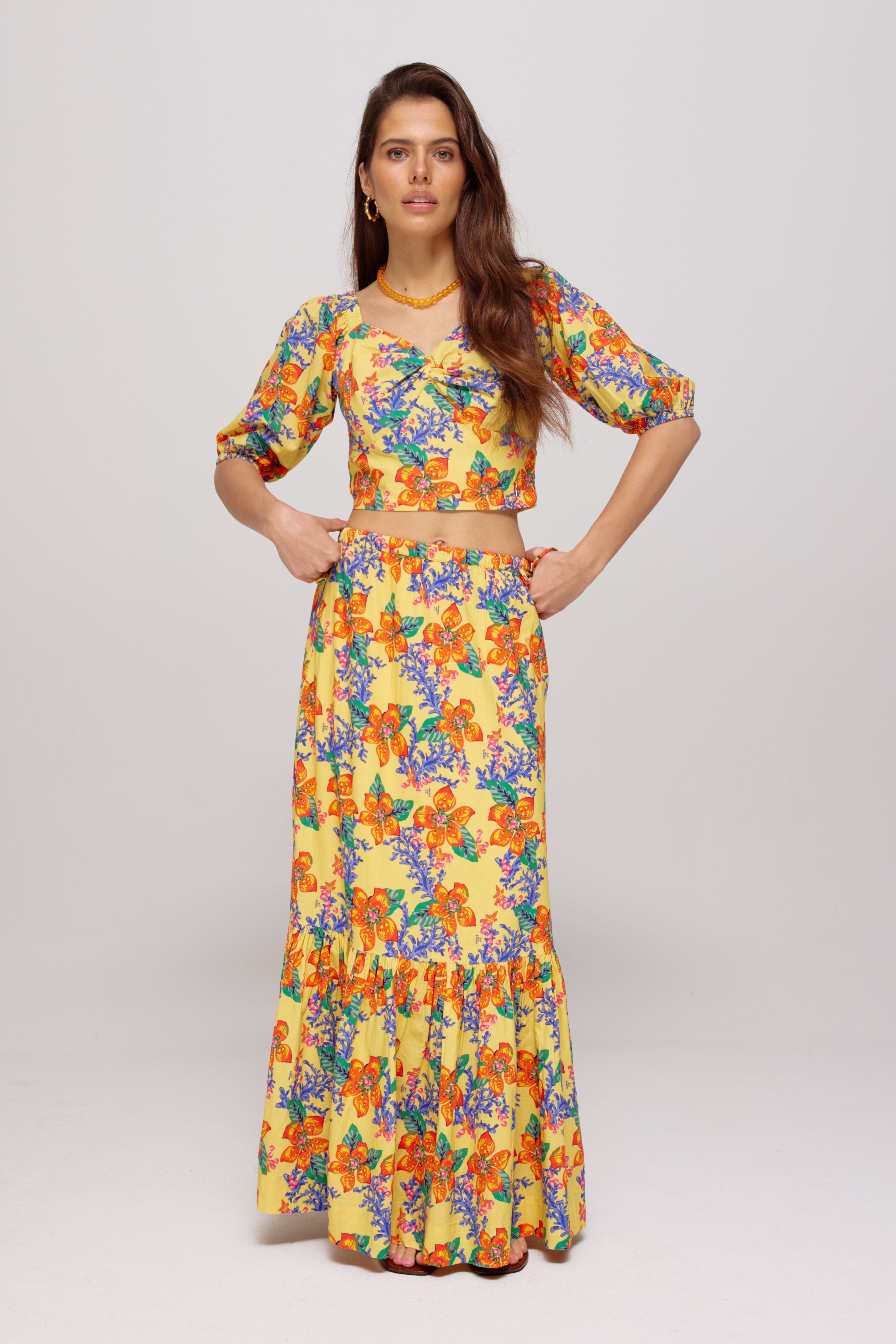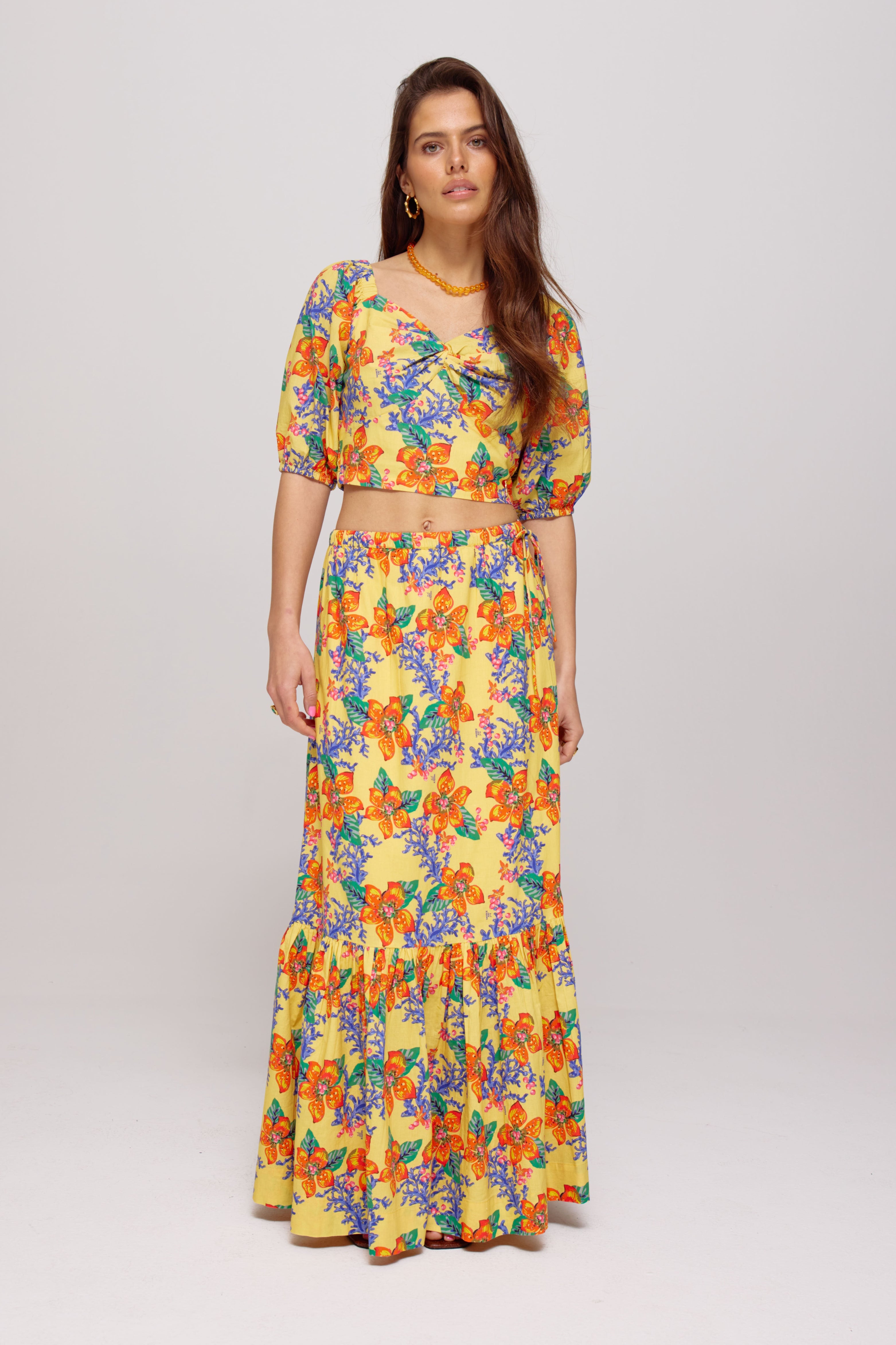 Voeg kleur en vrolijkheid toe aan je garderobe met de Zoey Banana Flower rok van Harper & Yve. Deze lange rok is een echte blikvanger dankzij de levendige bloemenprint in warme oranjetinten en frisse groentinten op een zomers gele ondergrond.