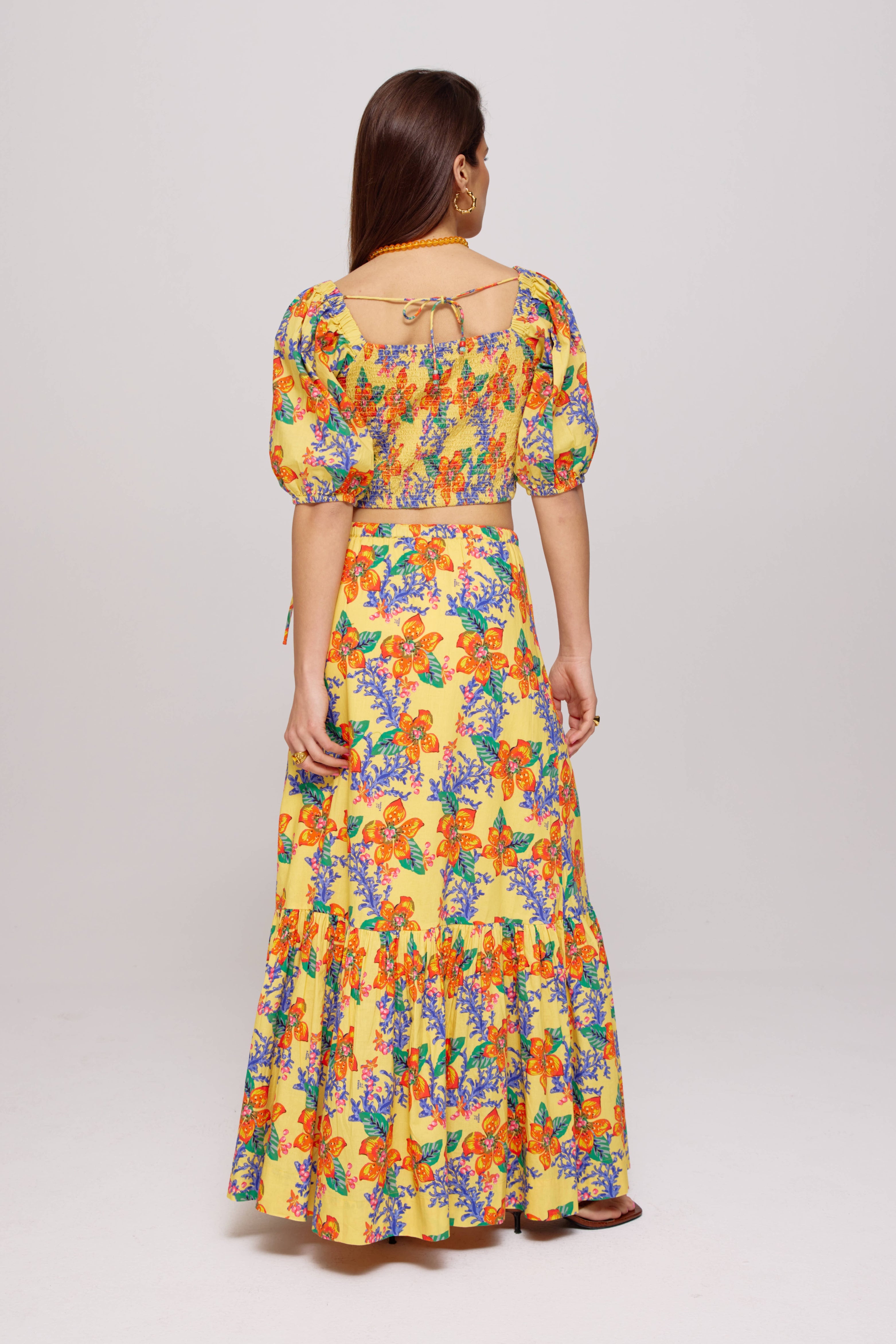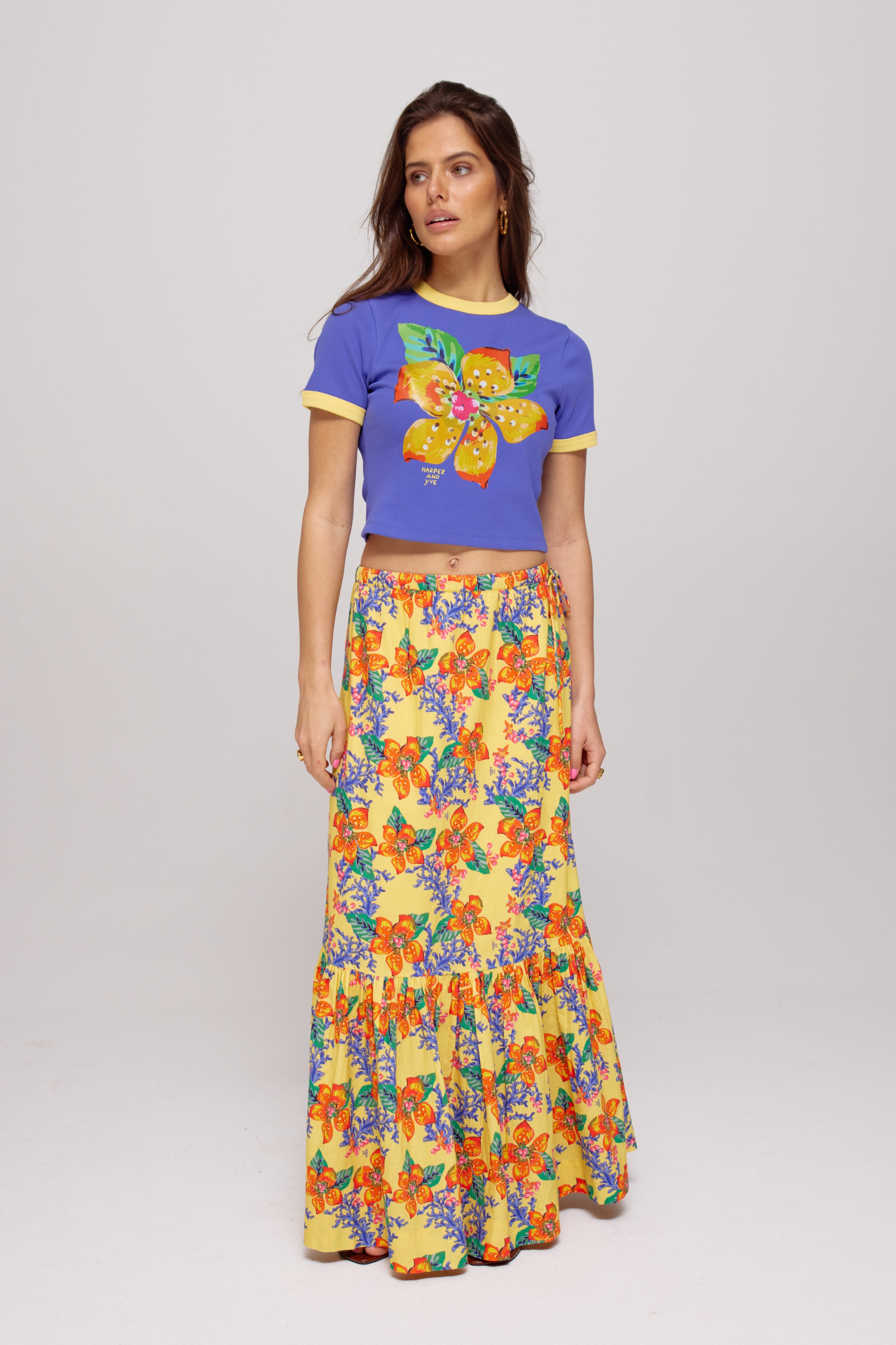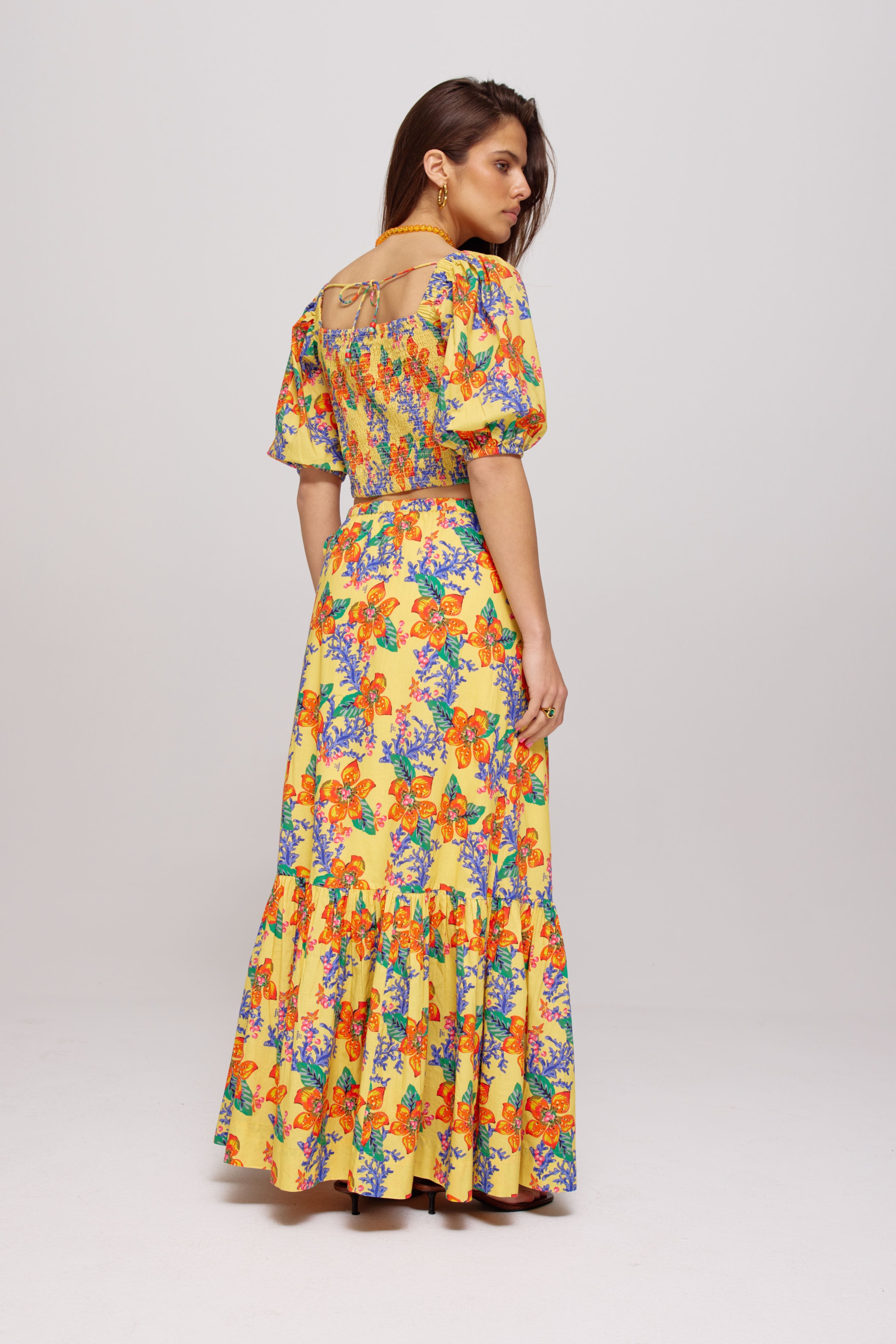 Voeg kleur en vrolijkheid toe aan je garderobe met de Zoey Banana Flower rok van Harper & Yve. Deze lange rok is een echte blikvanger dankzij de levendige bloemenprint in warme oranjetinten en frisse groentinten op een zomers gele ondergrond.