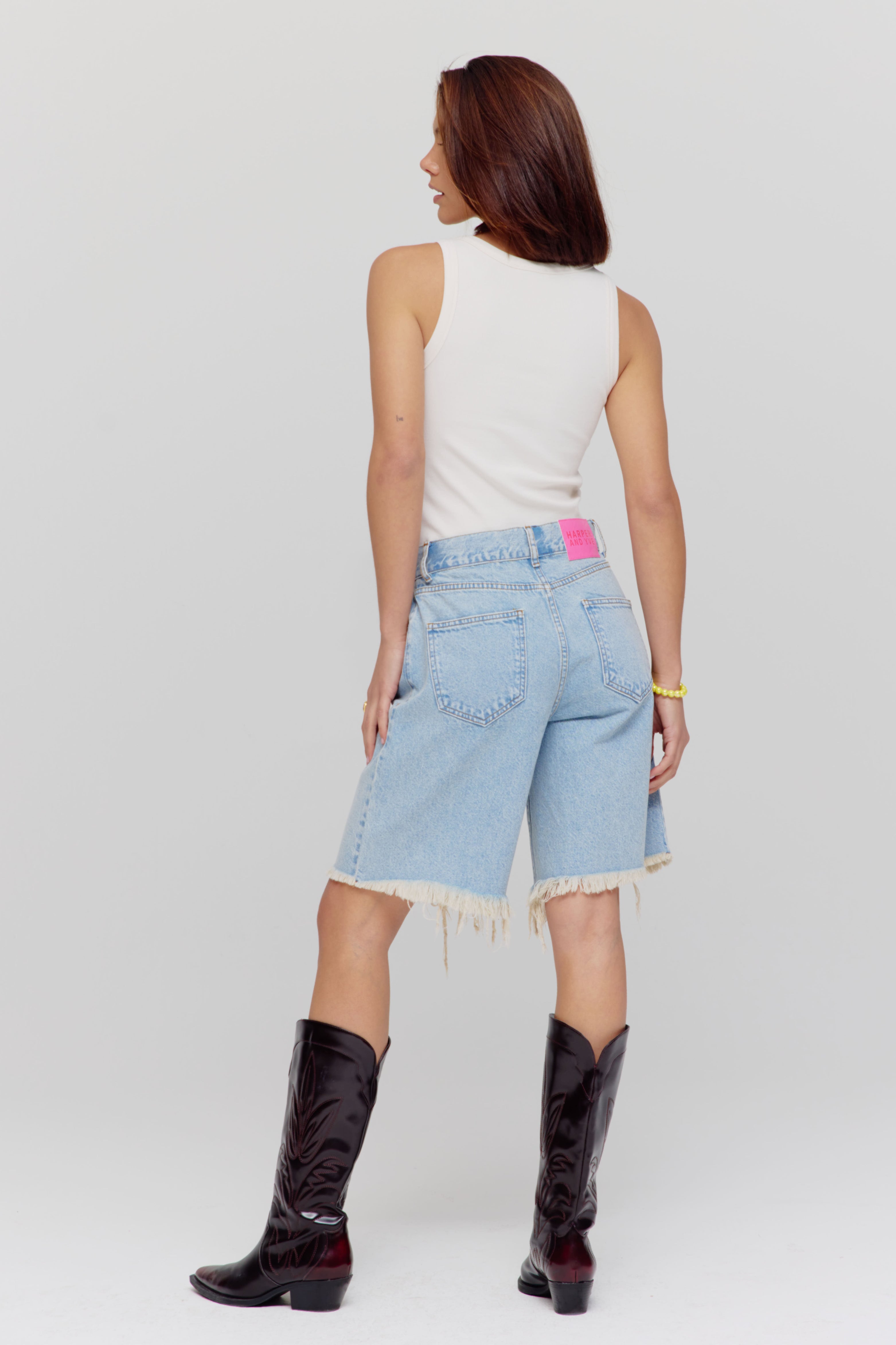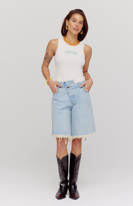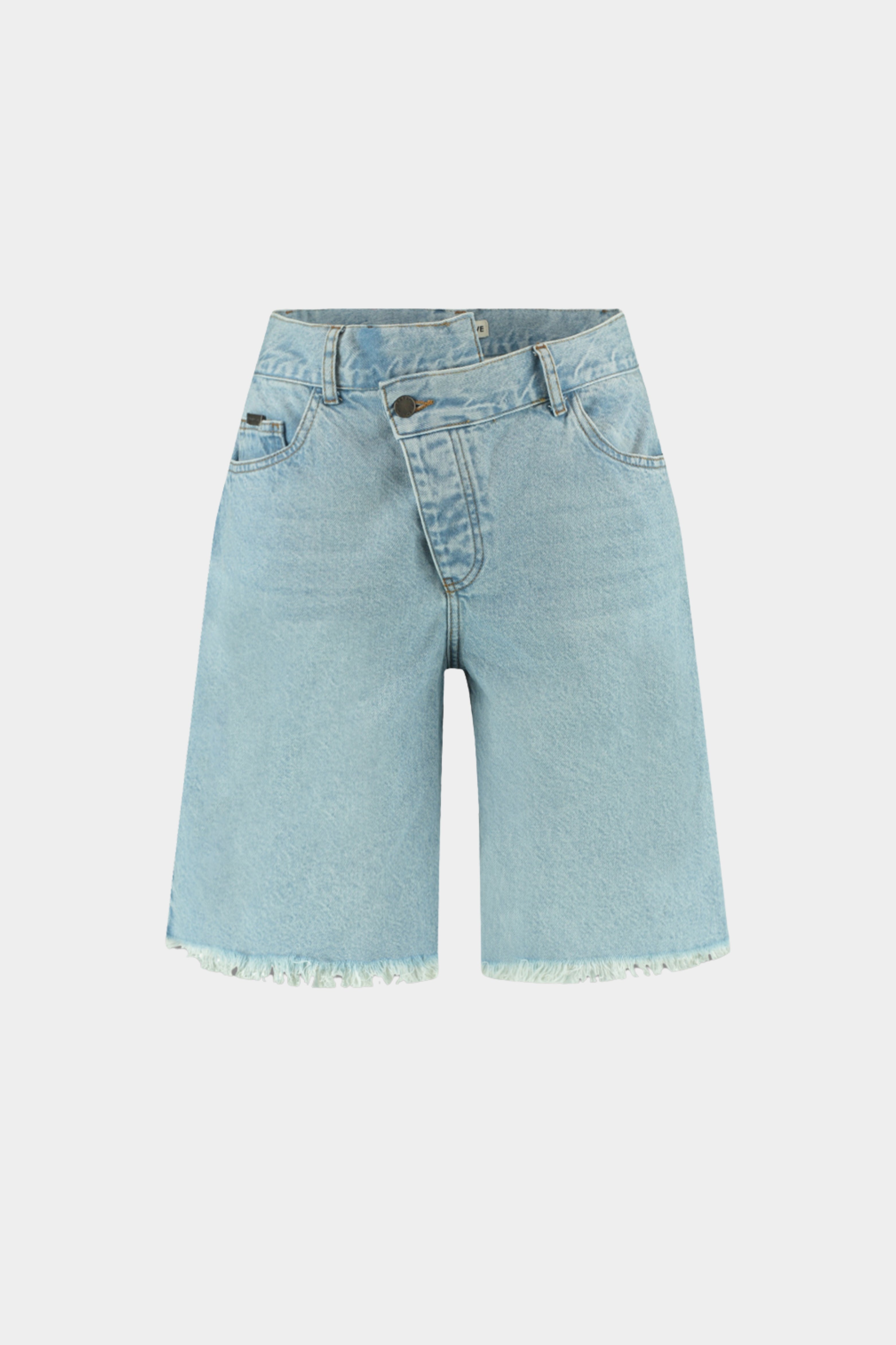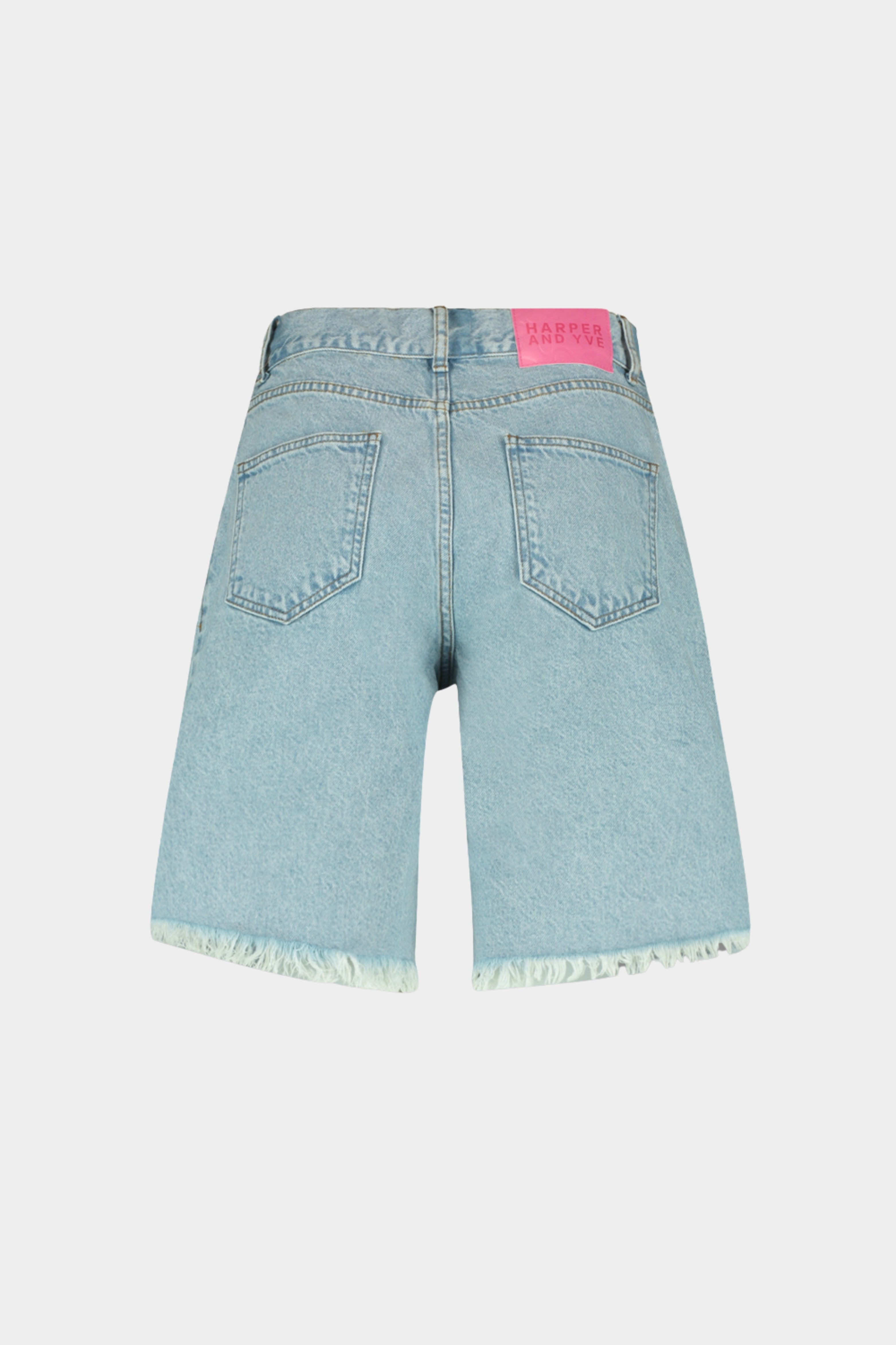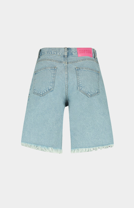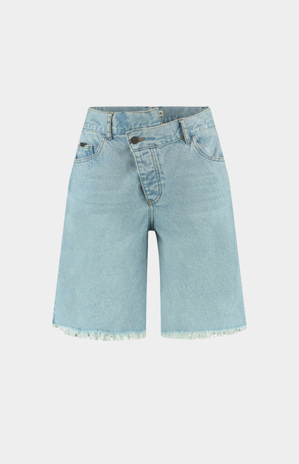 Short Dionne Light Blue van Harper & Yve is een trendy denim korte broek met hoge taille en een opvallende zigzagsluiting aan de voorkant. De rafelzomen en rechte fit geven het item een nonchalante, zomerse look.
