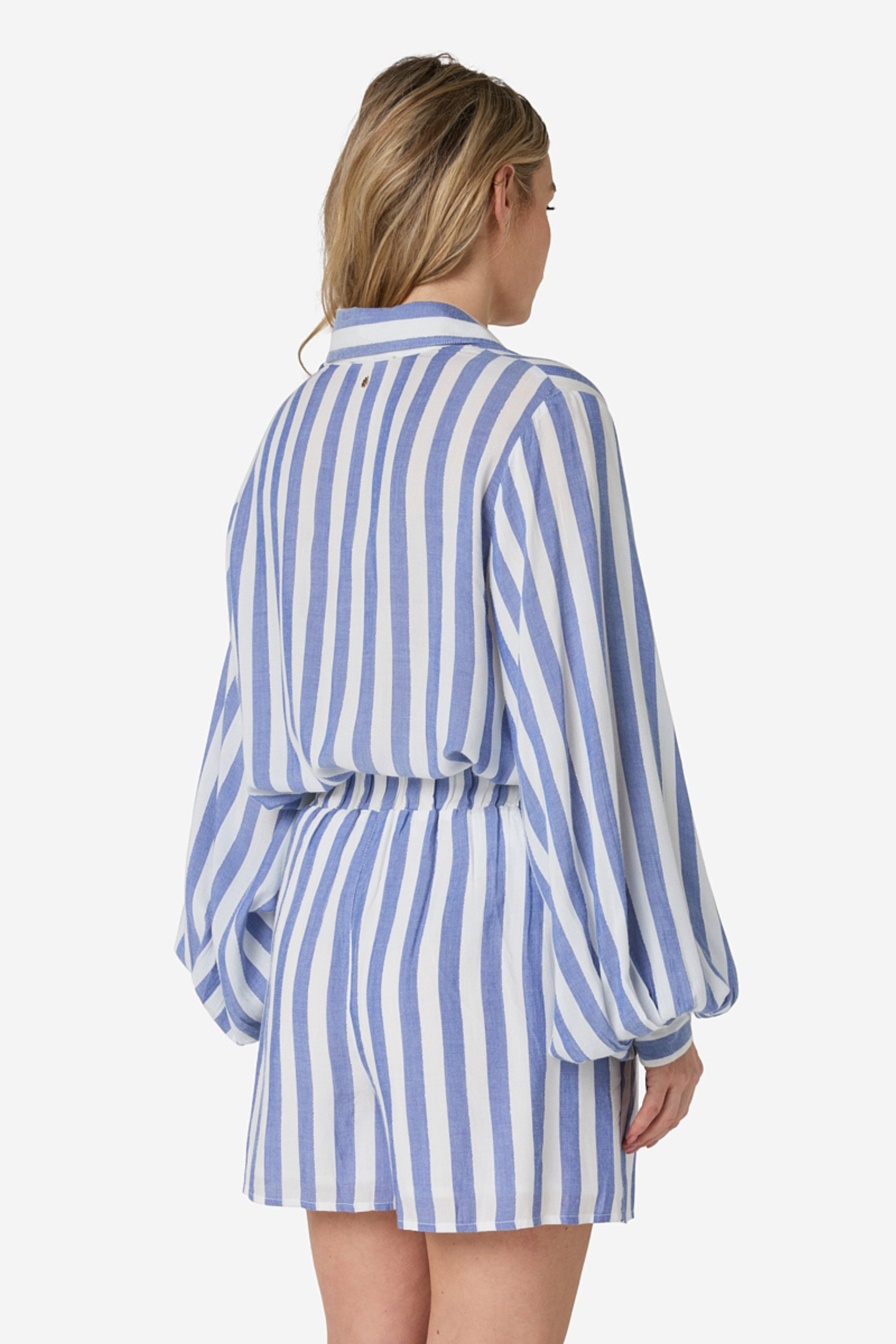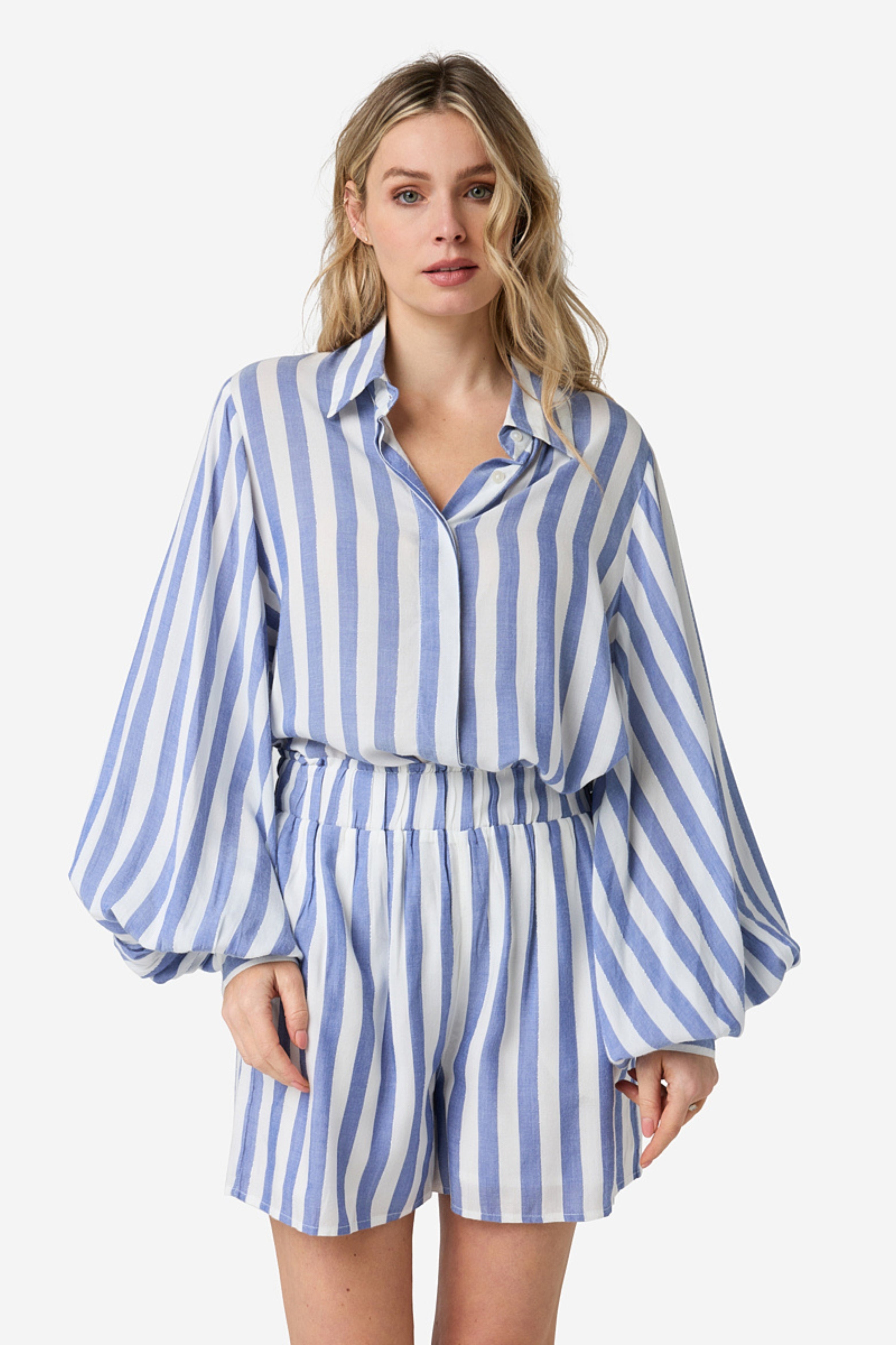 De Short Shalita Raya Blue van Ibana is een luchtige short met een fris blauw-wit streeppatroon. De elastische taille en soepelvallende stof zorgen voor optimaal comfort en een zomerse, casual look.