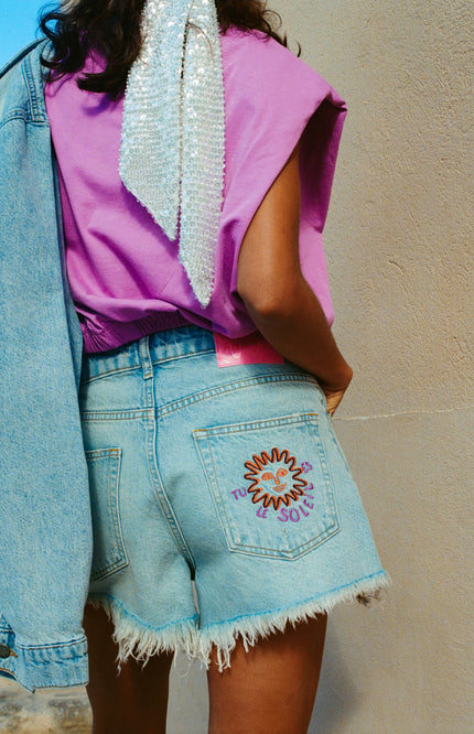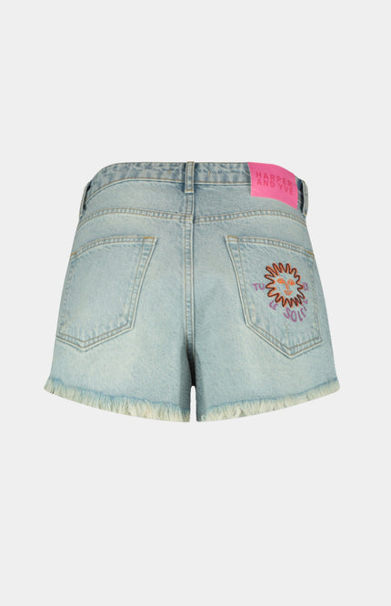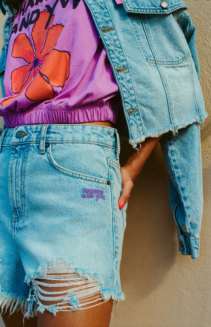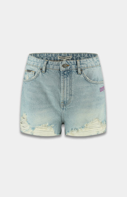 De Short Yve Light Blue van Harper & Yve is de ultieme festival- en zomerfavoriet. De high-waist fit, destroyed details en de speels golvende broekspijp maken dit denim shortje extra edgy en uniek.