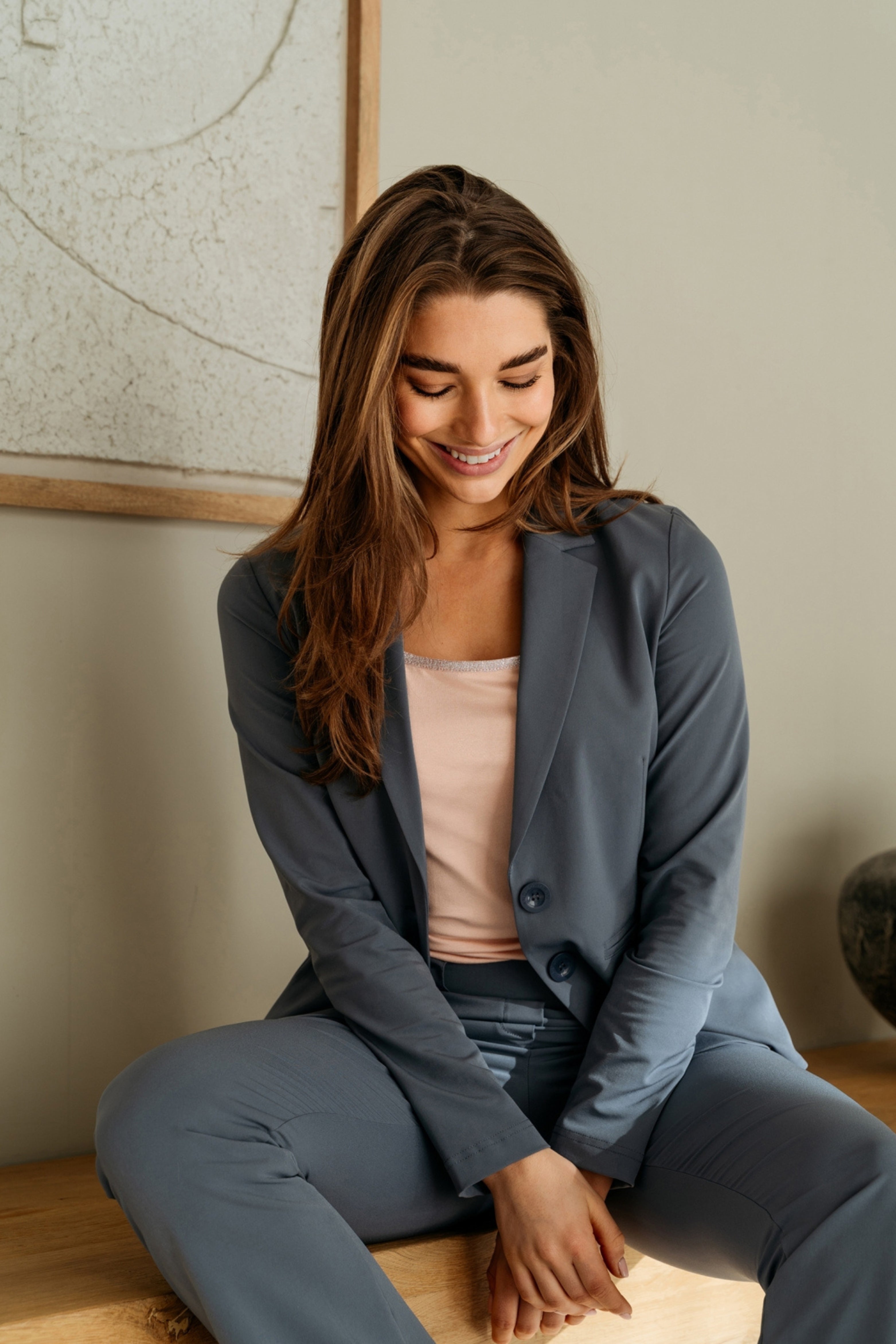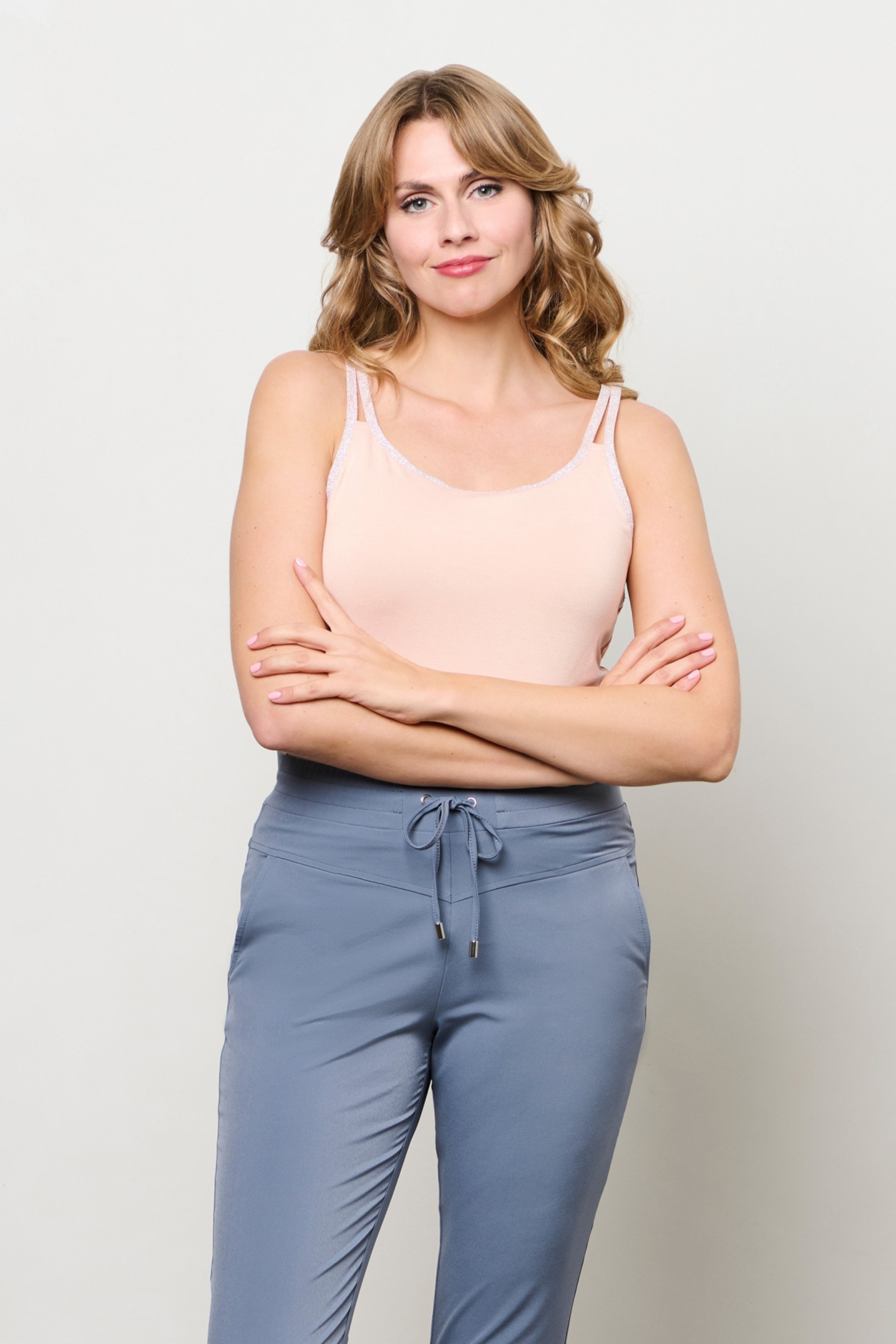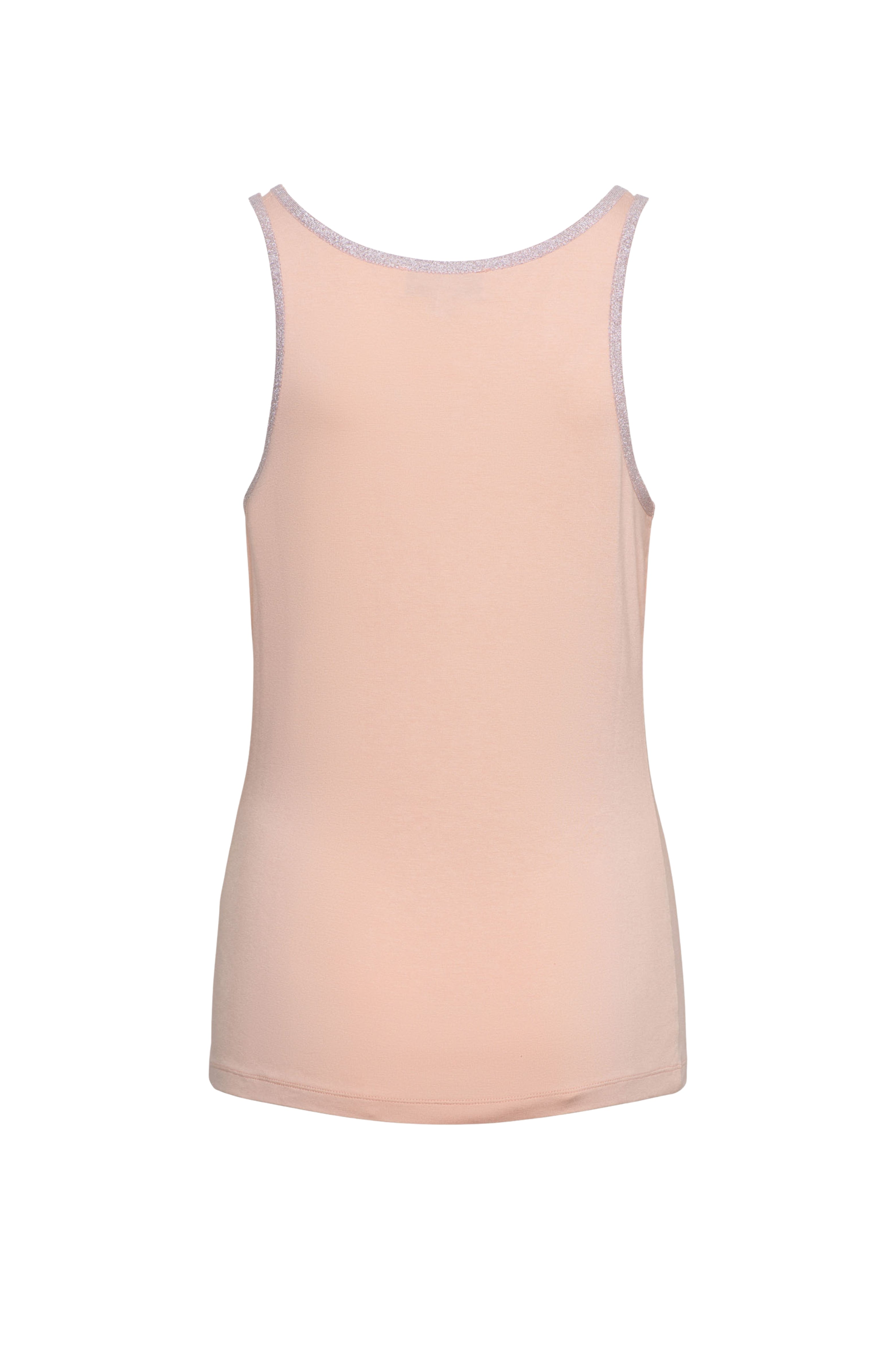 De Singlet Selly Powder Pink SG112 is een stijlvolle basic met een subtiele sparkle. De fijne bandjes en de lichte glans langs de hals en schouderbandjes geven dit item een elegante touch. Perfect als layering piece of om solo te dragen op warme dagen.
