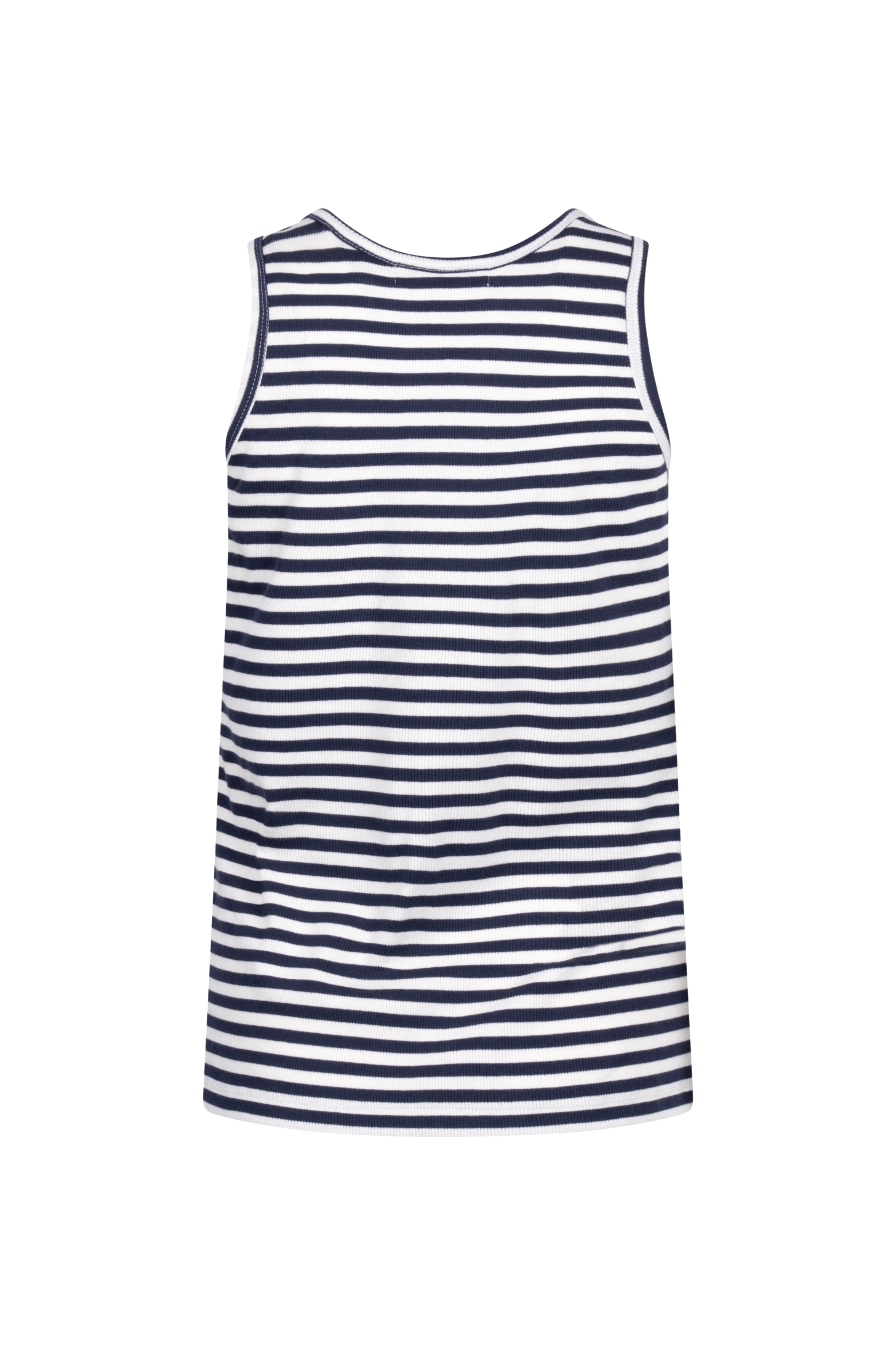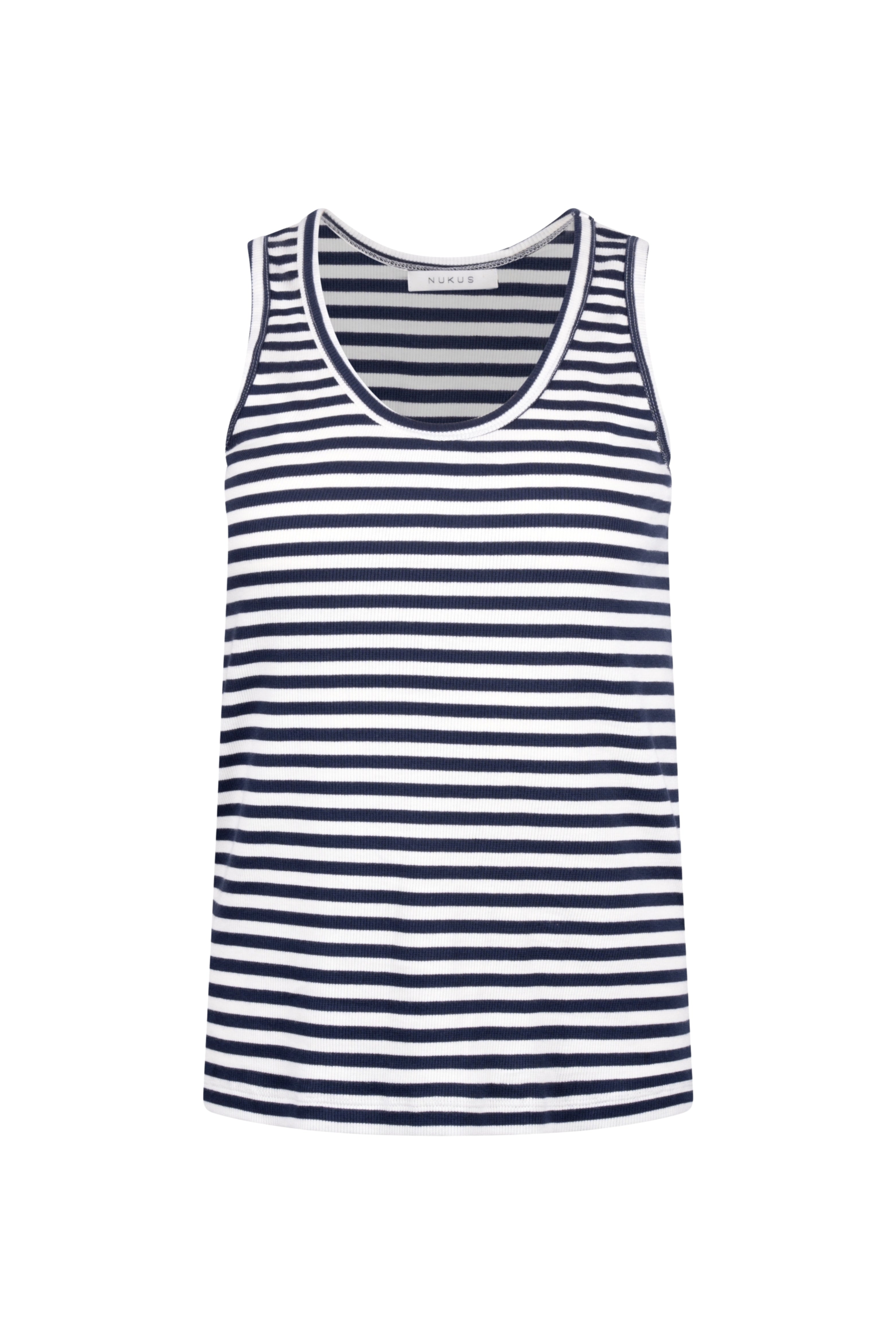 De Singlet Steffie Offwhite Navy van Nukus is een stijlvolle rib singlet met een tijdloos streeppatroon, perfect als basisitem voor elke outfit. Combineer met een blazer of een stoer jacket.