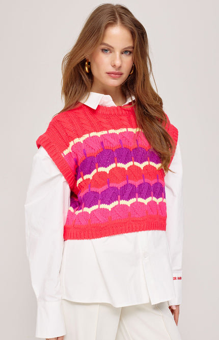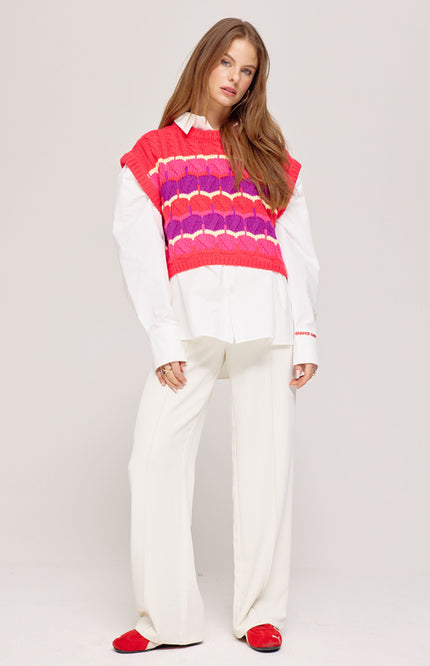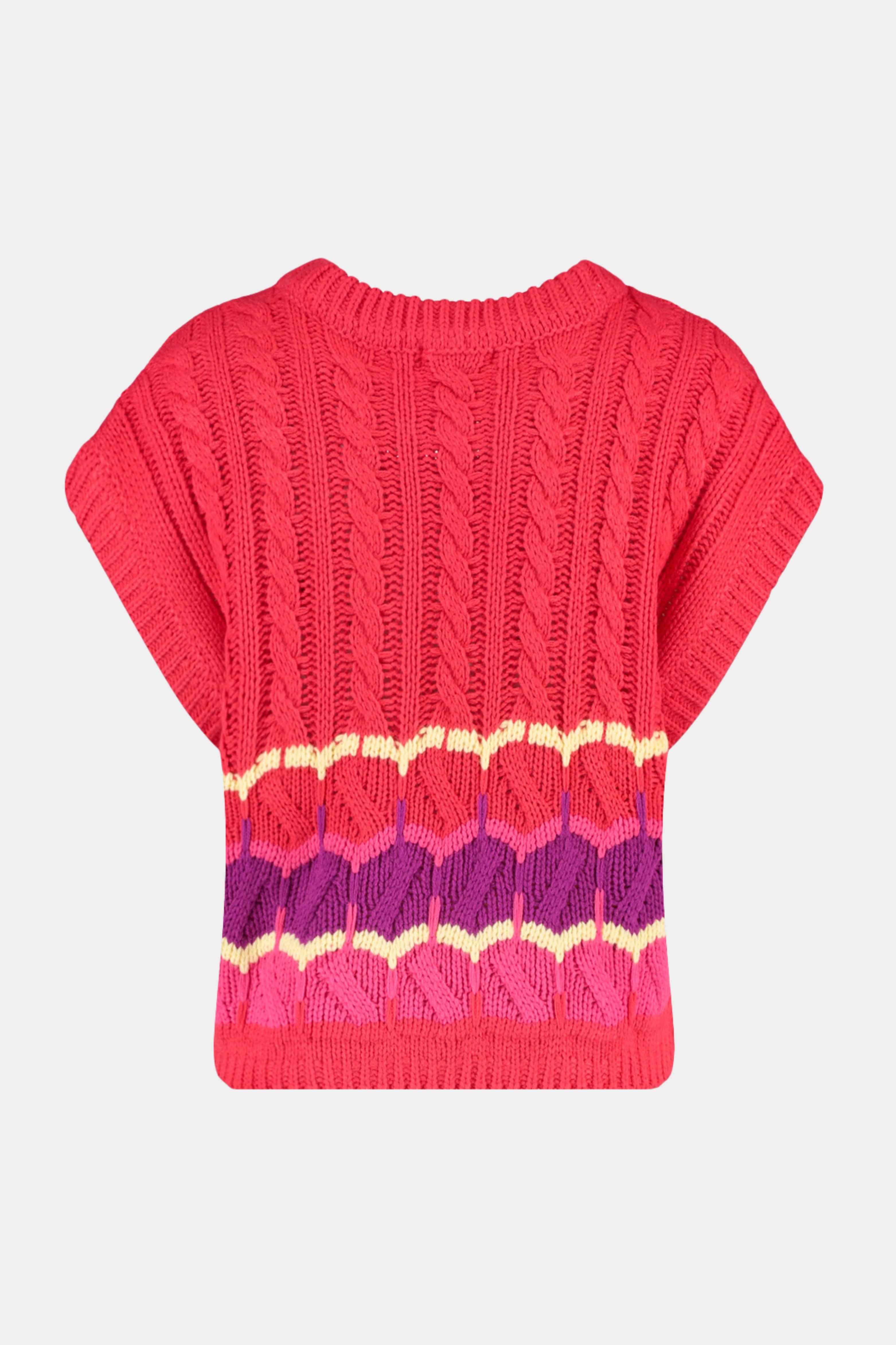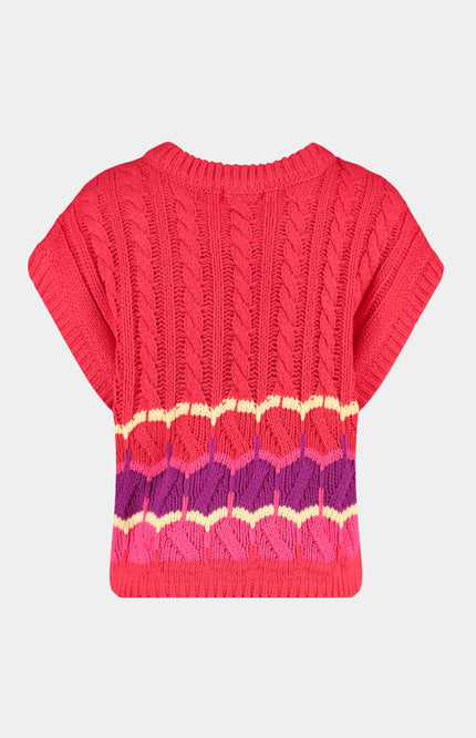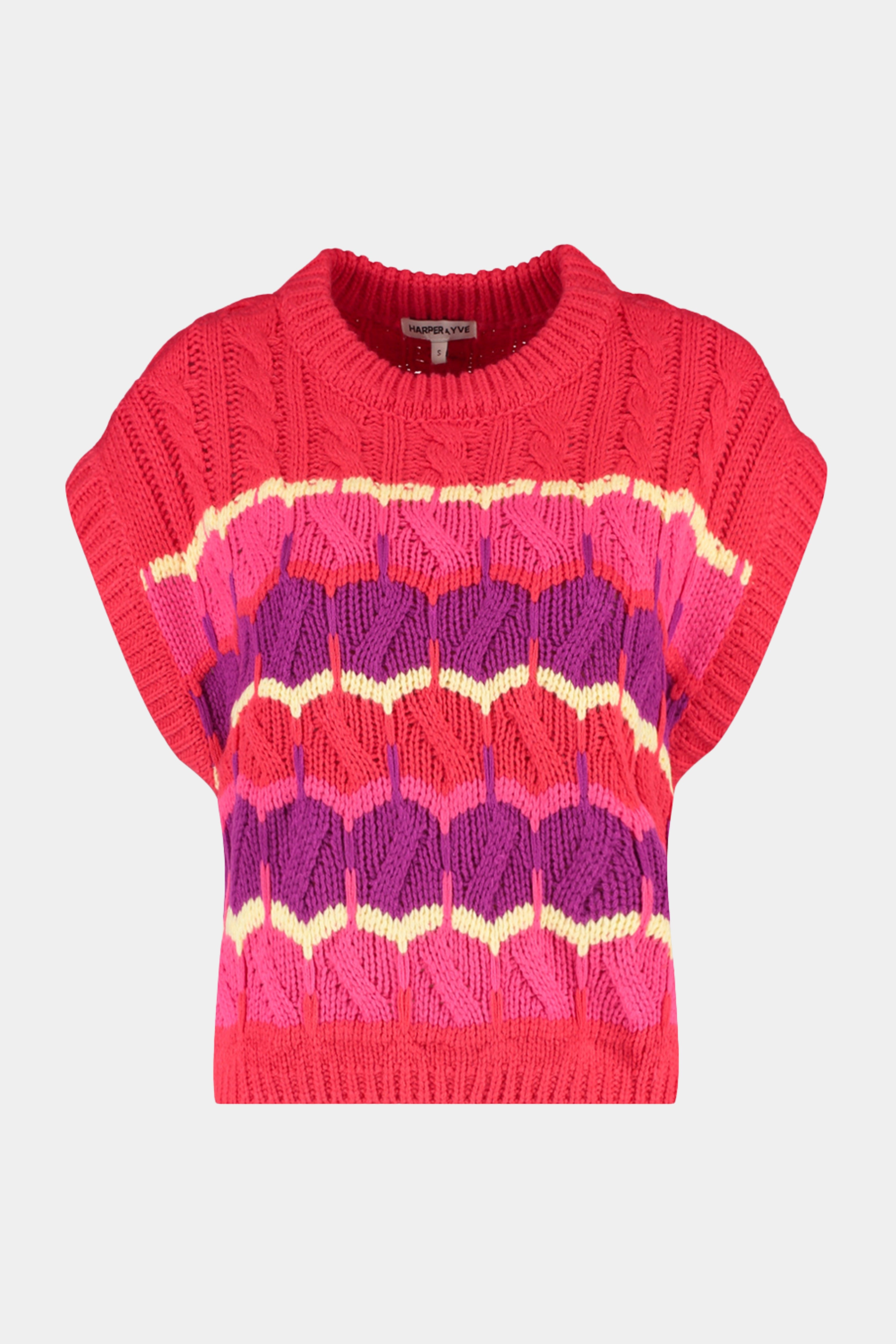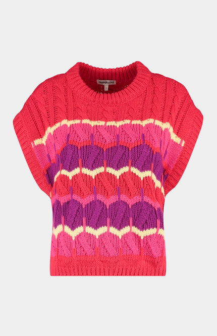 Voeg een speelse en kleurrijke touch toe aan je outfit met de Nonna Spencer van Harper & Yve. Deze gebreide spencer is een echte eyecatcher dankzij de opvallende kleurencombinatie van rood, roze, paars en crème.