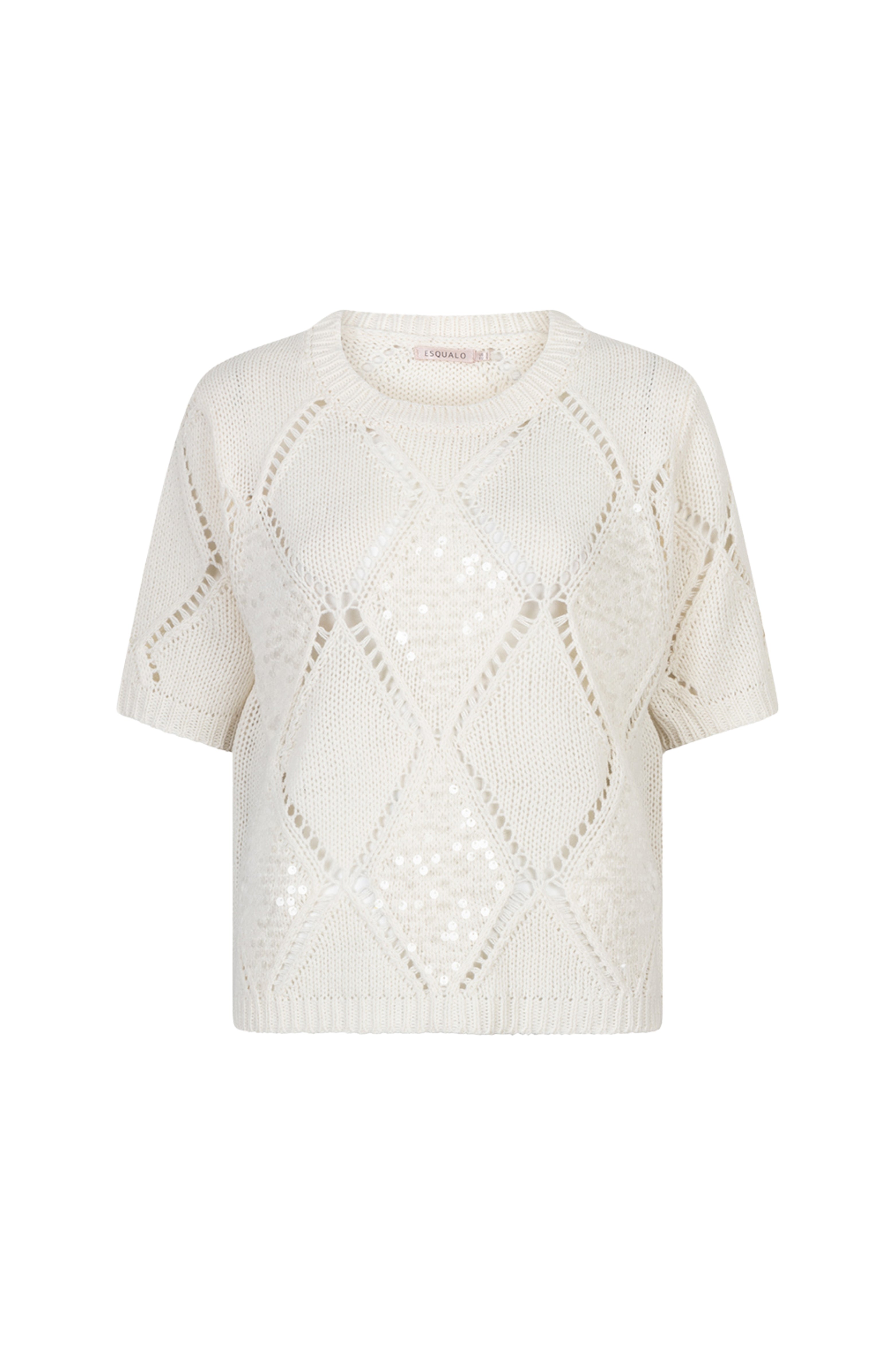 De Sweater Ajour Diamond Sequins Ecru van Esqualo is een feestelijke sweater met ronde hals. Opengewerkt ruitbreisel met fonkelende pailletten, perfect voor een zomerse dag of feestje.