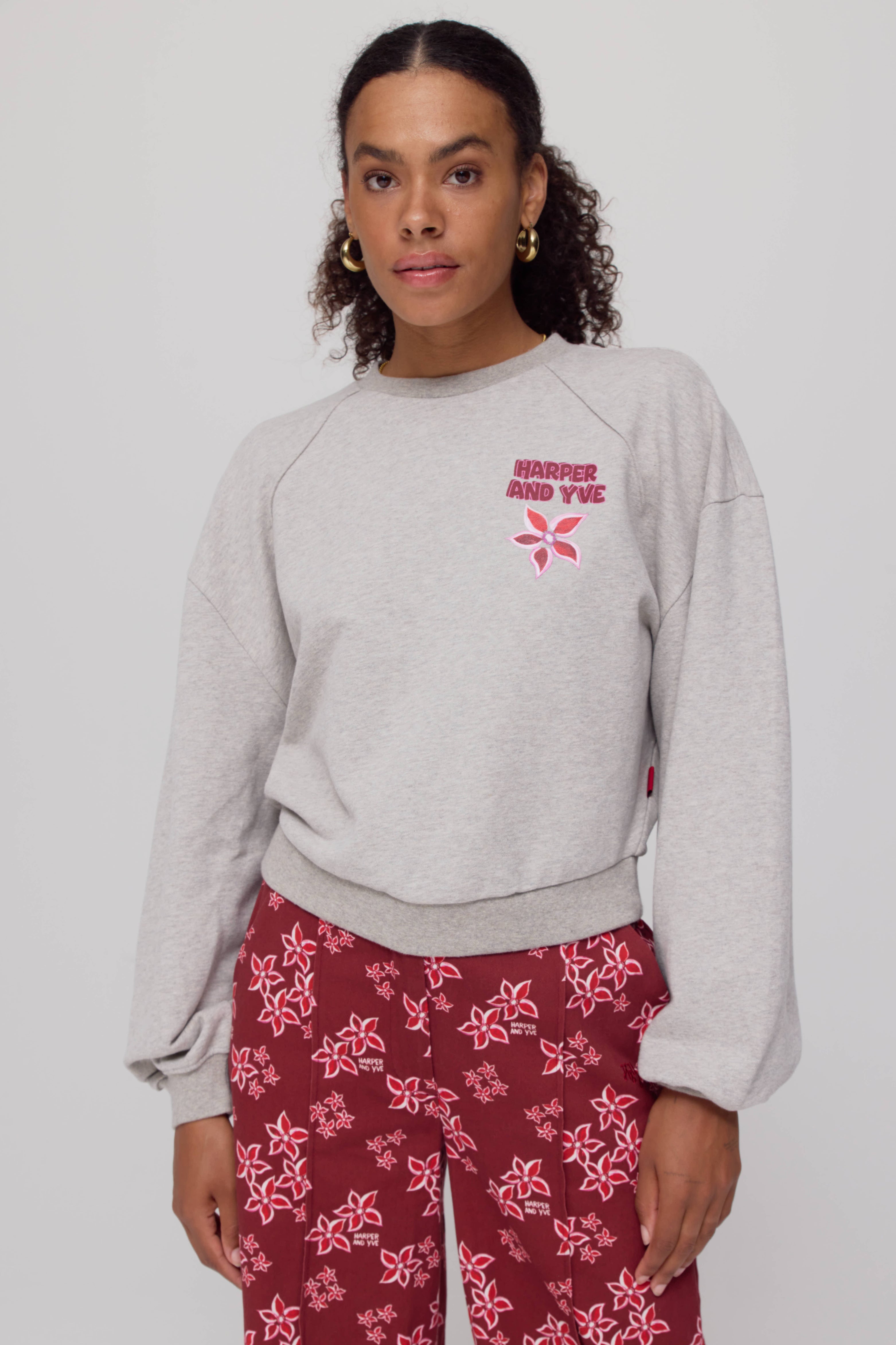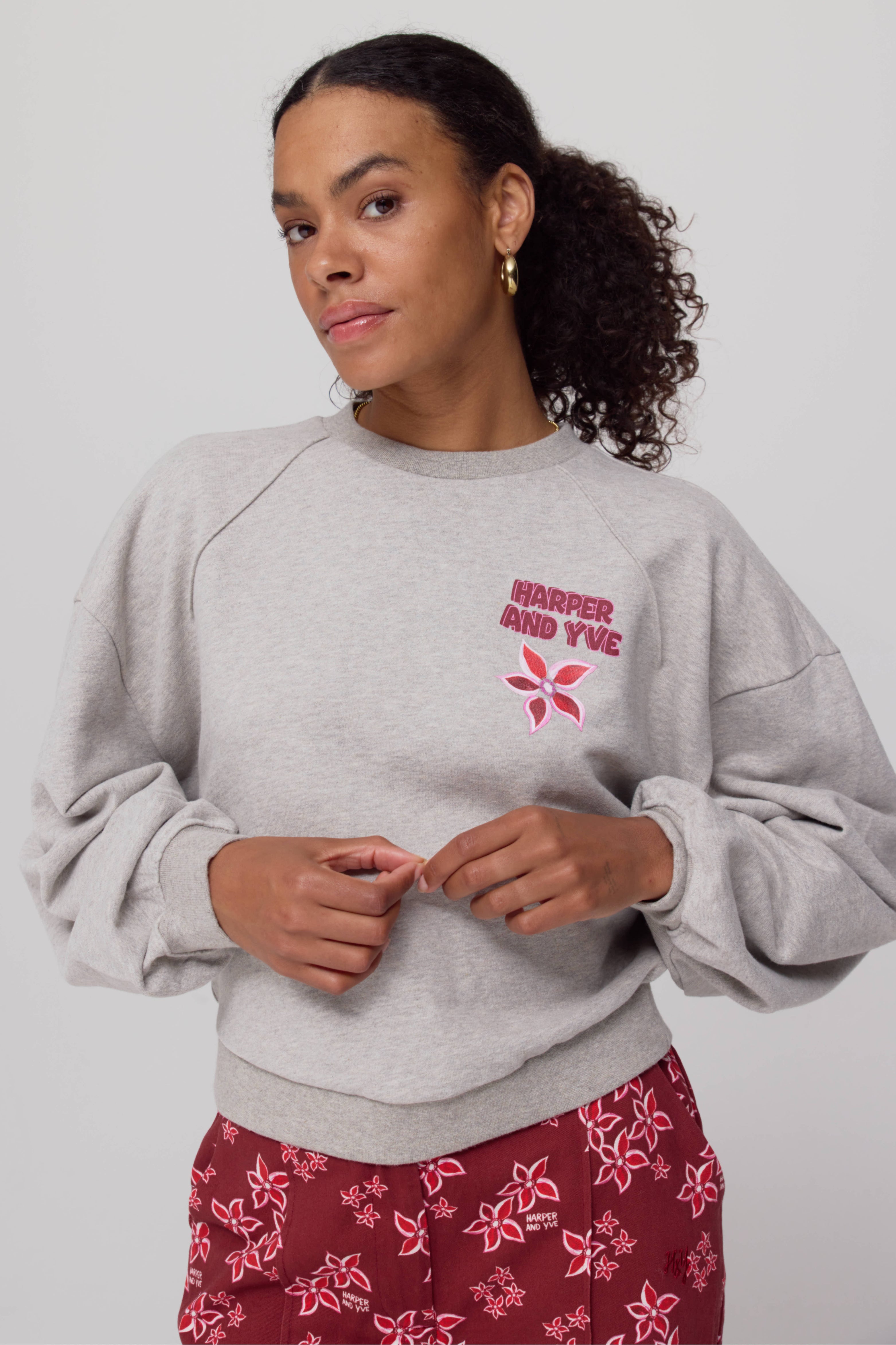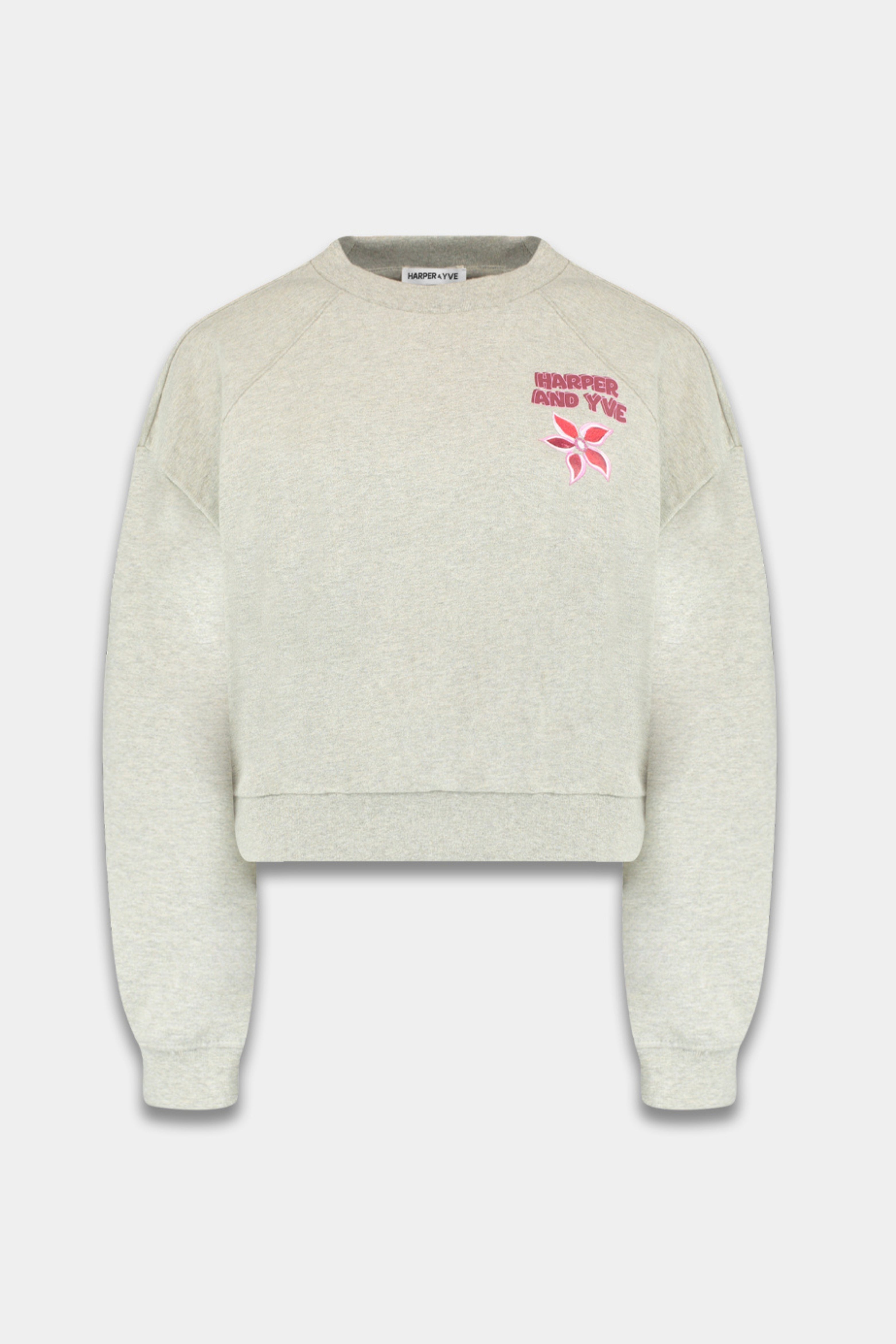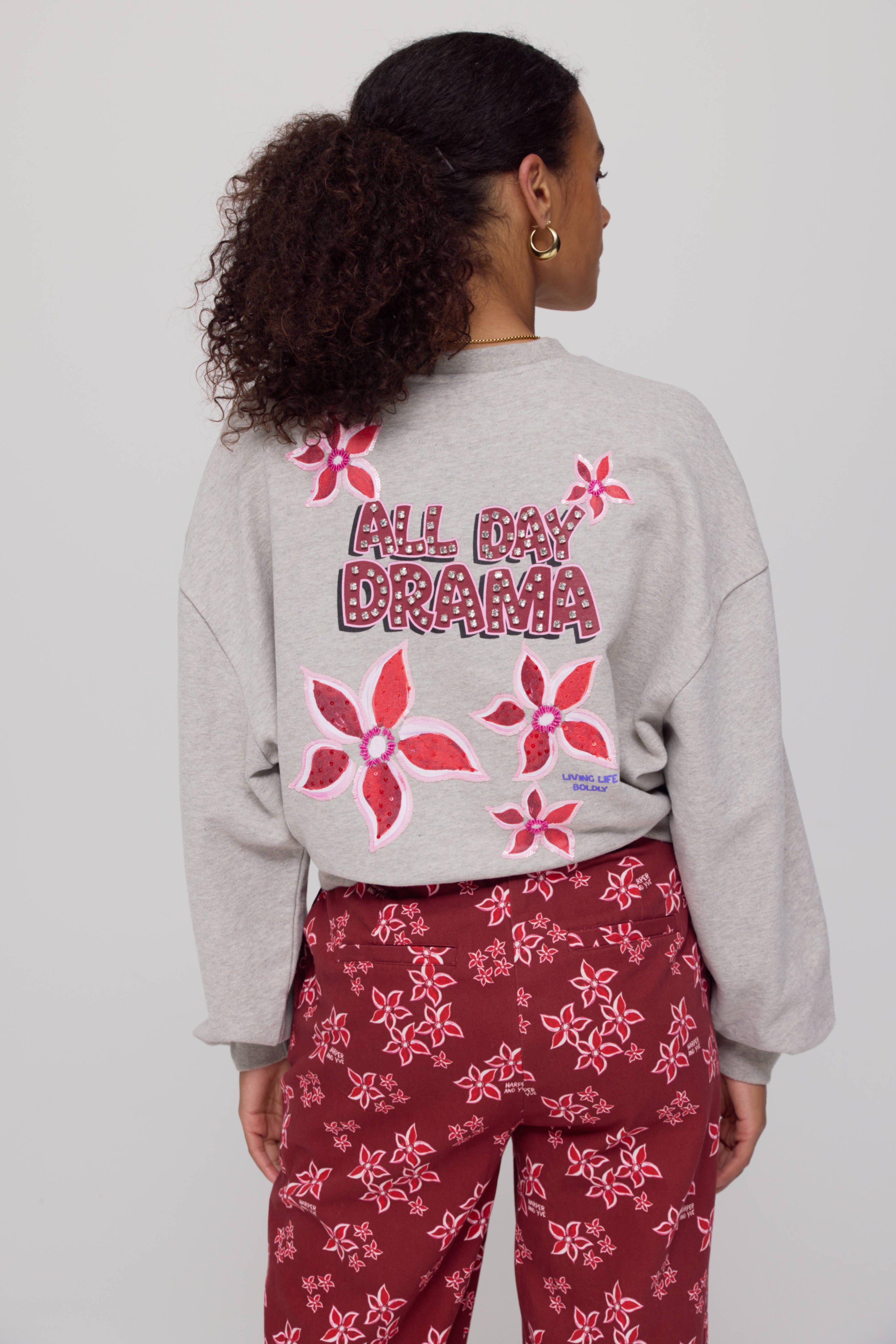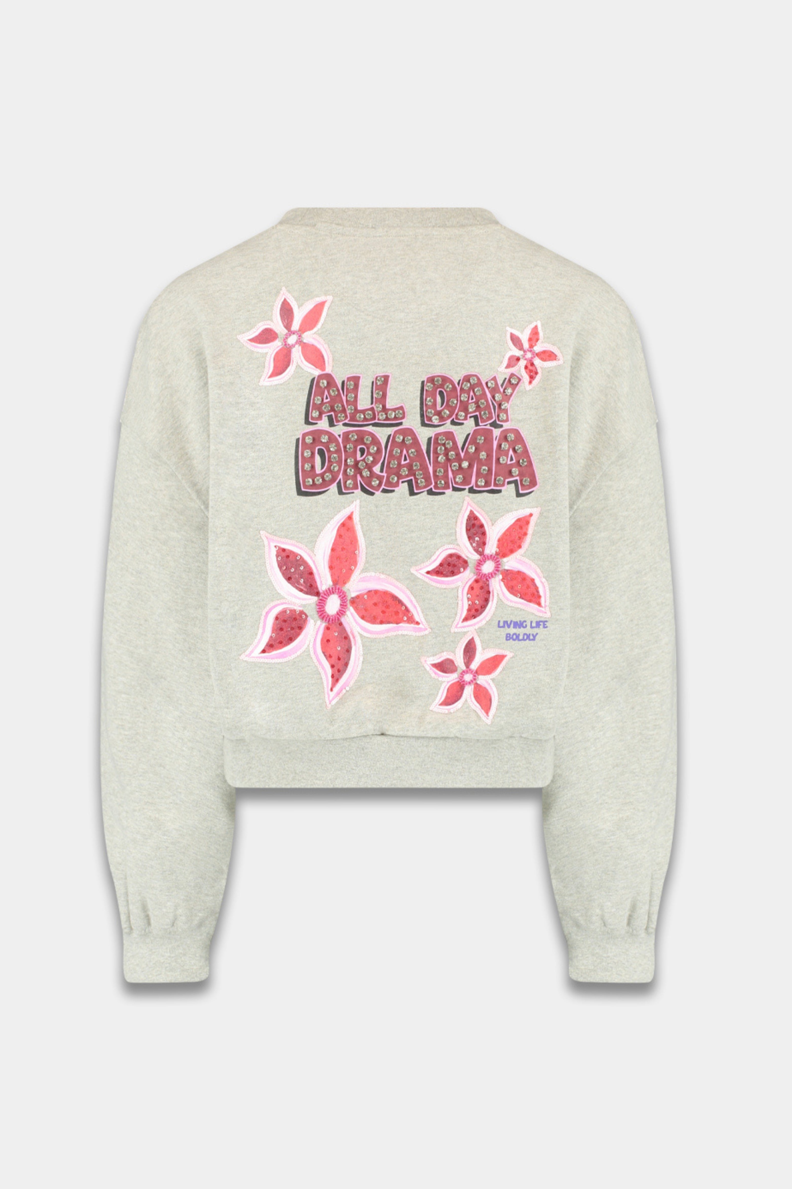 Sweater Alldaydrama Grey Melee van Harper & Yve is een cropped sweater met een relaxed fit. De voorkant is subtiel bedrukt met een geborduurd logo en bloem, terwijl de achterkant juist opvalt met grote bloemenapplicaties en de opvallende tekst ‘ALL DAY DRAMA’.