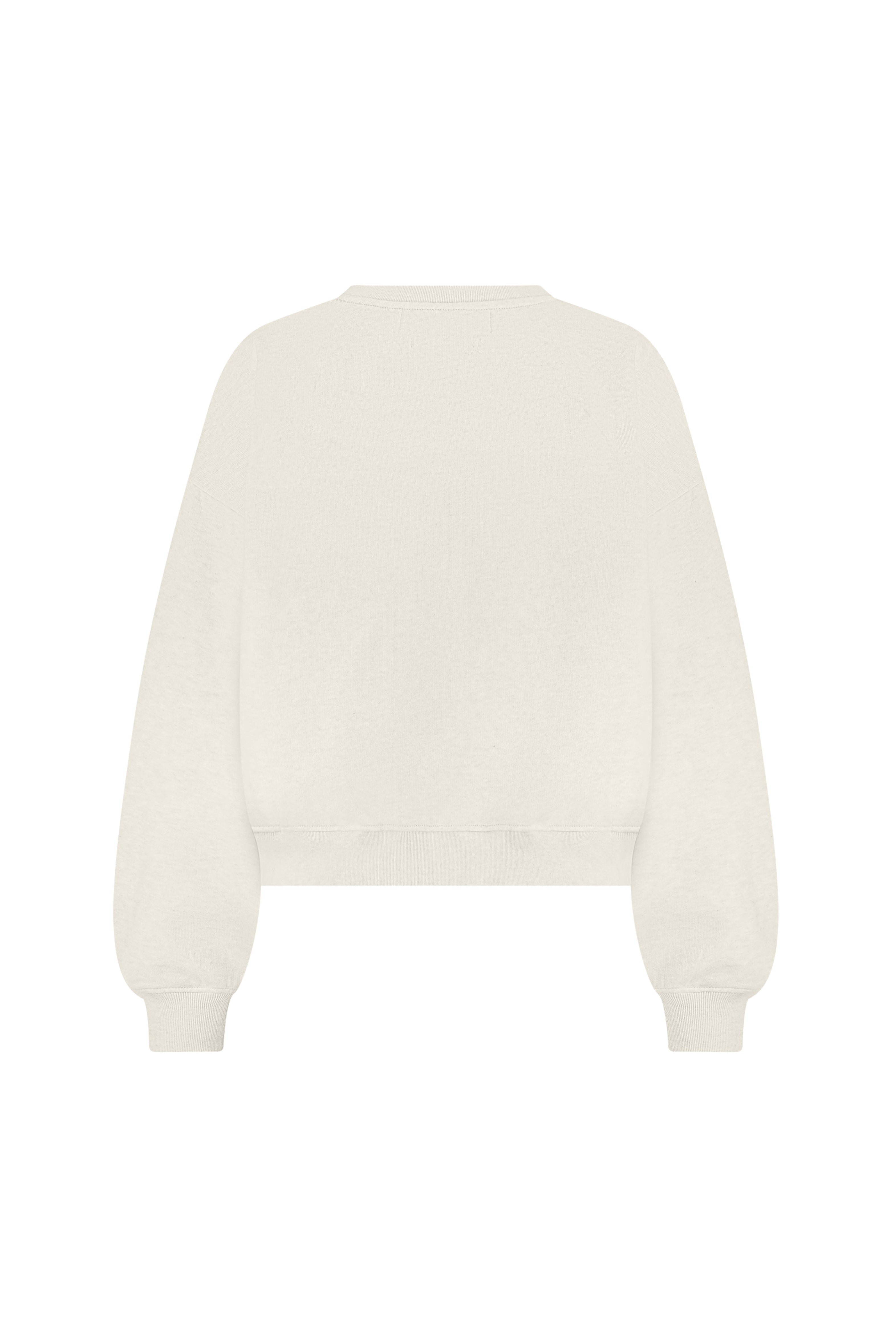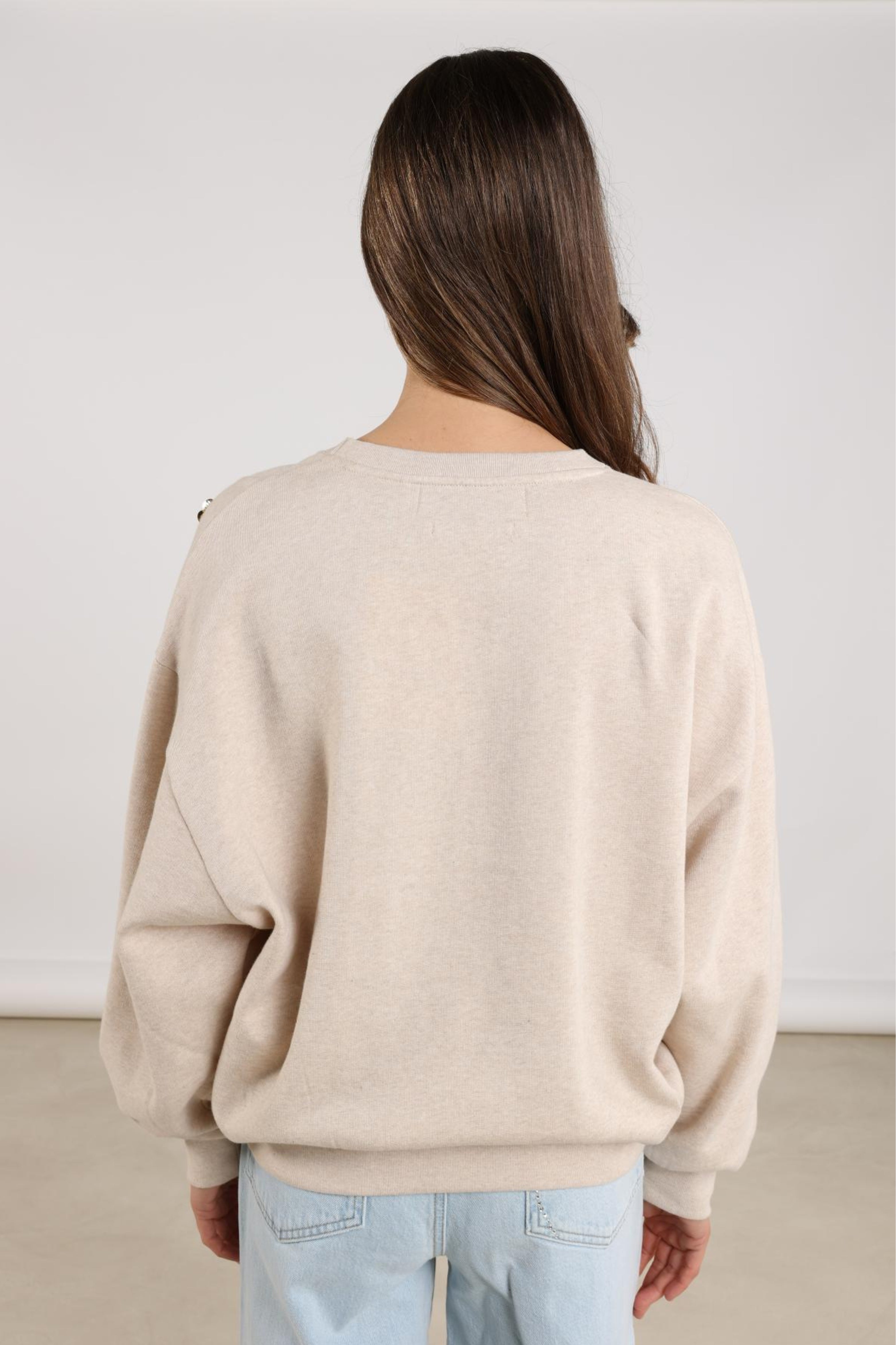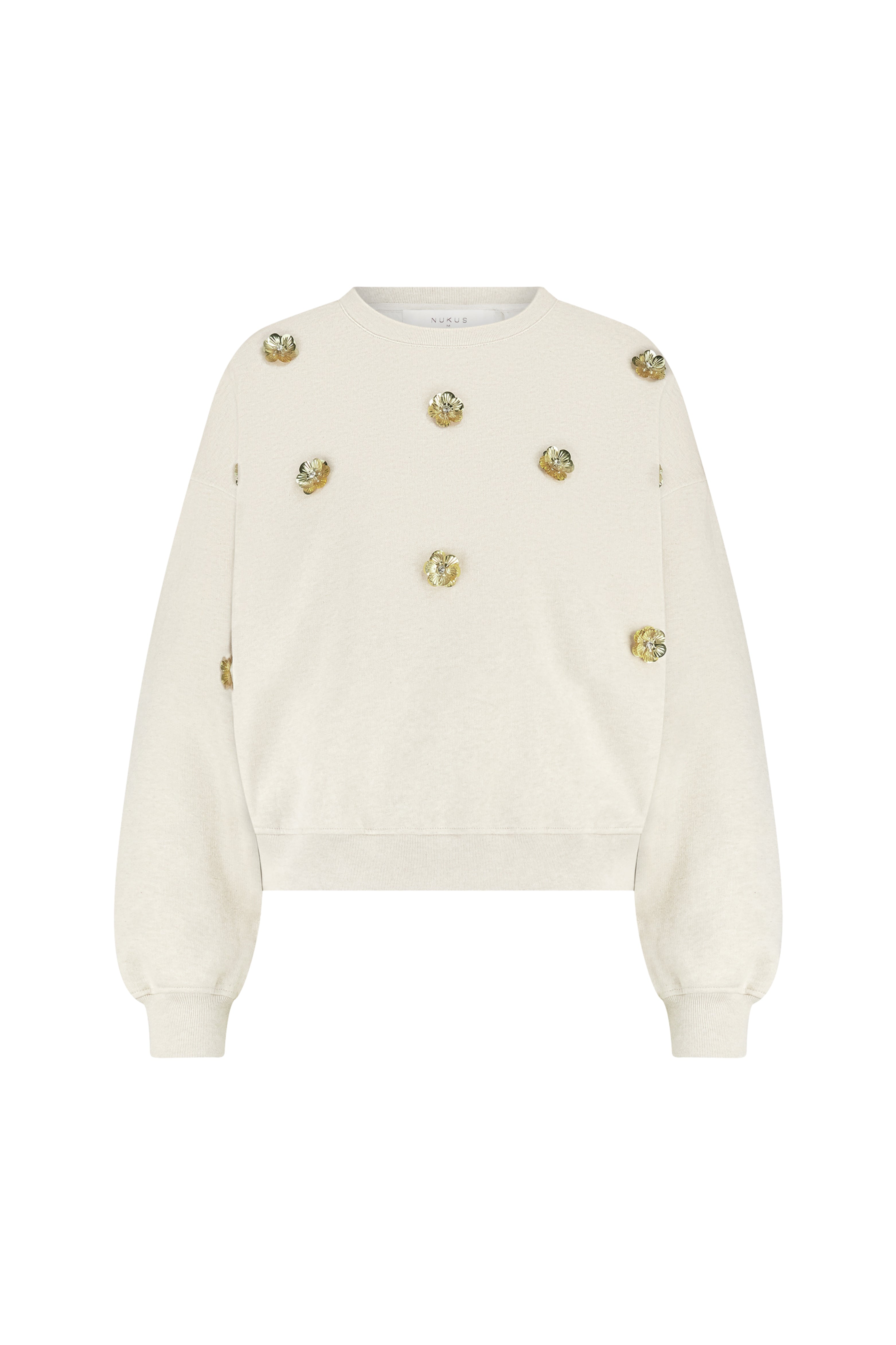 De Sweater Beatriz Flower Sand Melange van Nukus is een comfortabele sweater met subtiele ballonmouwen. De zandkleurige melange wordt stijlvol opgefleurd door opvallende bloemenapplicaties met een glanzend effect.