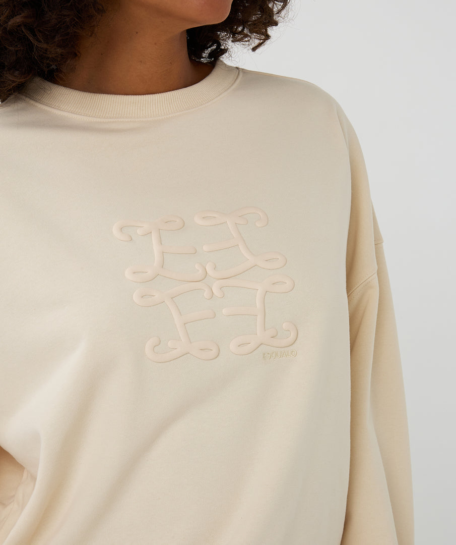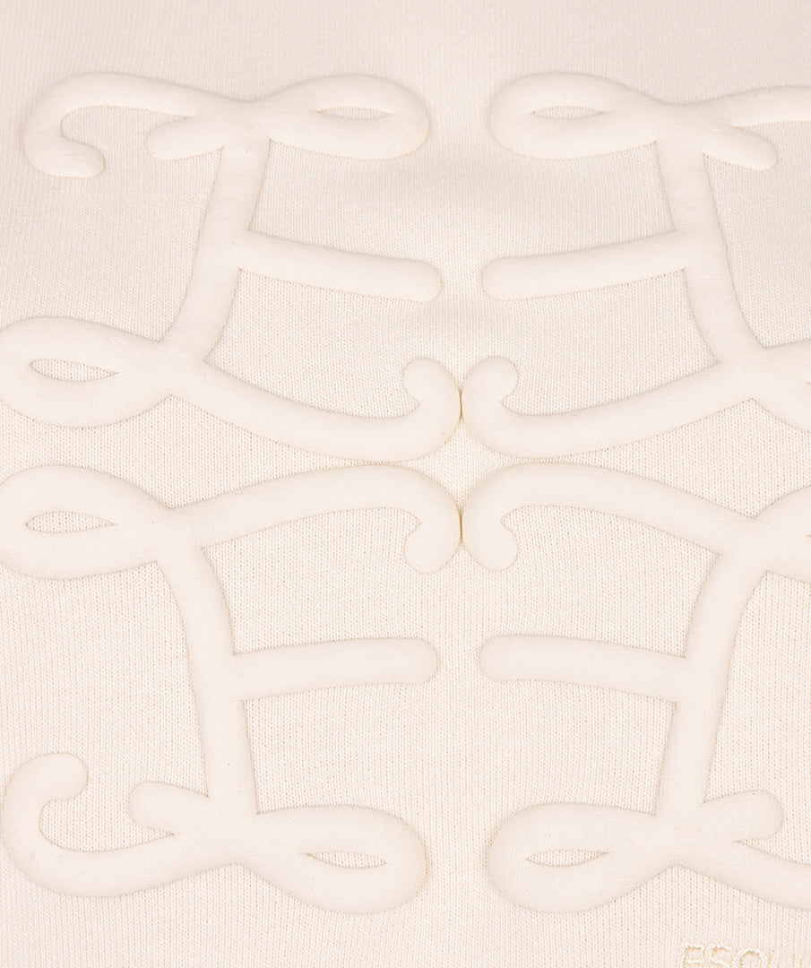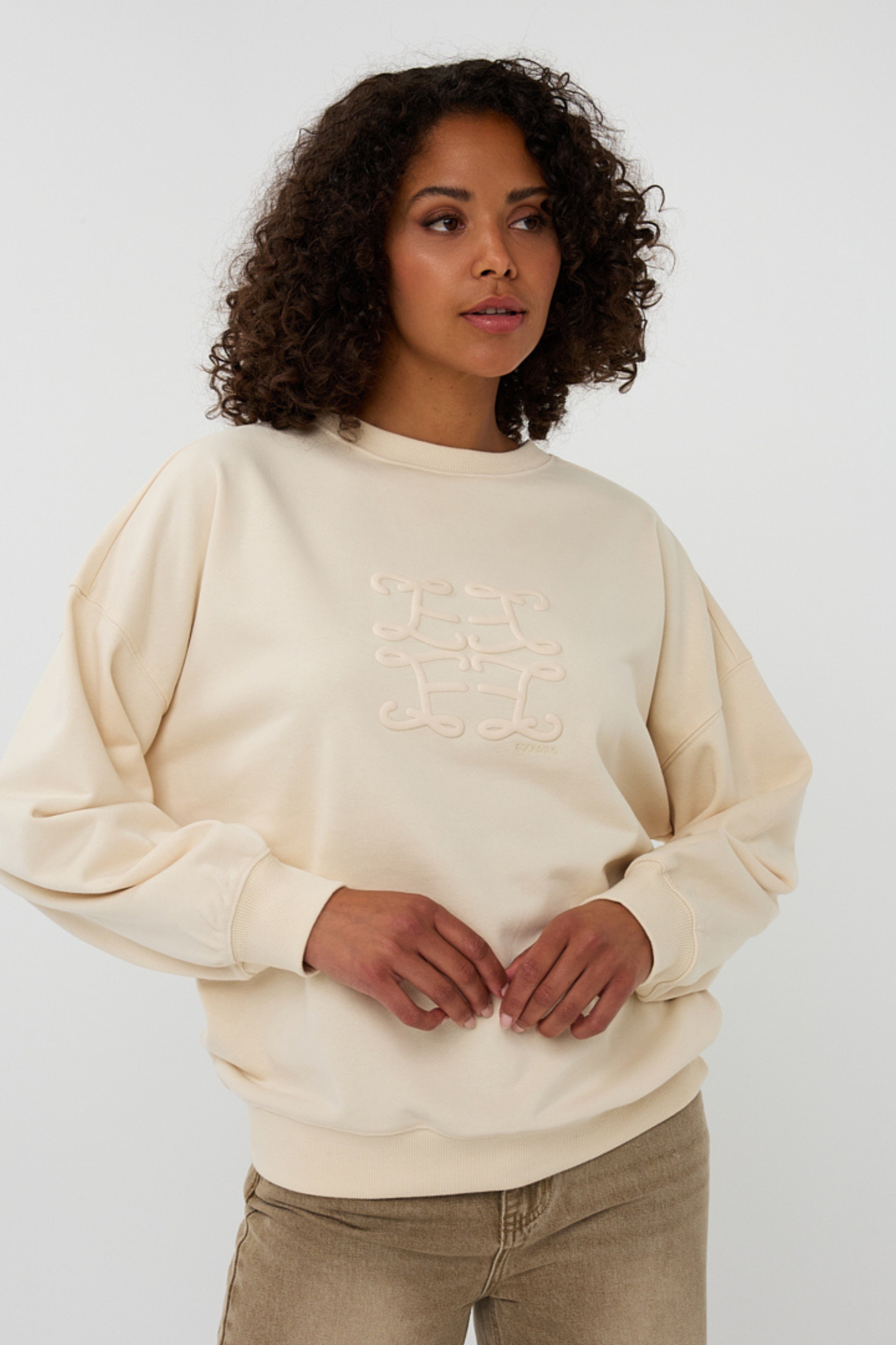 Deze sweater in ecru met embossed logo is een stijlvolle basic met luxe touch. Gemaakt van een zachte katoenmix, biedt het ultiem comfort met een verfijnde uitstraling. De perfecte mix van minimal chic en nonchalante elegantie.