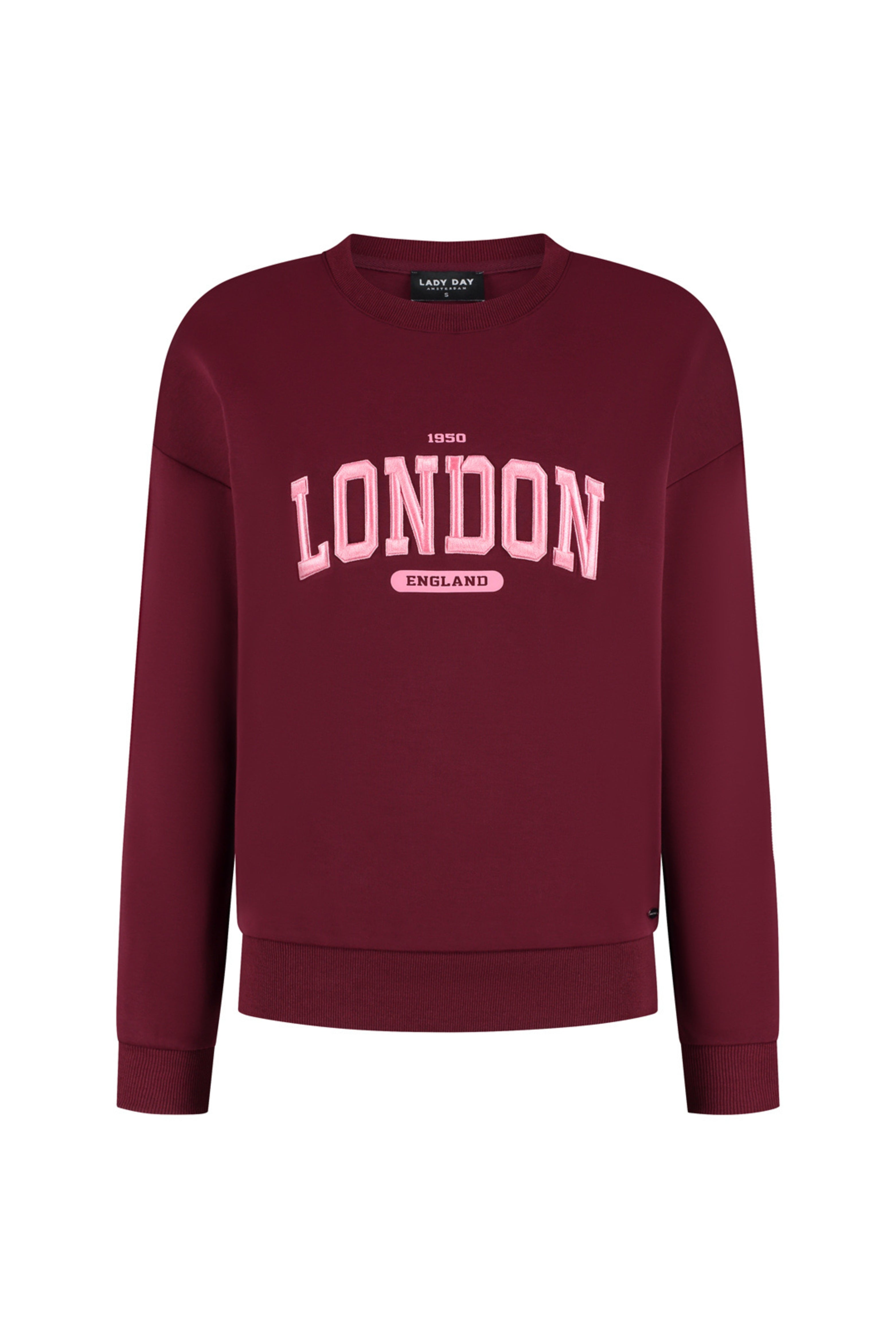 De Sweater London Burgundy van Lady Day is een sportieve sweater met ronde hals. Zachte sweatstof, geribde boorden en cropped pasvorm geven een moderne look. Perfect voor casual dagen en weekend.