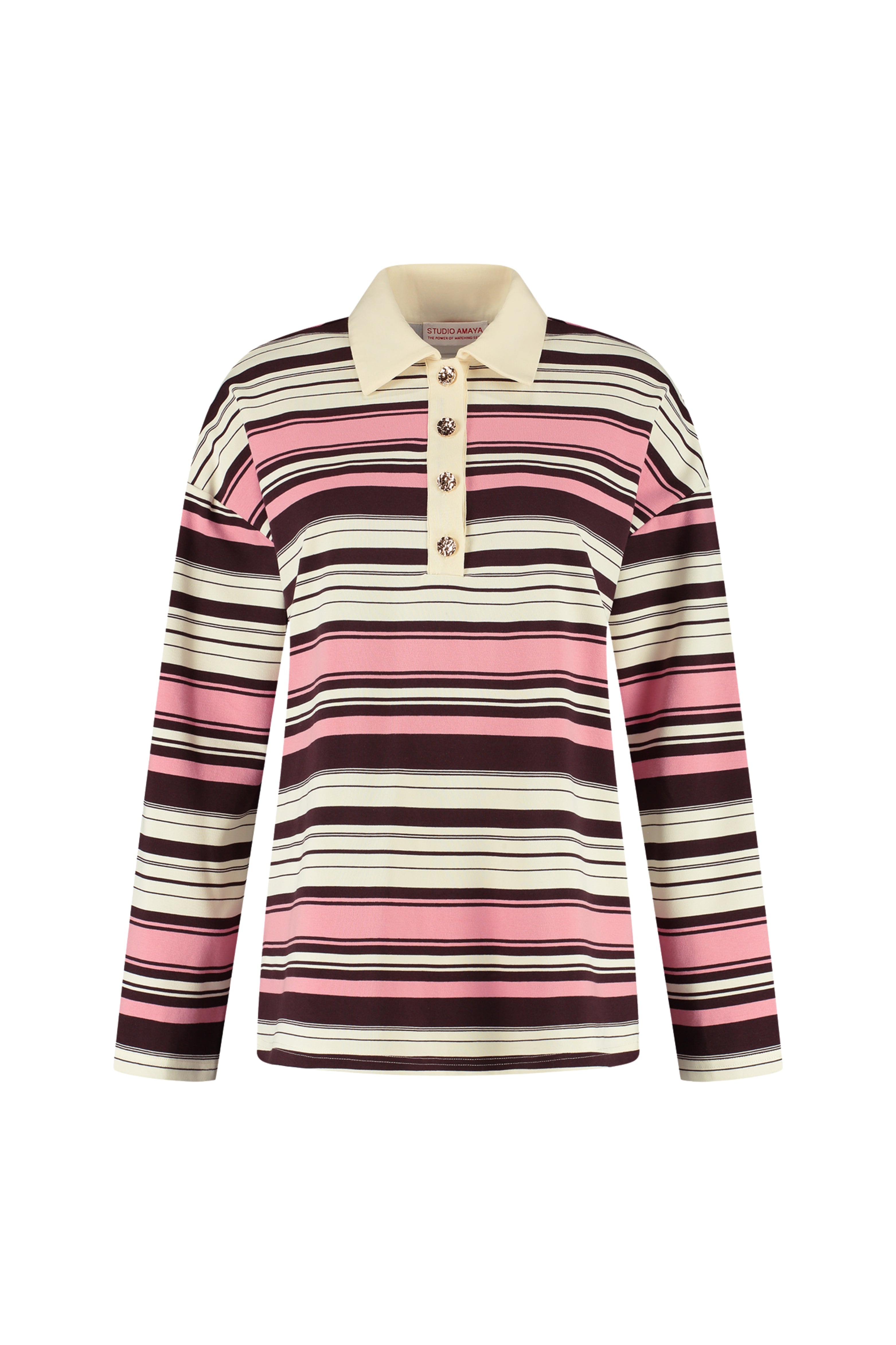 Sweater Lucky Multi Print van Studio Amaya heeft een speels streeppatroon in roze, bruin en wit. Met contrasterende kraag en knoopsluiting krijgt hij een frisse look. De losse pasvorm maakt dit item comfortabel én trendy.