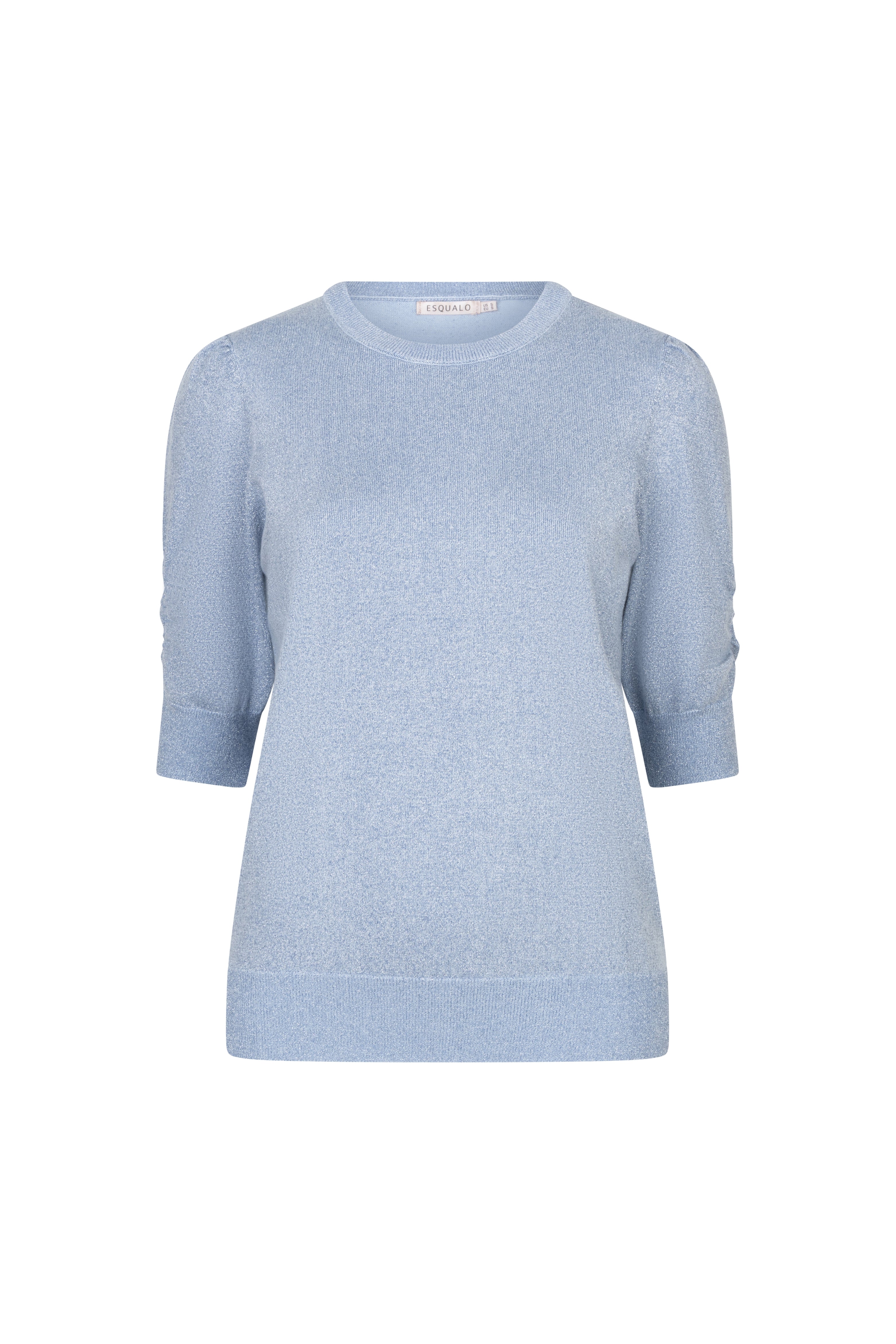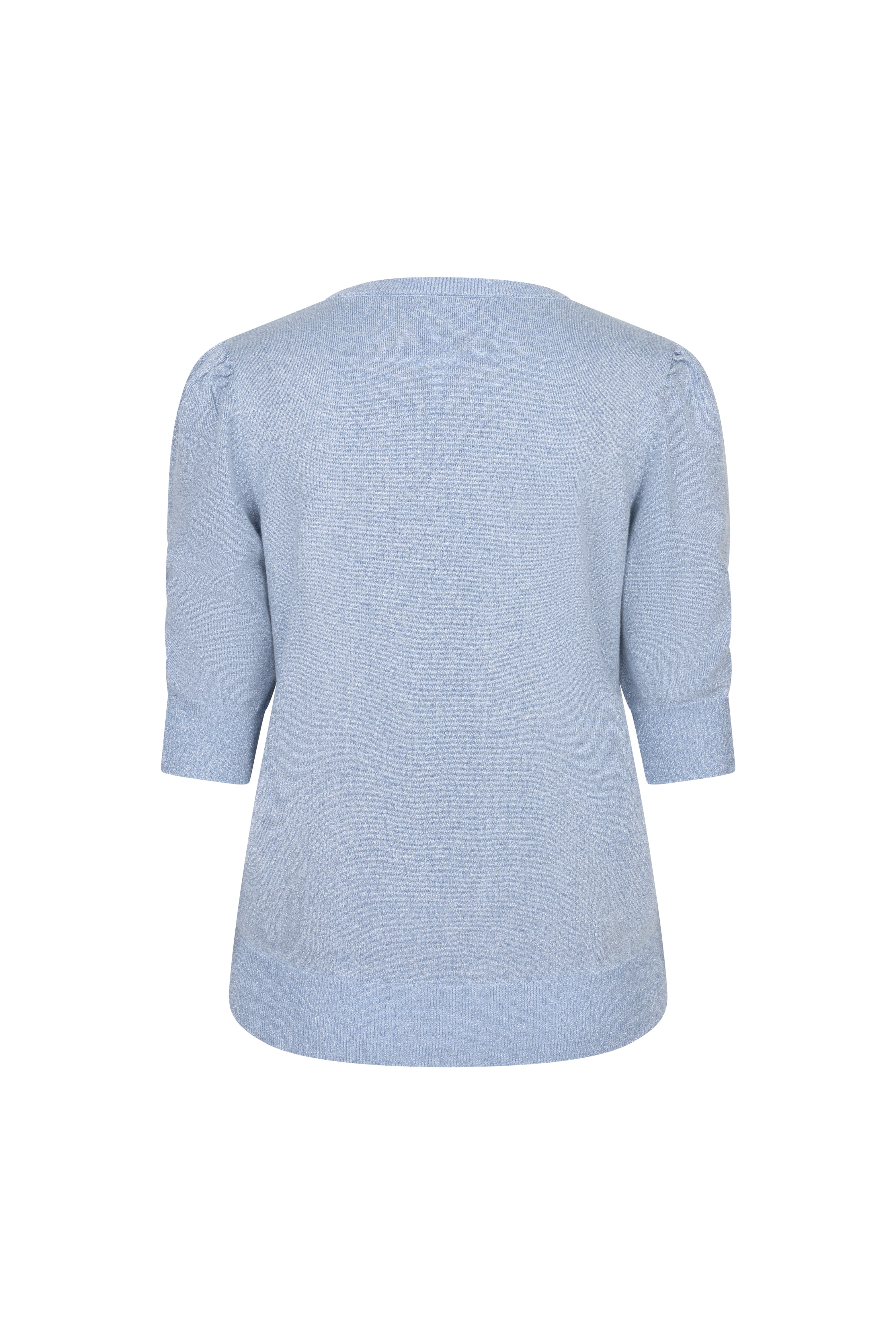 Een vrouwelijke trui met korte pofmouwen en subtiele lurex glans. De blauwe kleur geeft een frisse en moderne touch. Perfect voor zowel casual als feestelijke looks dankzij de elegante glans en comfortabele pasvorm.