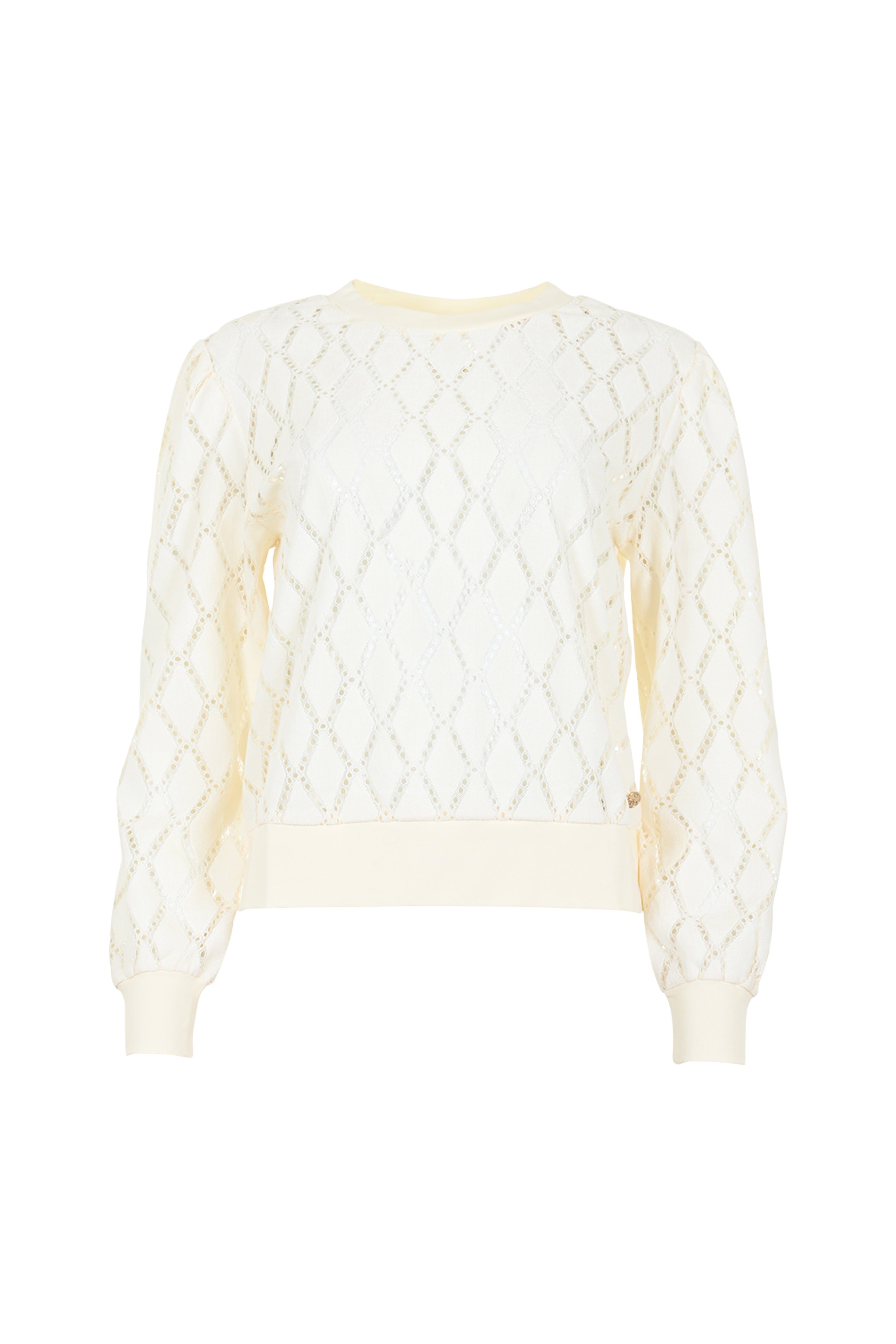 Sweater Percie Diamond Holes van Maicazz is een elegante sweater met een subtiel opengewerkt ruitpatroon. De zachte offwhite tint en comfortabele pasvorm maken dit item perfect om casual en stijlvol te combineren.