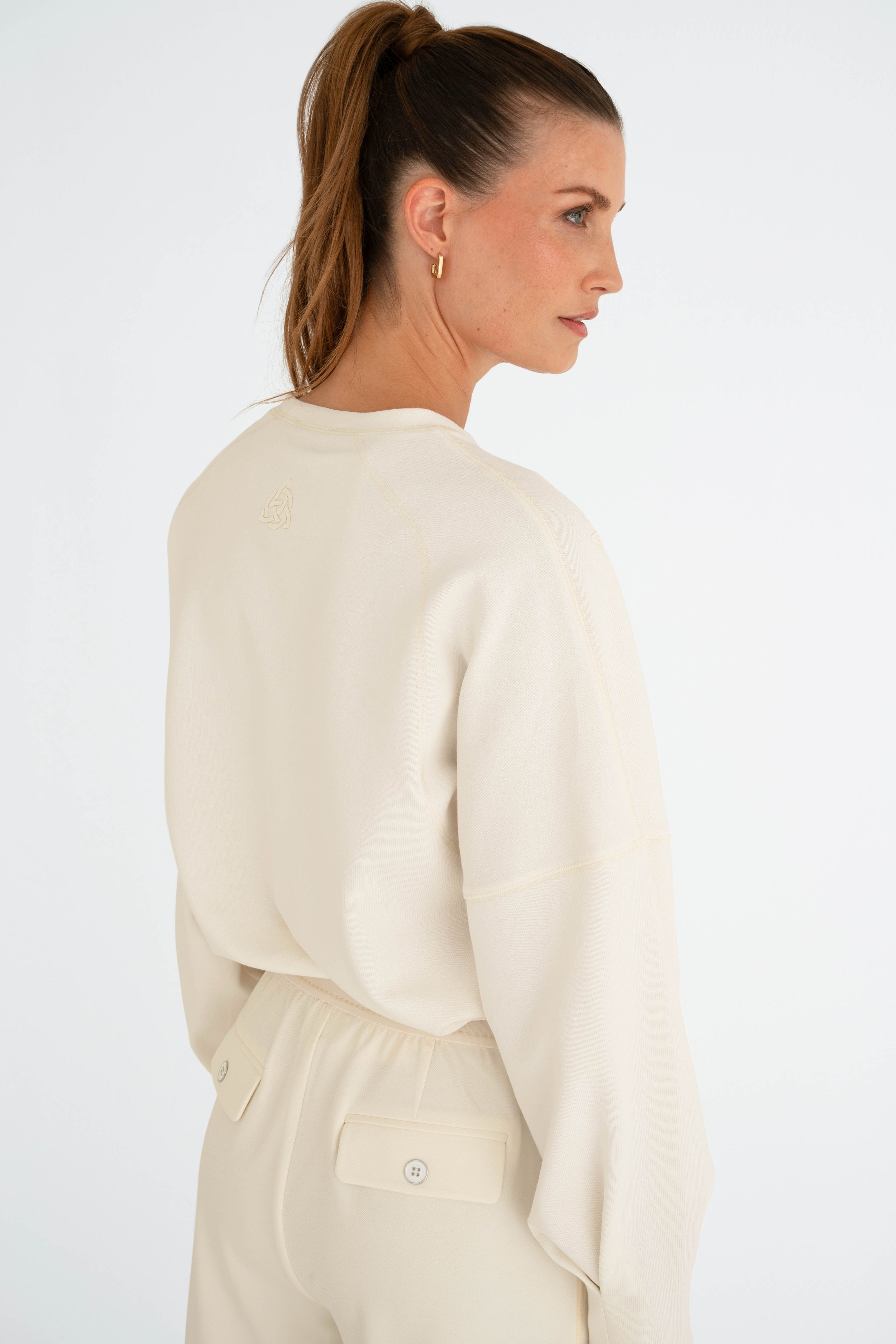 De Sweater Selma Offwhite van Maicazz is een casual sweater met ronde hals. De zachte sweatstof en het aantrekkoord in de zoom geven draagcomfort en vorm, terwijl de verlaagde schouders een relaxte look creëren. Perfect voor vrije tijd.
