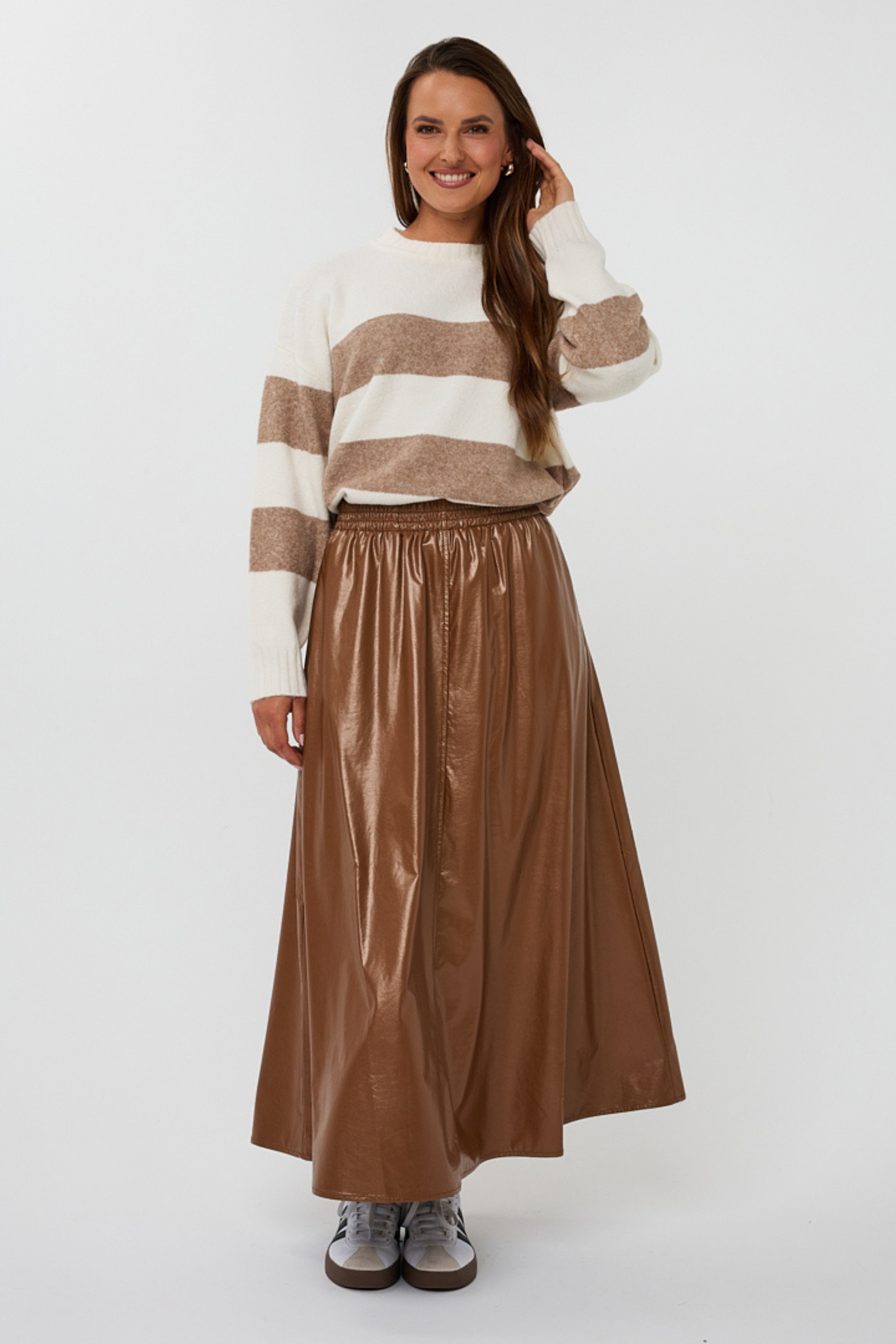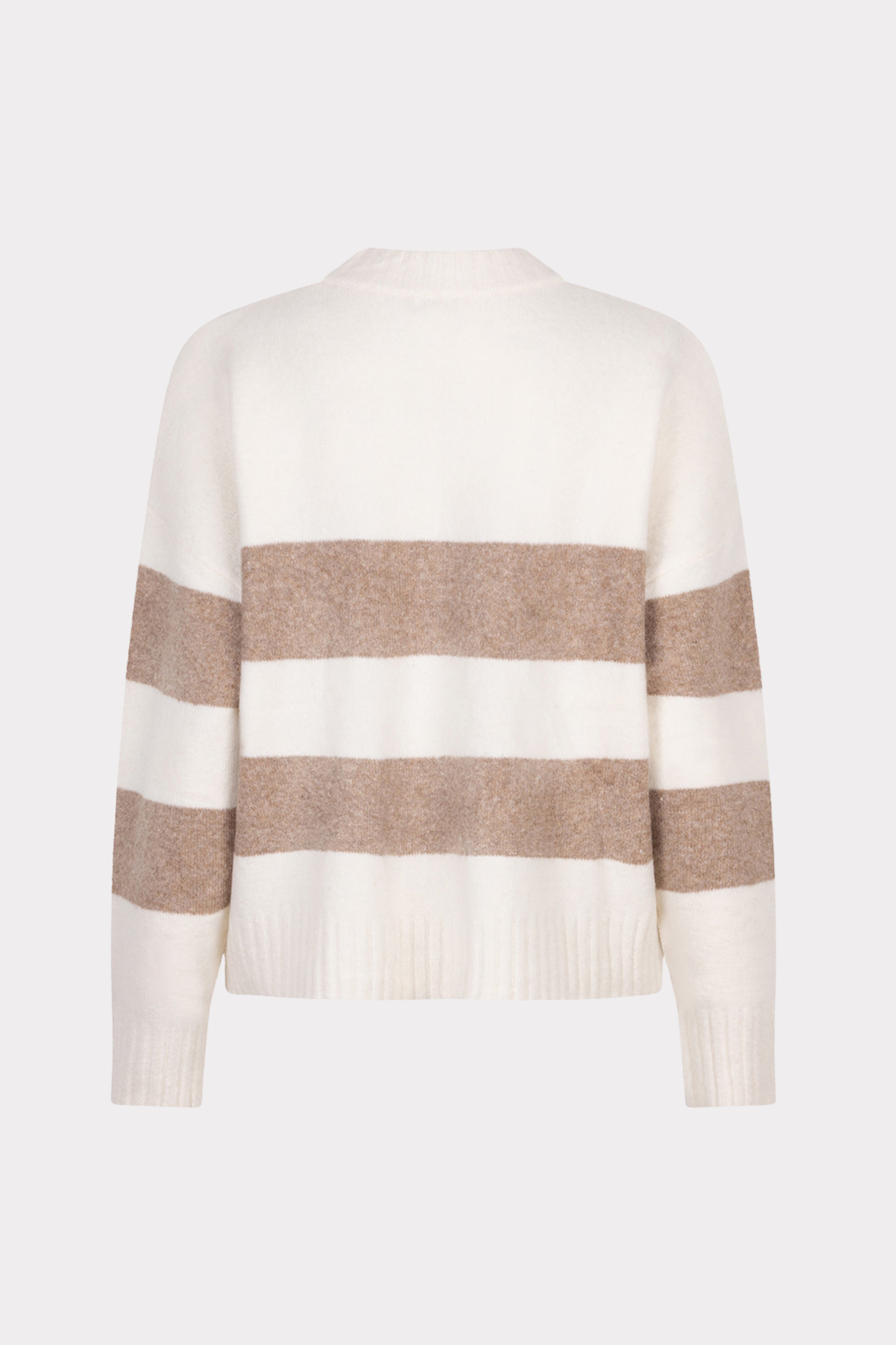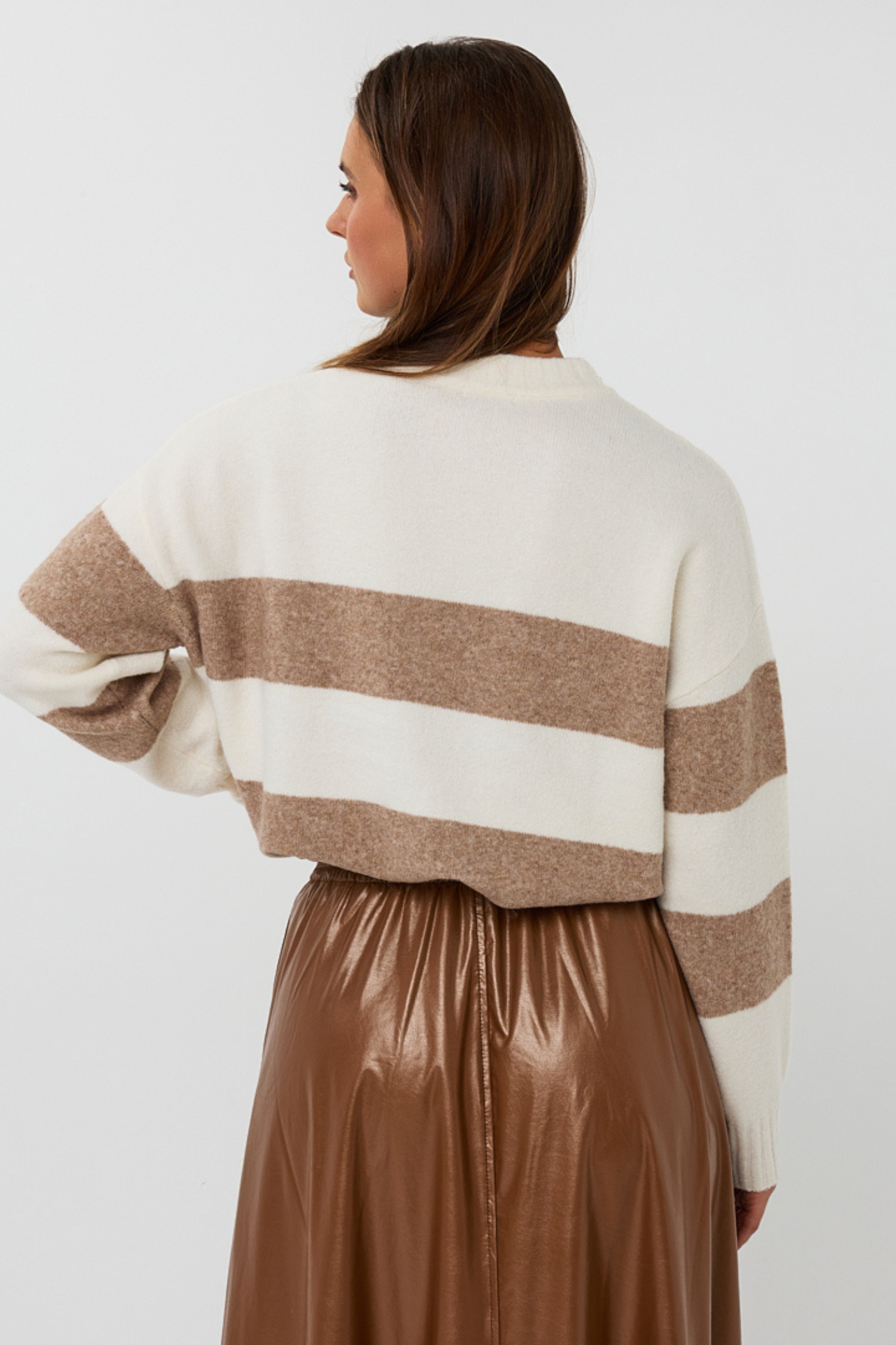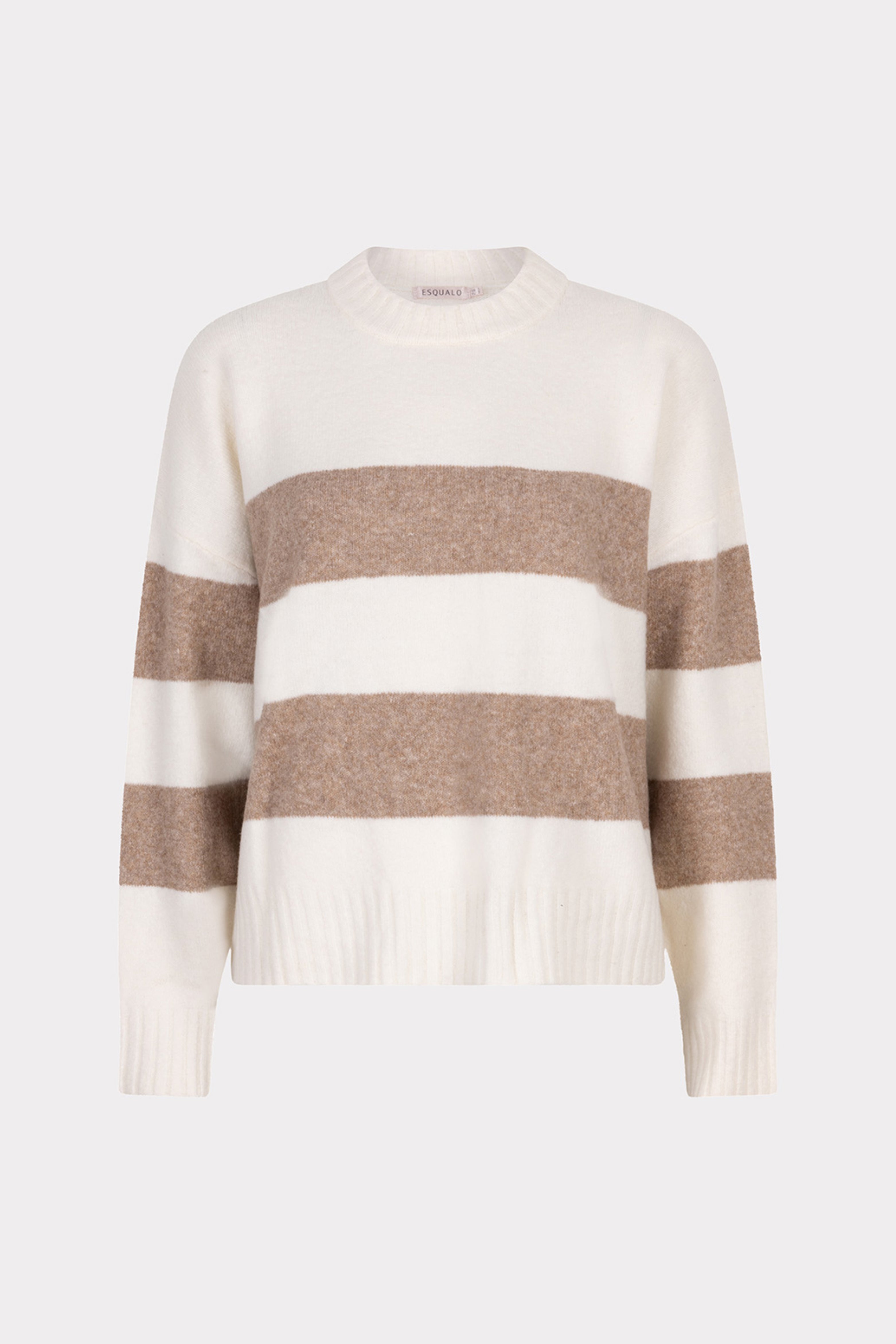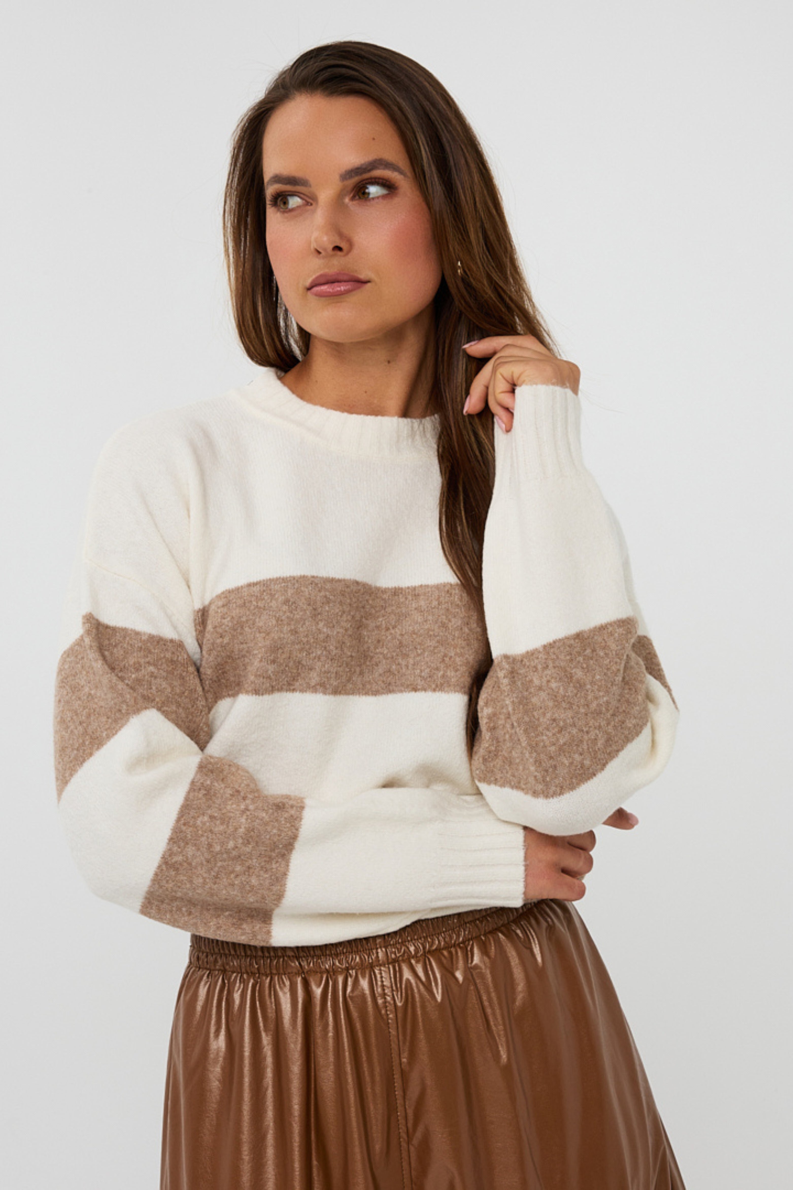 Trendy en cosy! Deze zachte sweater met brede offwhite en tan kleurblokken geeft elke outfit een stijlvolle, casual uitstraling. Perfect voor een relaxte herfstlook of een frisse winterwandeling.