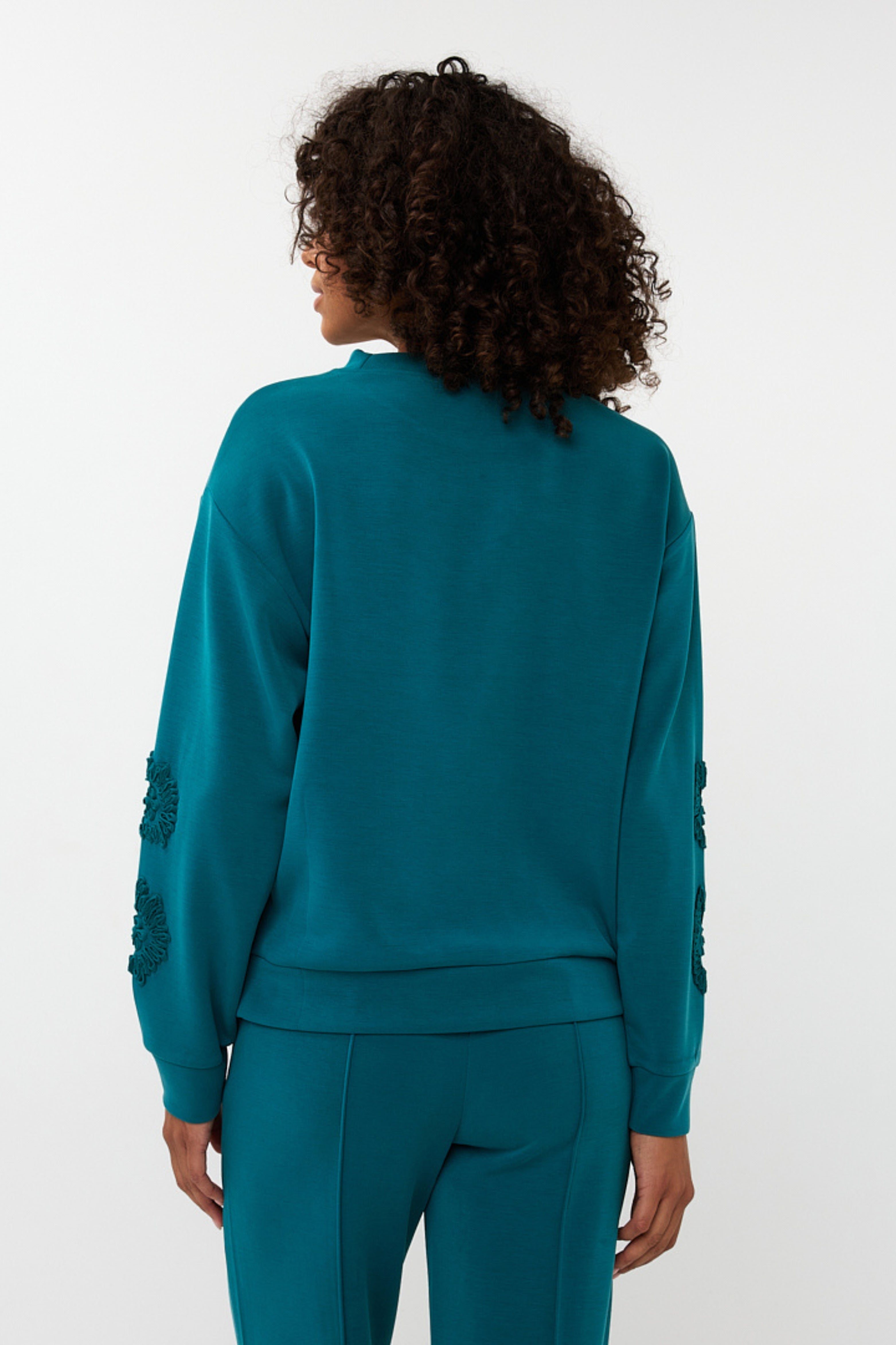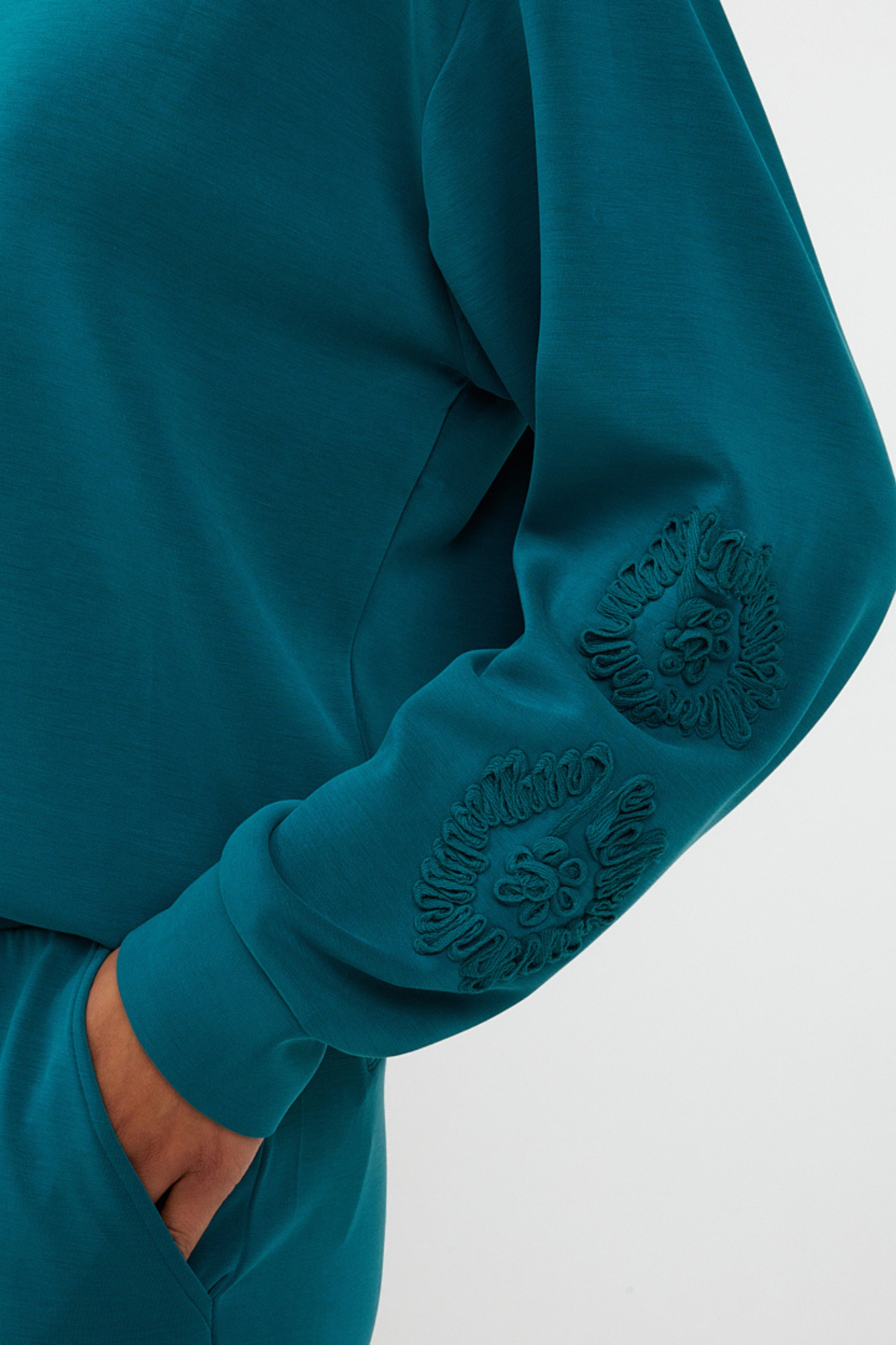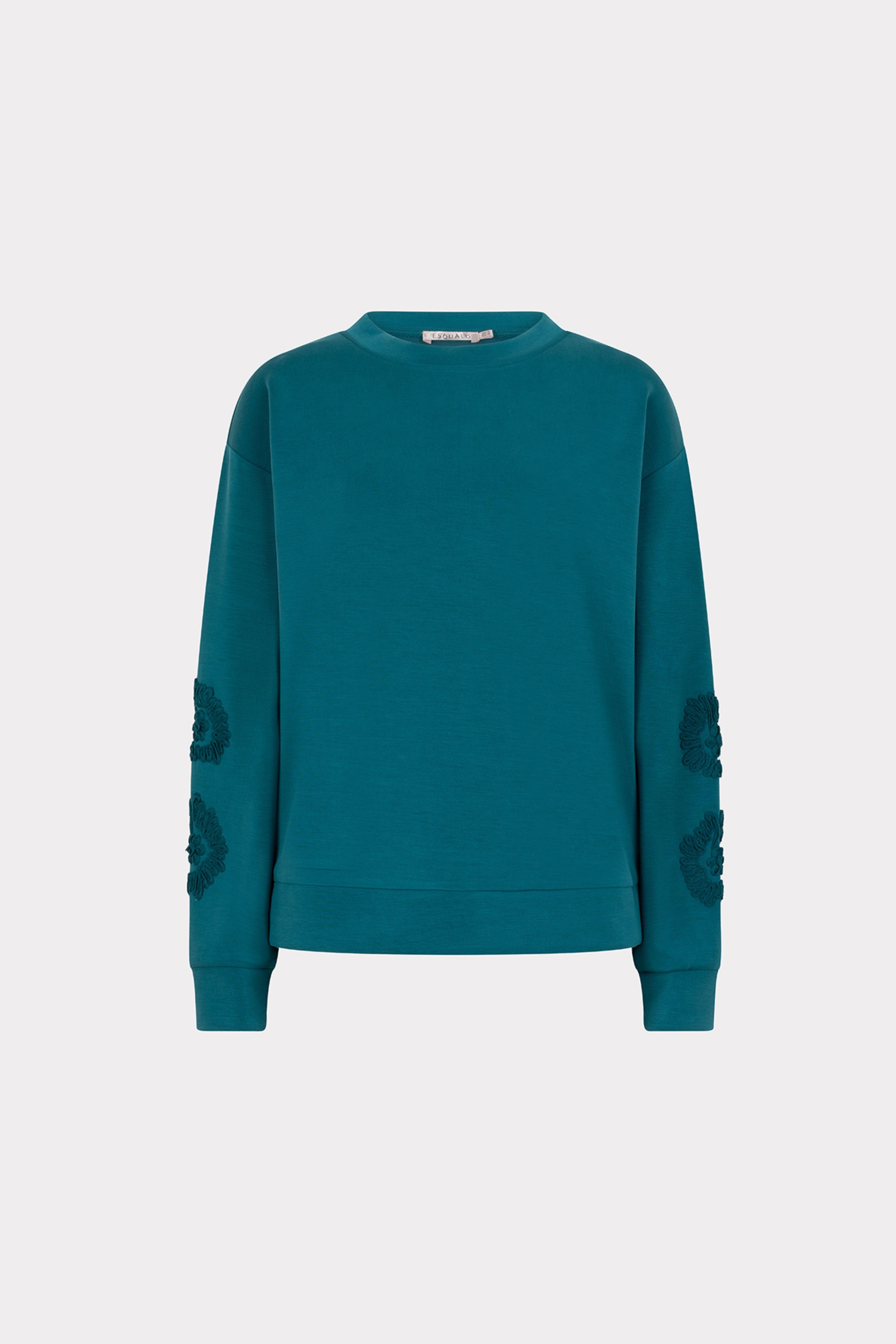 De Sweater Tape Embroidery Modal Teal van Esqualo is een comfortabele en stijlvolle trui die ideaal is voor zowel een casual dag als een chique gelegenheid. De sweater is voorzien van subtiele borduursels op de mouwen voor een verfijnde touch.