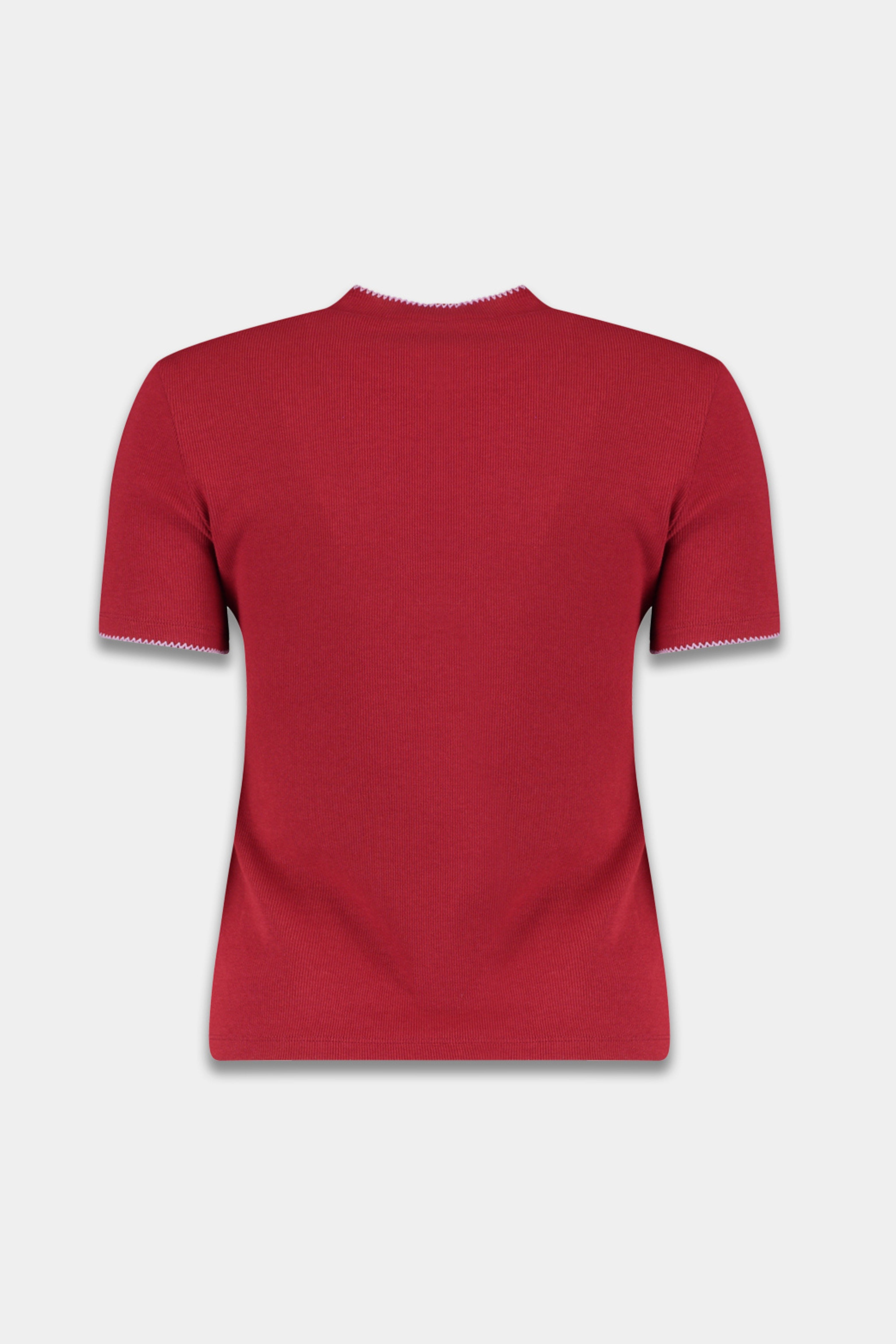 Het Cammy T-shirt in Ruby Red van Harper & Yve is een sportieve basic met karakter. De ribstof, witte contraststiksels en het subtiele geborduurde logo op de borst zorgen voor een moderne, casual uitstraling. Dit T-shirt combineert comfort met stijl en is een veelzijdige toevoeging aan je garderobe.