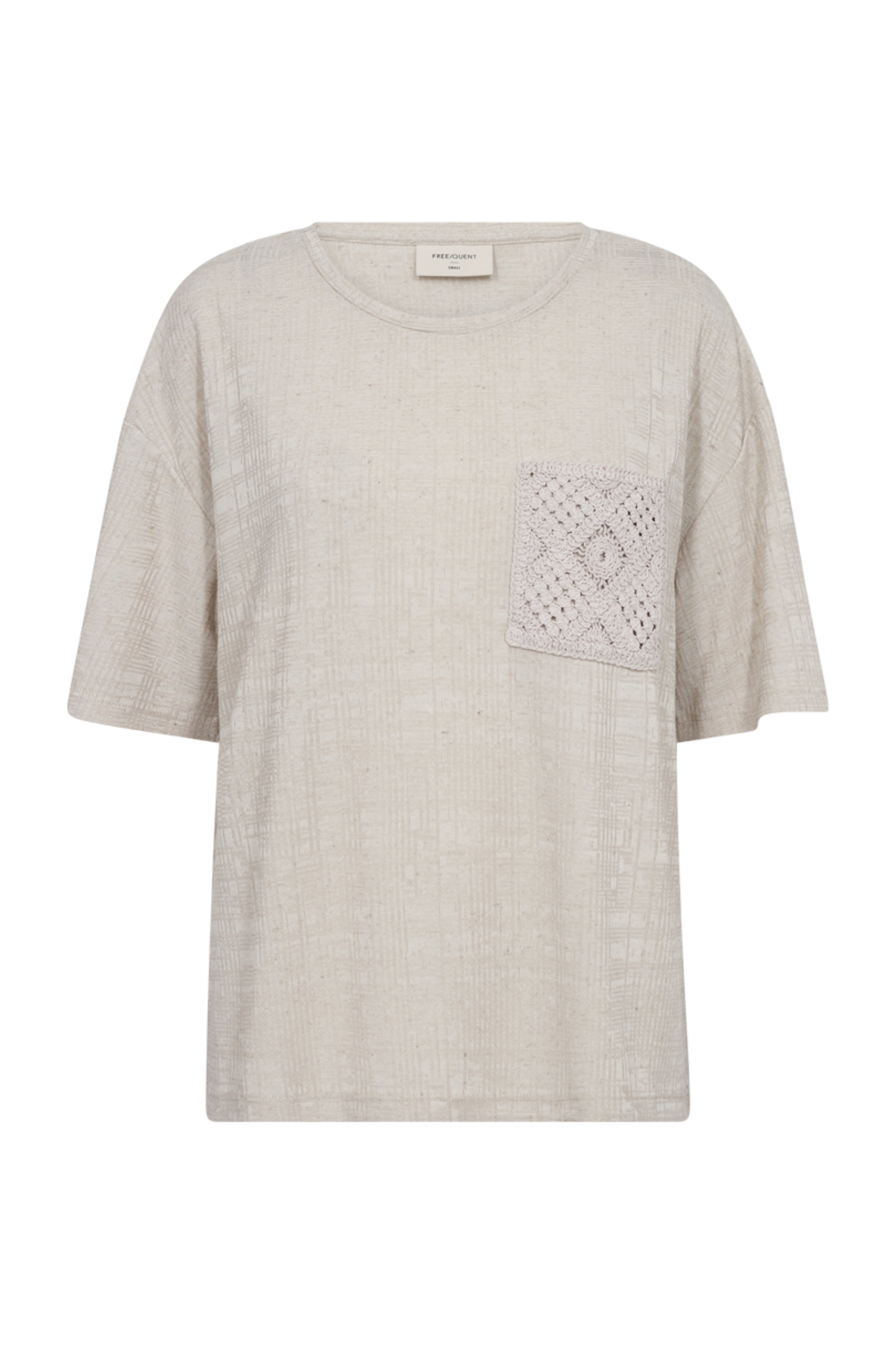 Het T-shirt Fqlyla Tee Moonbeam Melange van Freequent is een stijlvolle en casual must-have. De zachte melange stof geeft een subtiele textuur, terwijl de gehaakte borstzak zorgt voor een speelse, bohemian touch. De losse pasvorm en korte mouwen maken dit shirt perfect voor een relaxte en trendy look.