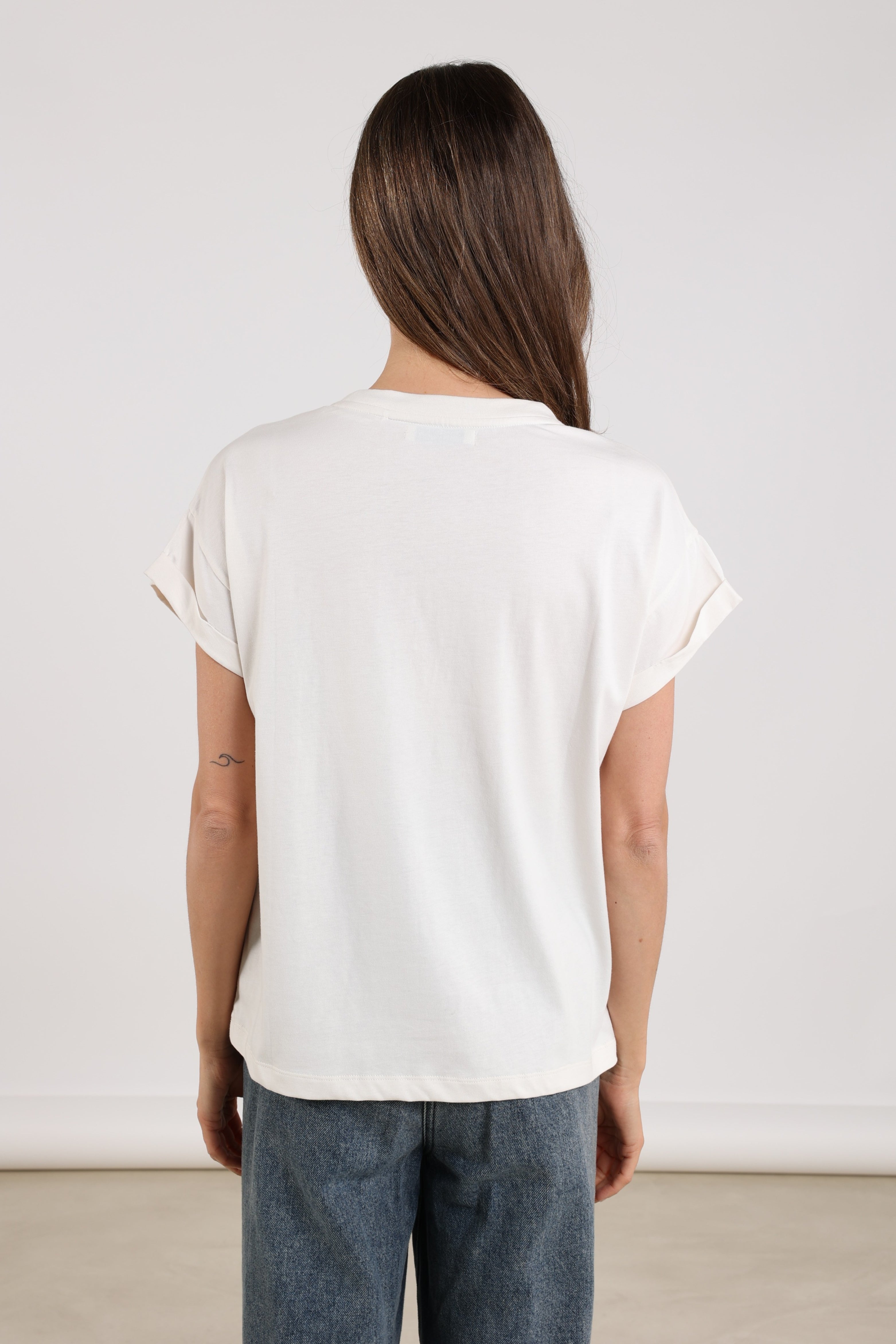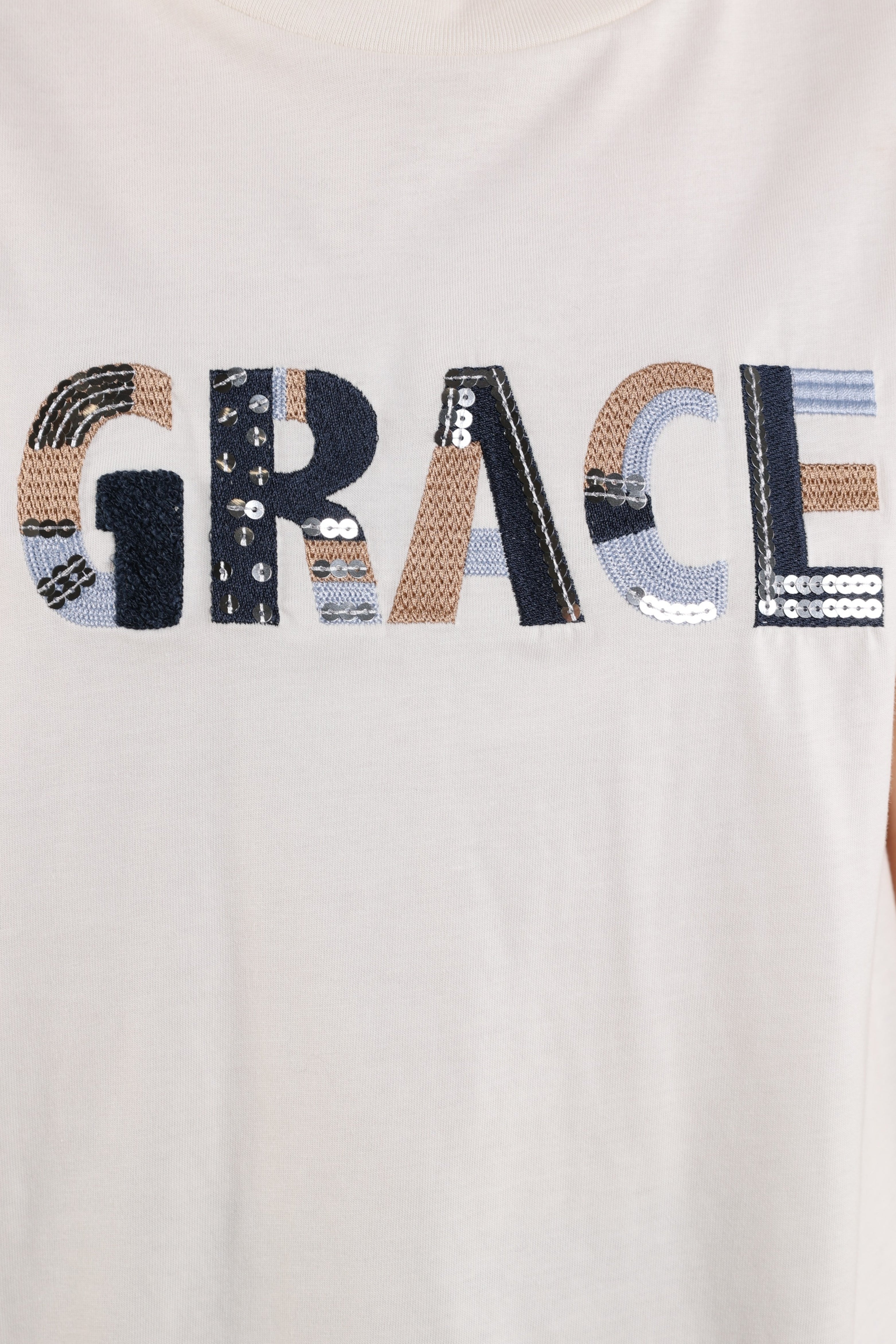 Het T-shirt Grace Offwhite Navy van Nukus heeft een frisse offwhite kleur met een opvallende 'GRACE'-print in blauw en beige tinten. Een casual basic met een stijlvolle twist.