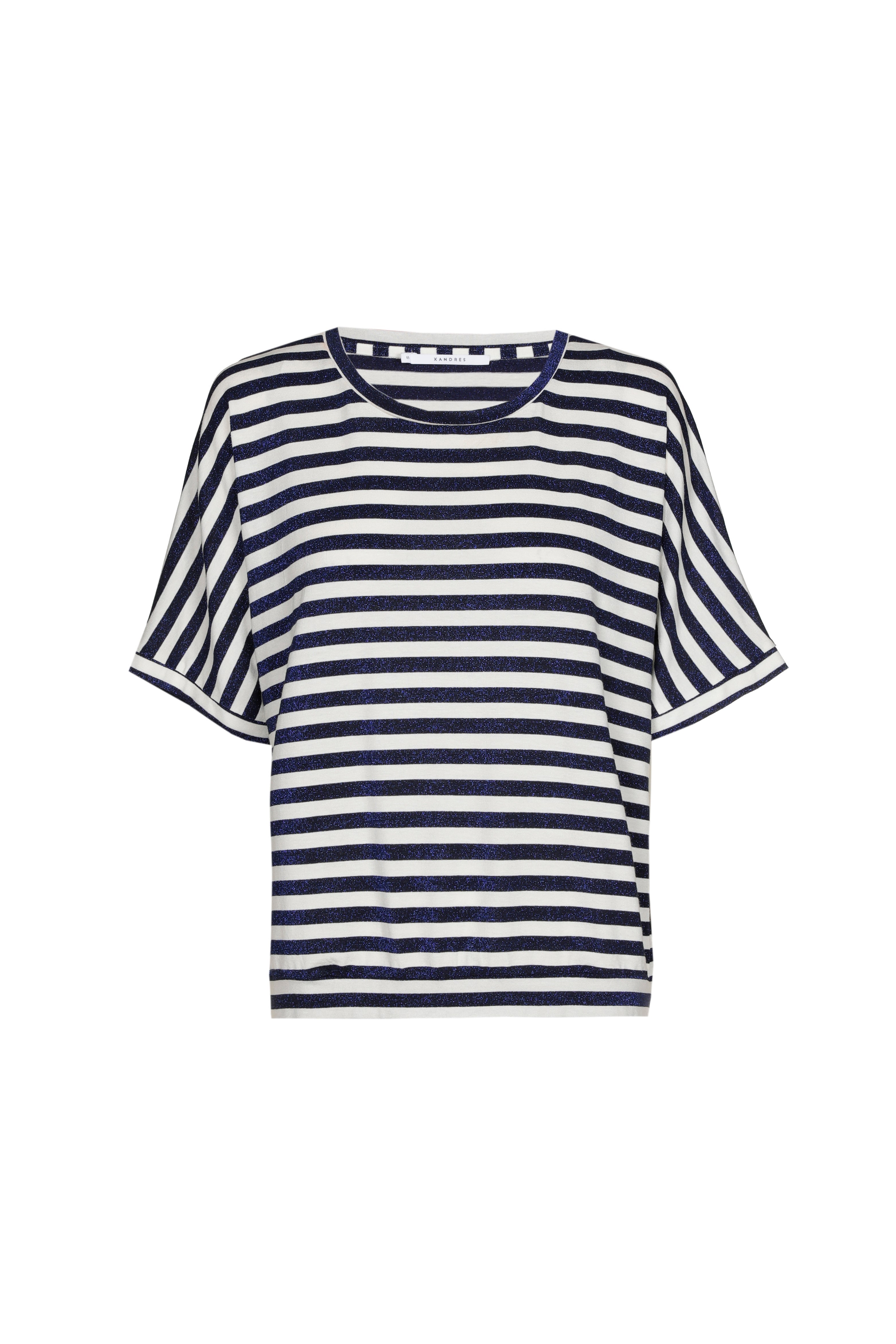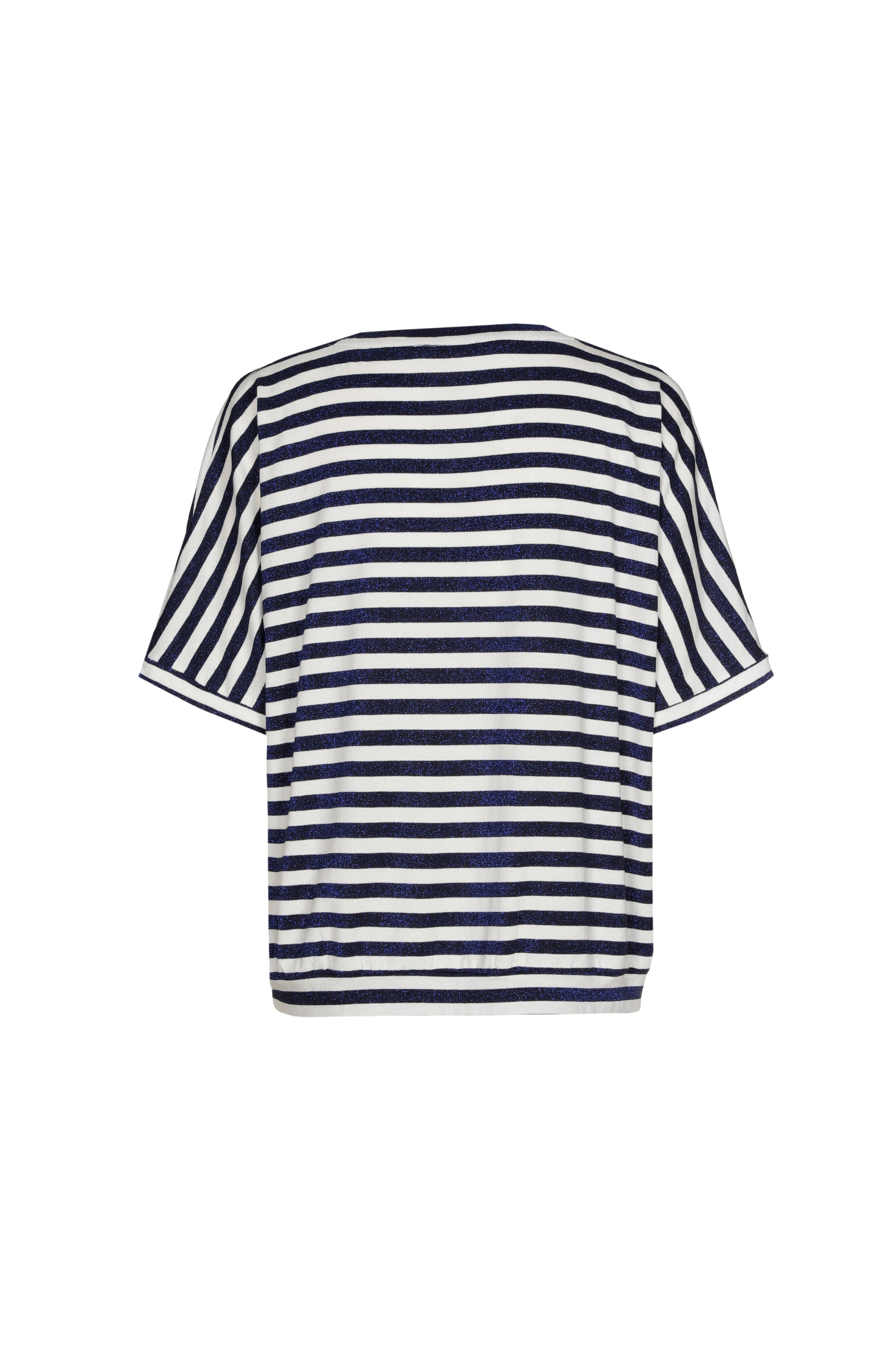 Het T-shirt Hirokar Navy van Xandres combineert een tijdloos streeppatroon met een subtiele shimmer. De losvallende fit en zachte stof zorgen voor een comfortabele, stijlvolle look die moeiteloos chic oogt.