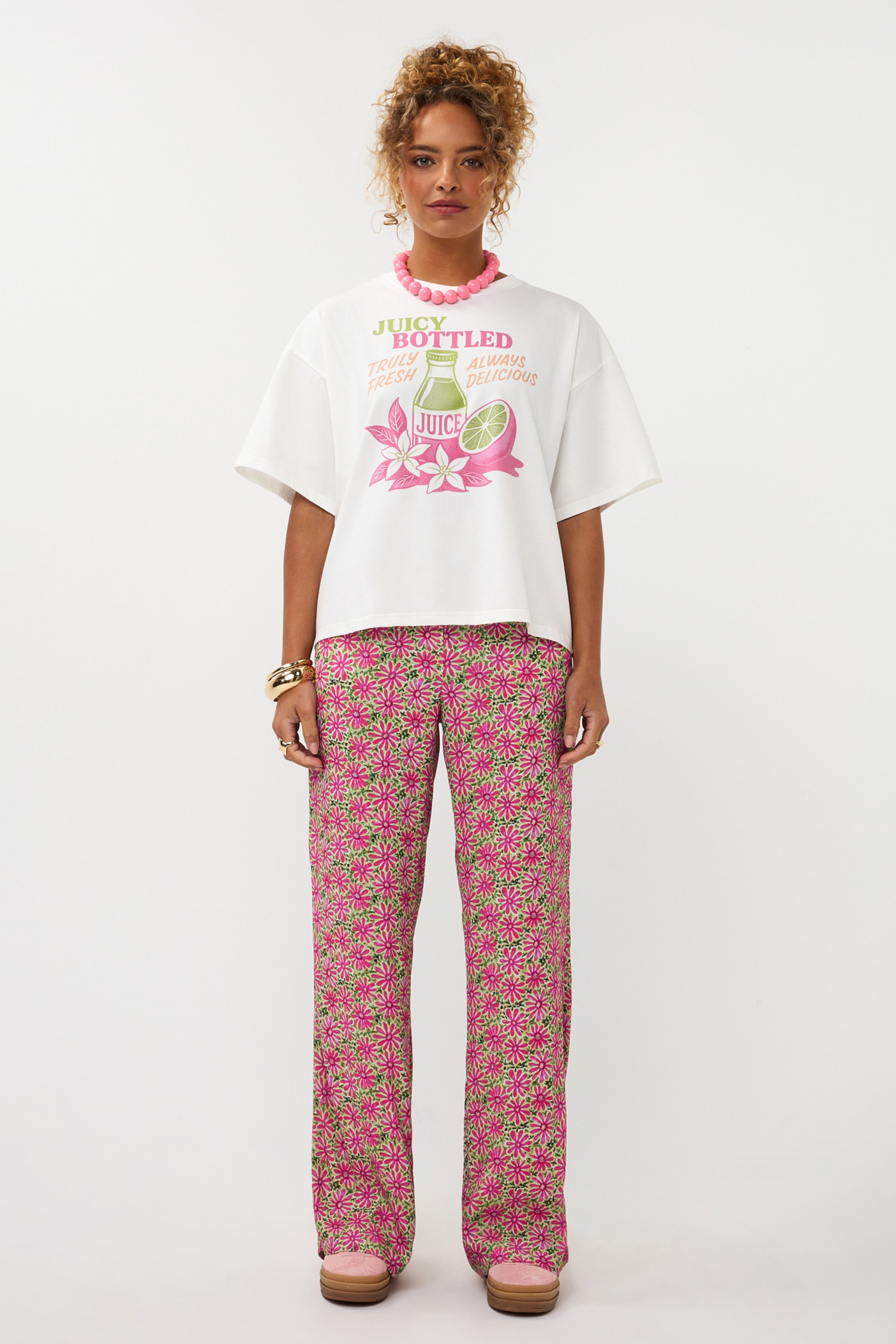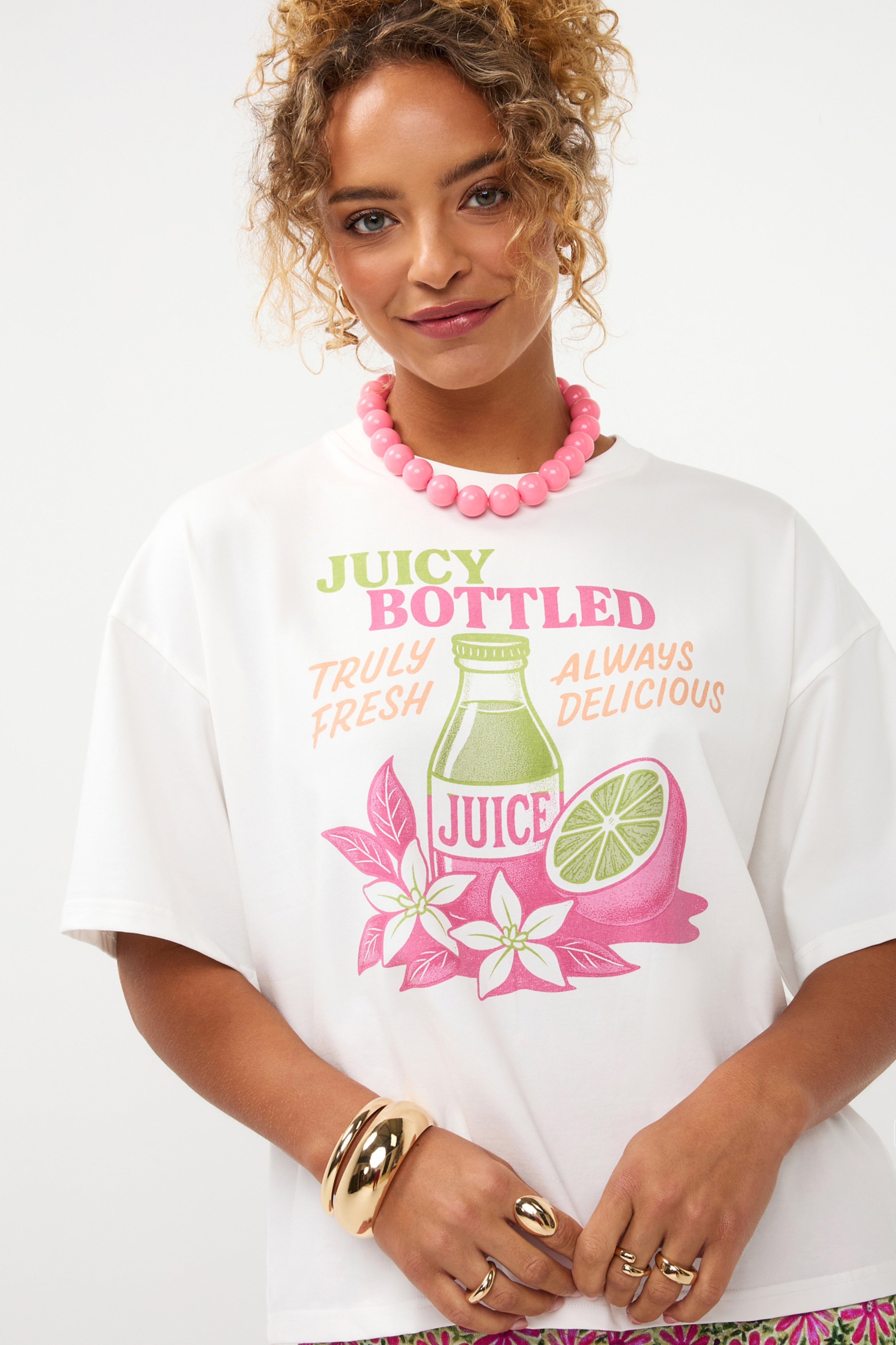 Het T-shirt Juicy Bottle Berry Pink is een speelse eyecatcher met een frisse graphic print. De zachte witte basis, relaxte fit en kleurrijke juice-illustratie geven dit shirt een vrolijke twist die perfect past bij een casual najaarslook.