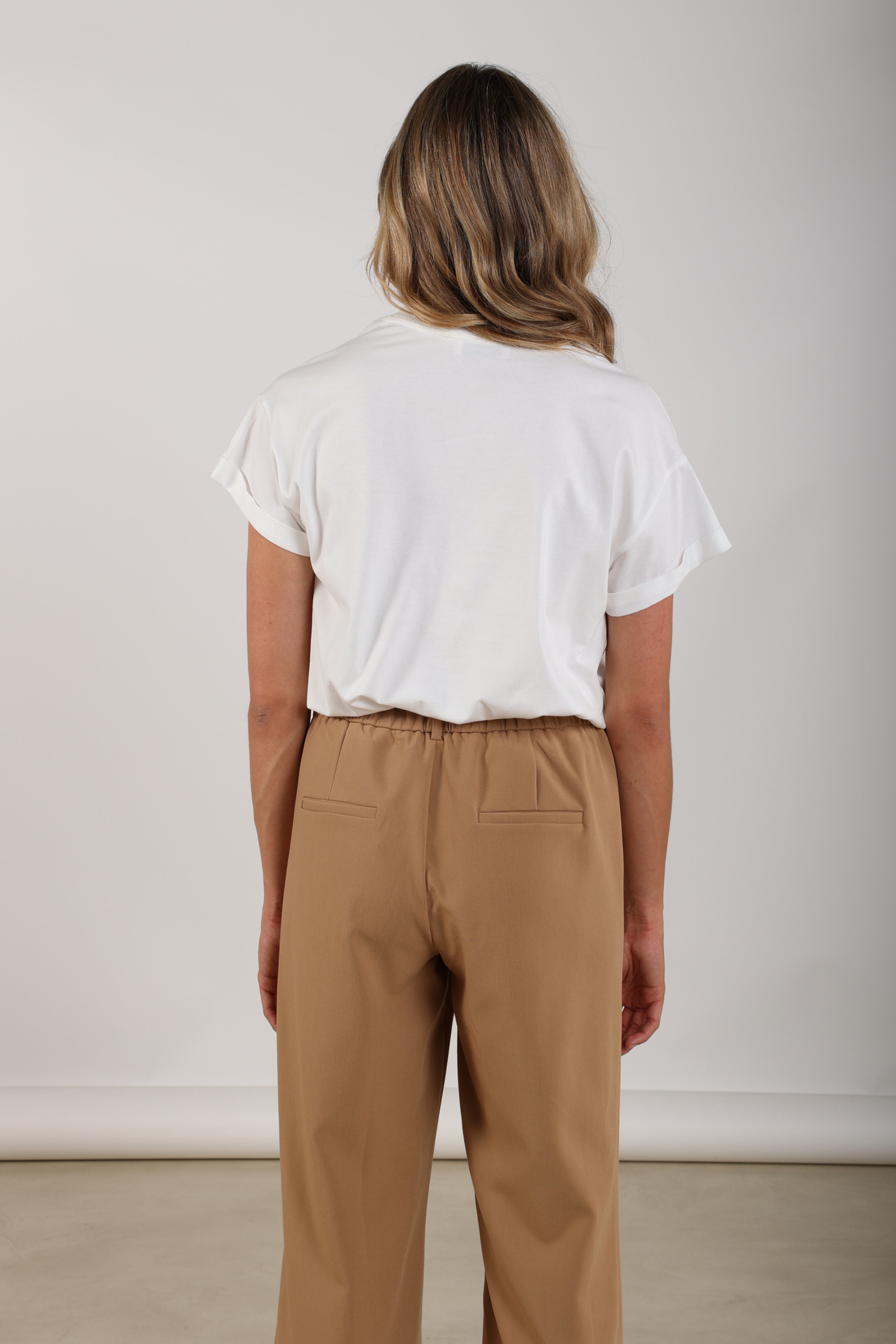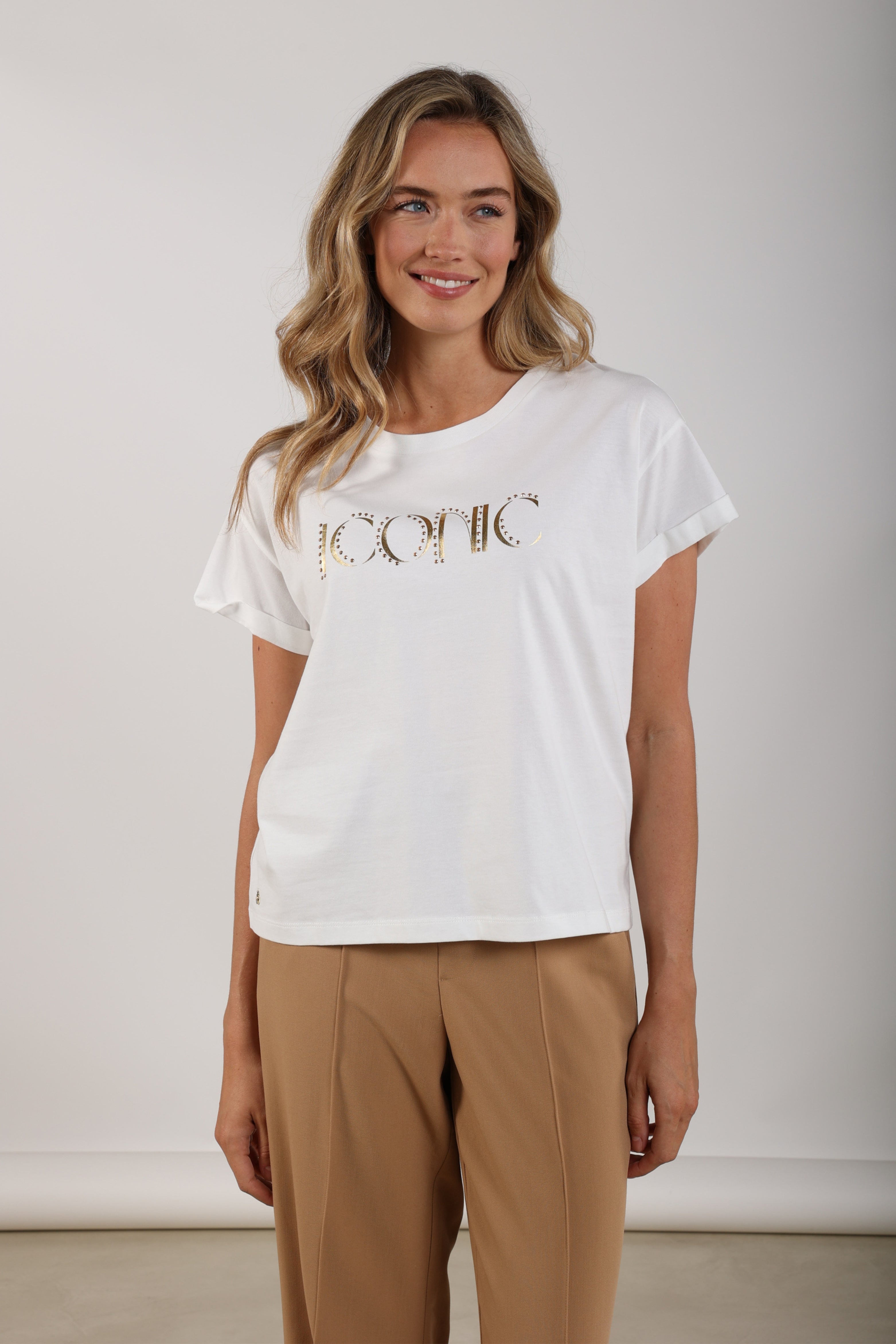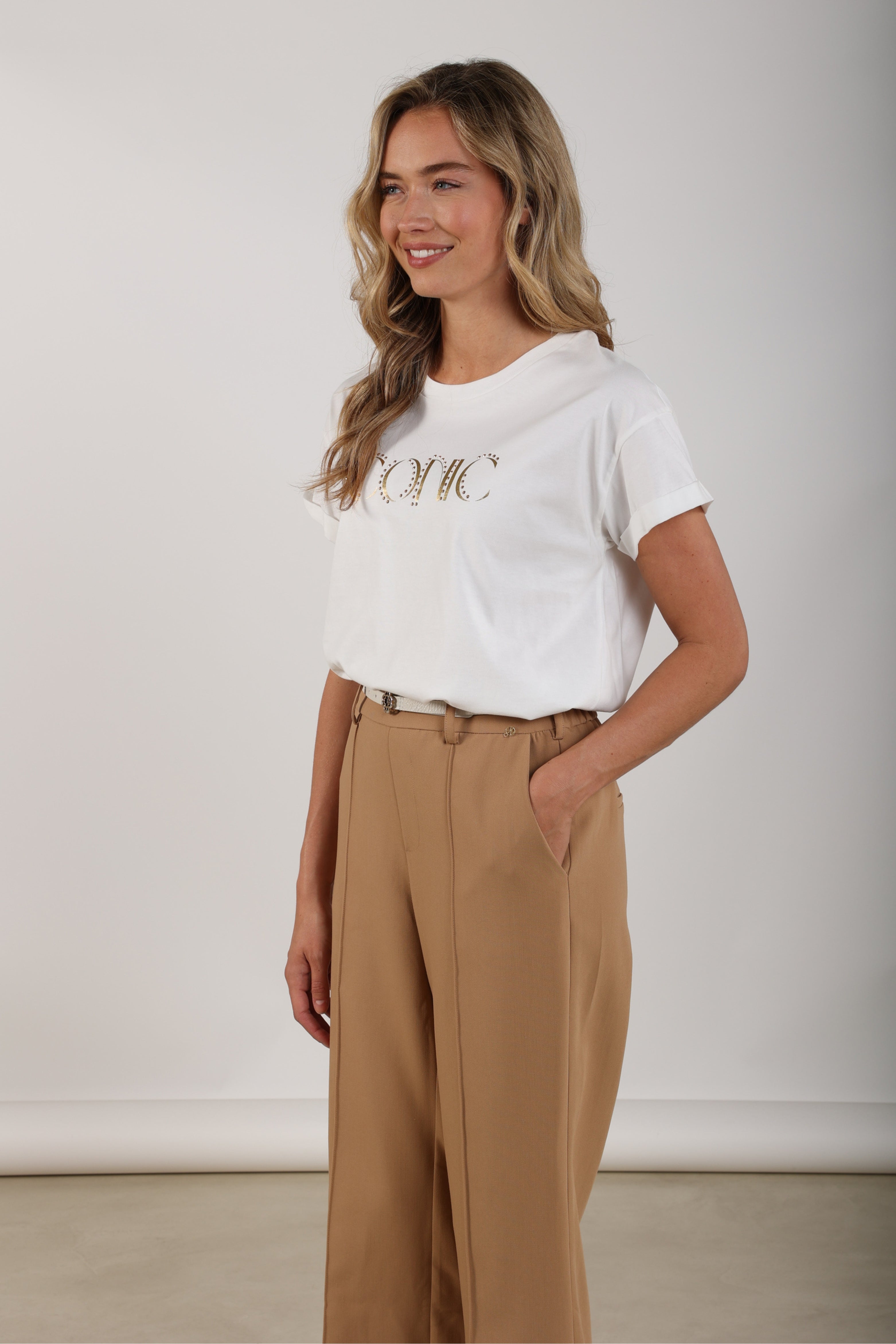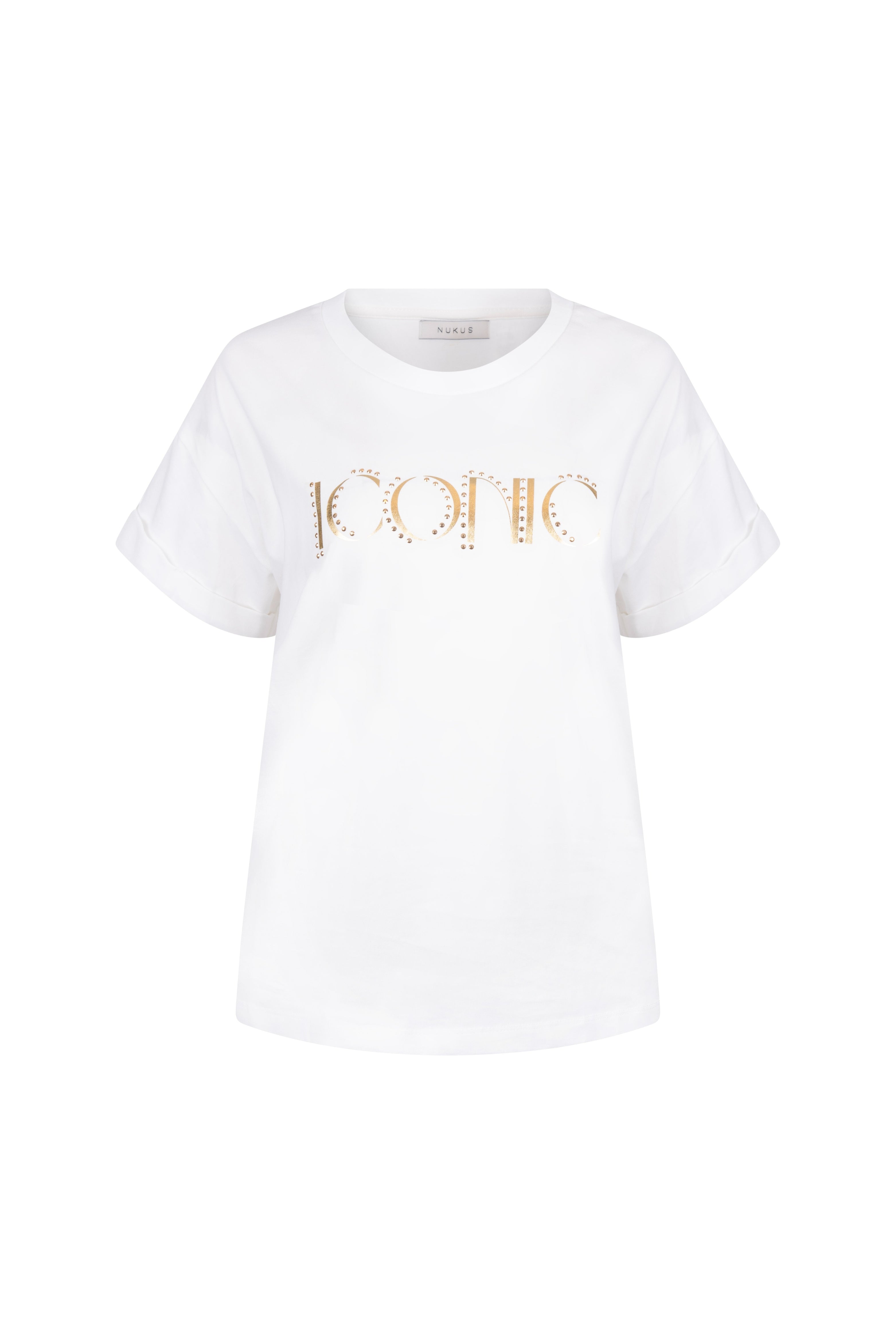 De T-shirt Reese Iconic Offwhite Gold van Nukus is een stijlvolle basic met luxe uitstraling. Het gouden ‘Iconic’-logo met subtiele studs geeft dit shirt een trendy touch. Perfect om casual te combineren met een jeans of blazer.