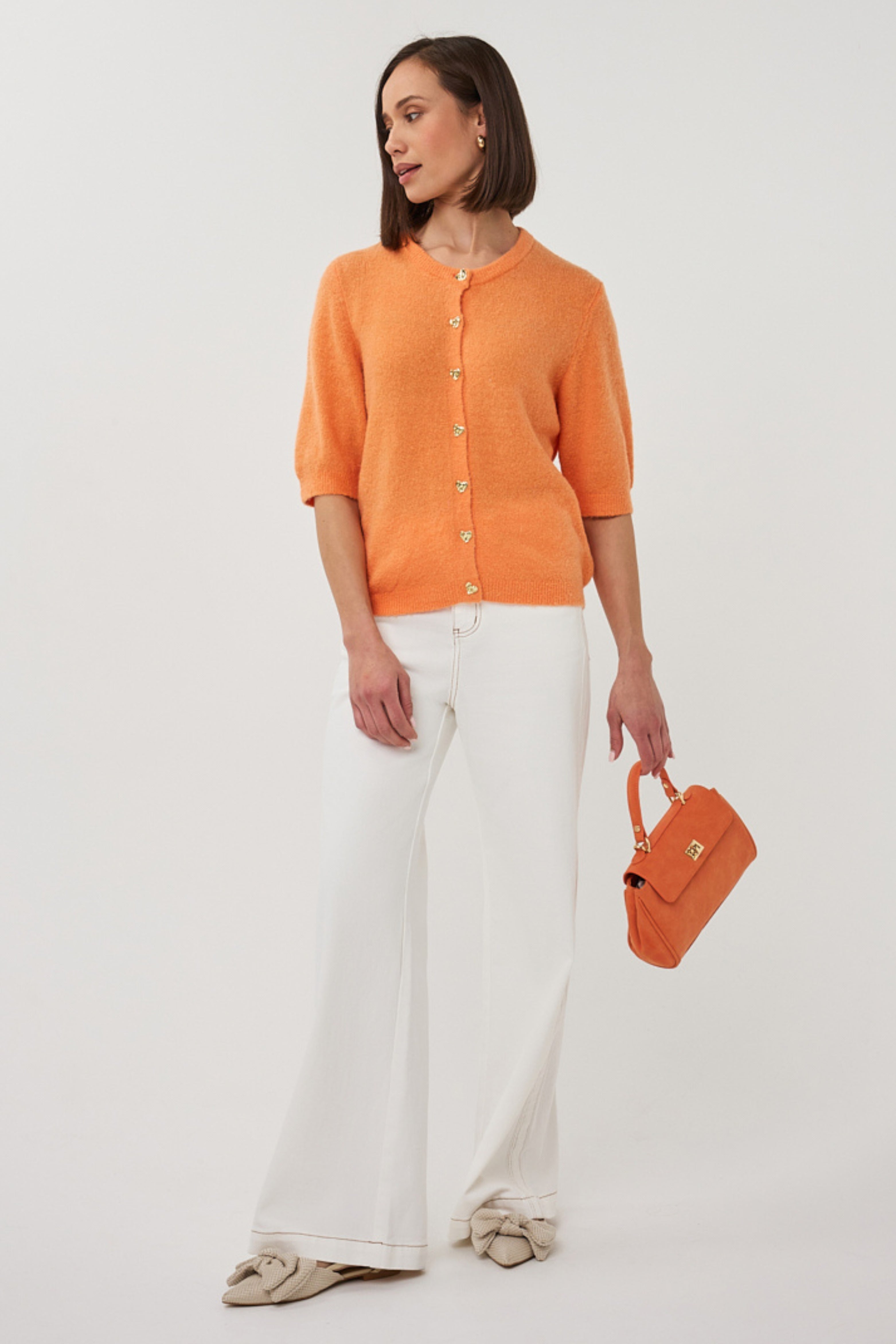 • Het ecom model combineert de tas met een oranje knit en een witte wide-leg broek voor een frisse, ton-sur-ton look met een chique touch.