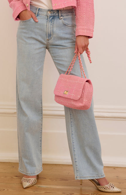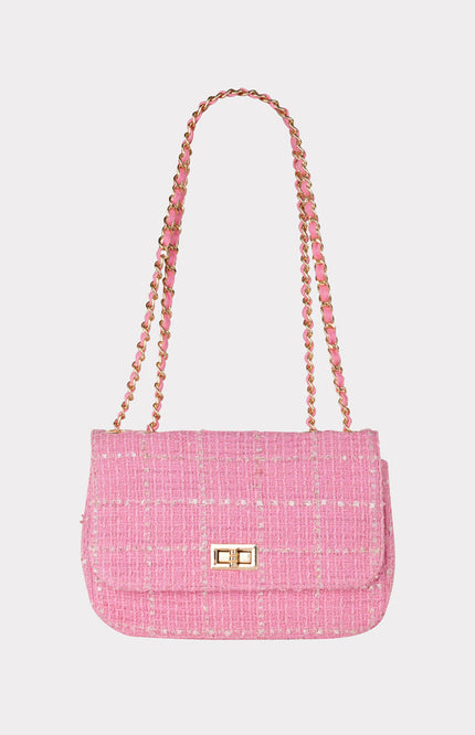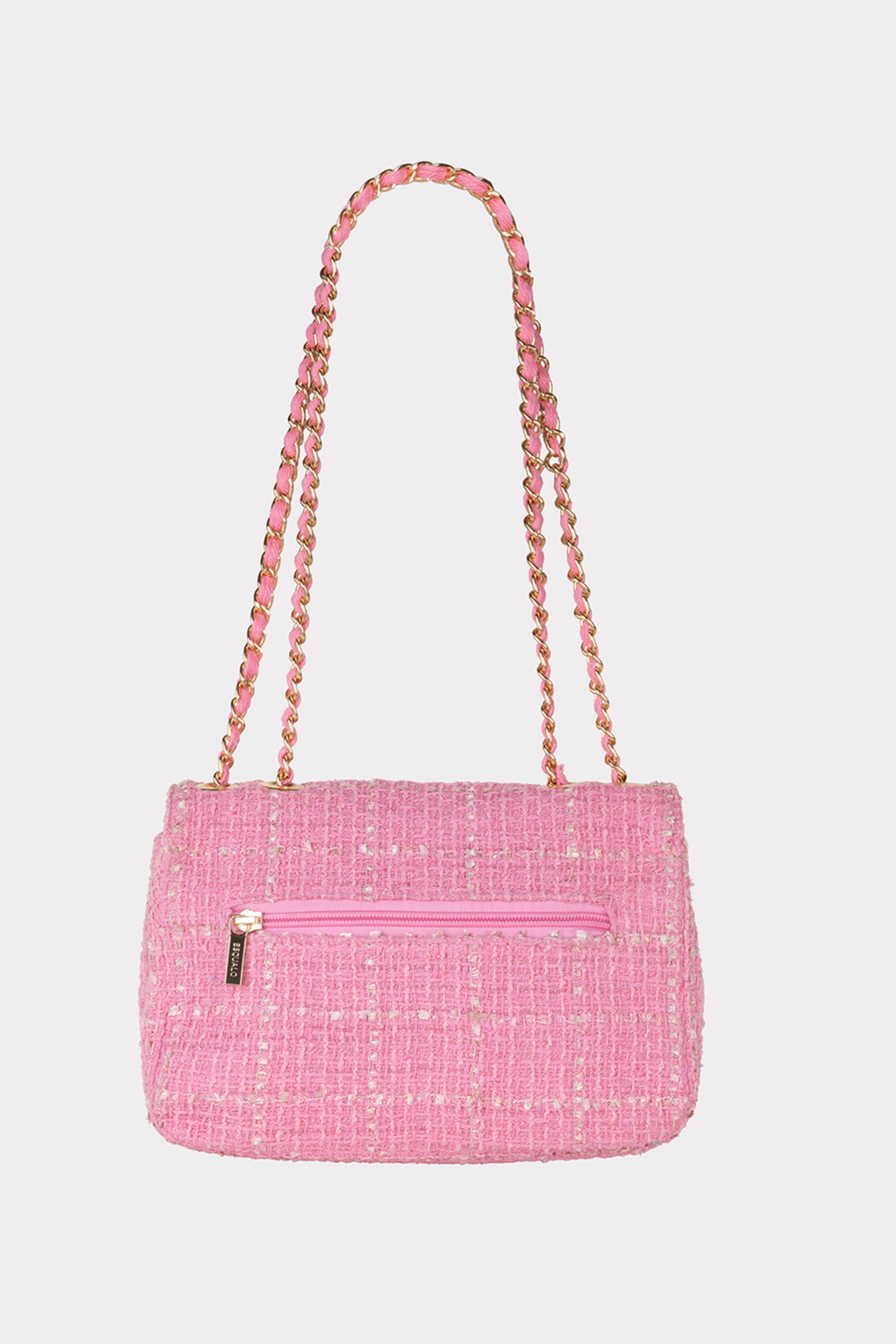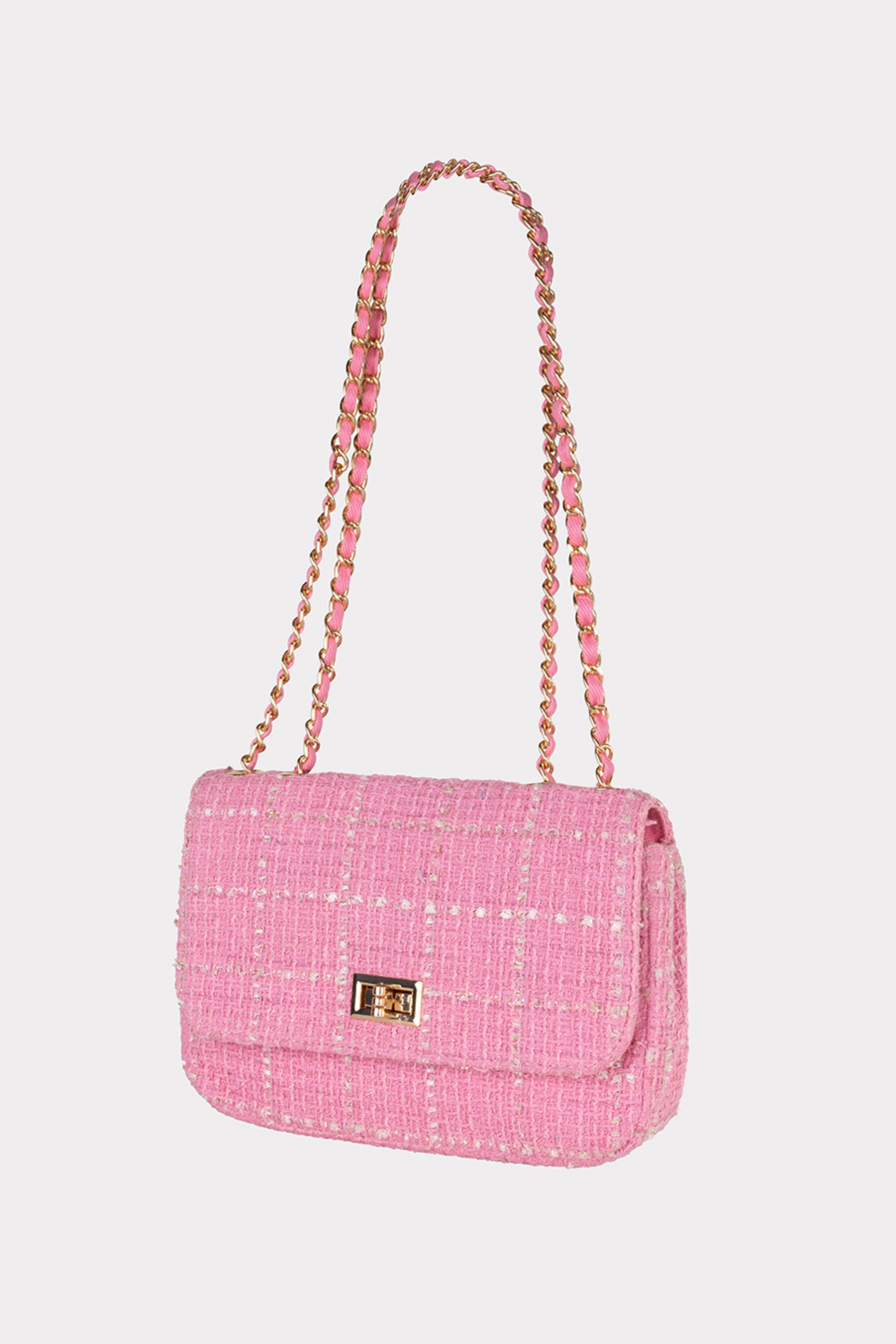 De Esqualo Tweed Tas - Rose is een elegante schoudertas met een luxe tweed afwerking en goudkleurige kettingband. De perfecte mix van klassiek en trendy, ideaal voor elke chique of casual outfit!