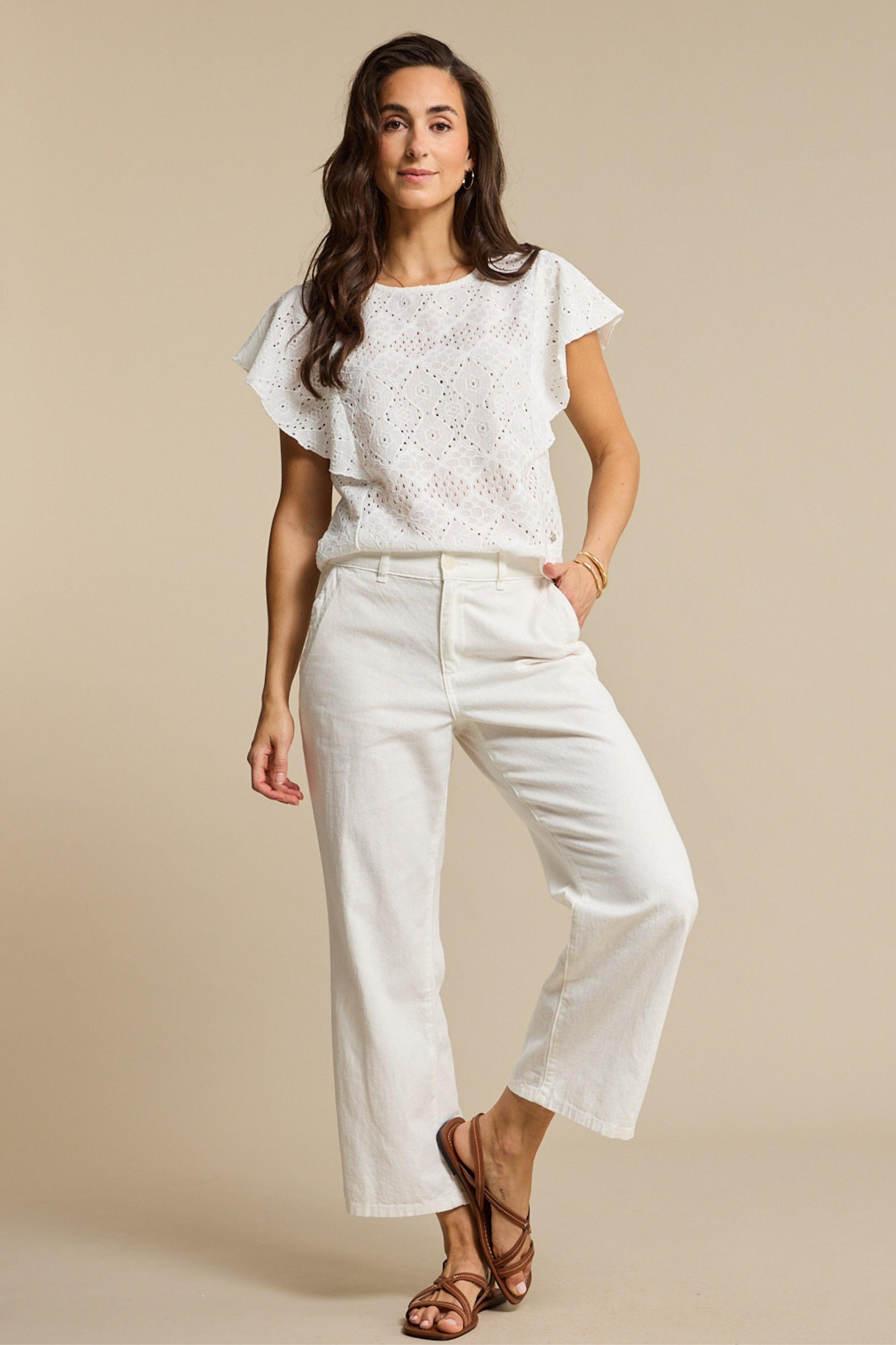 De Top Ajour Ruffle Sleeve Ecru van Red Button is een vrouwelijke top met een verfijnde ajourstructuur en speelse ruffle mouwen. De lichte stof en zachte kleur geven dit item een elegante, zomerse uitstraling.