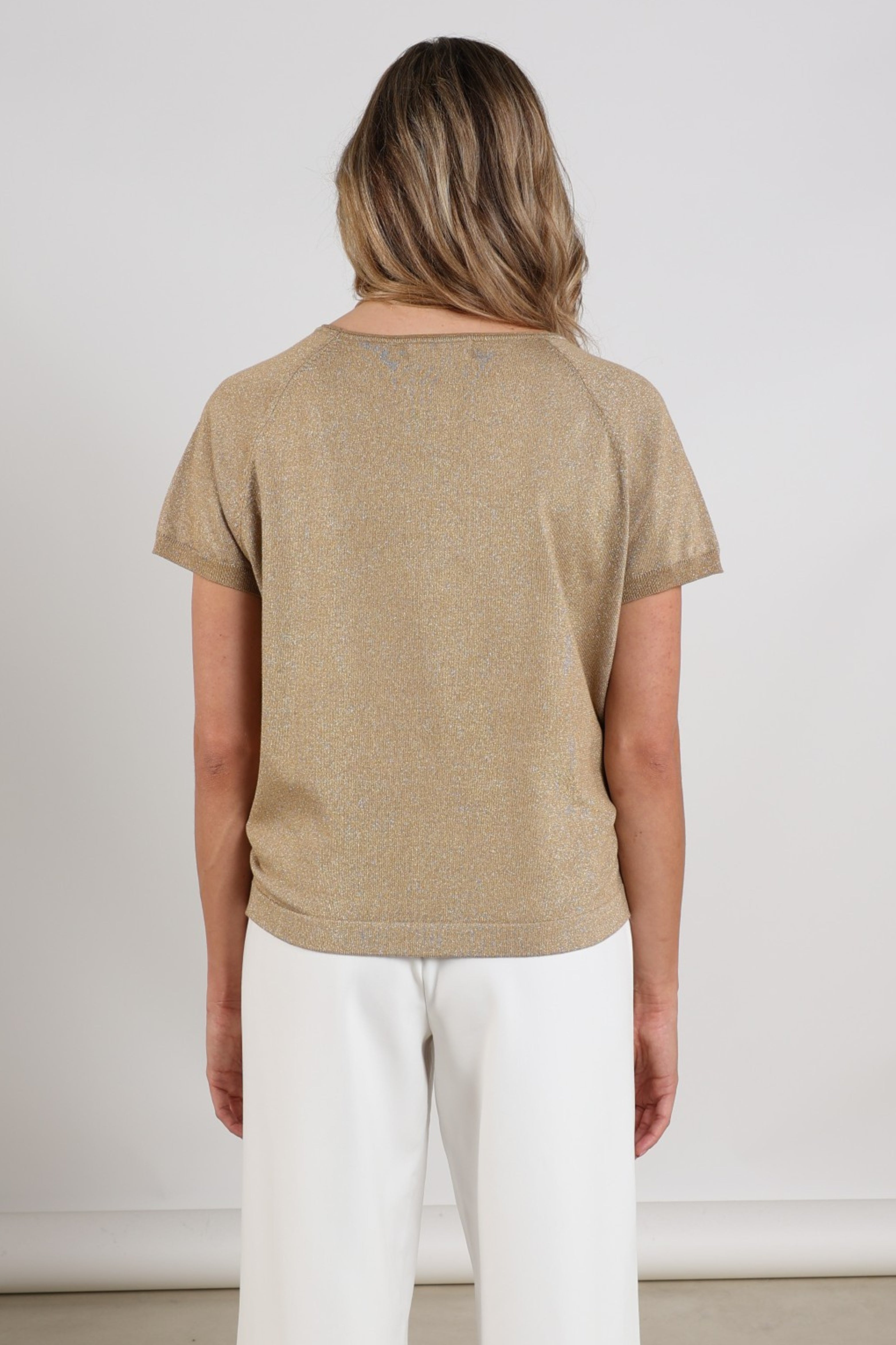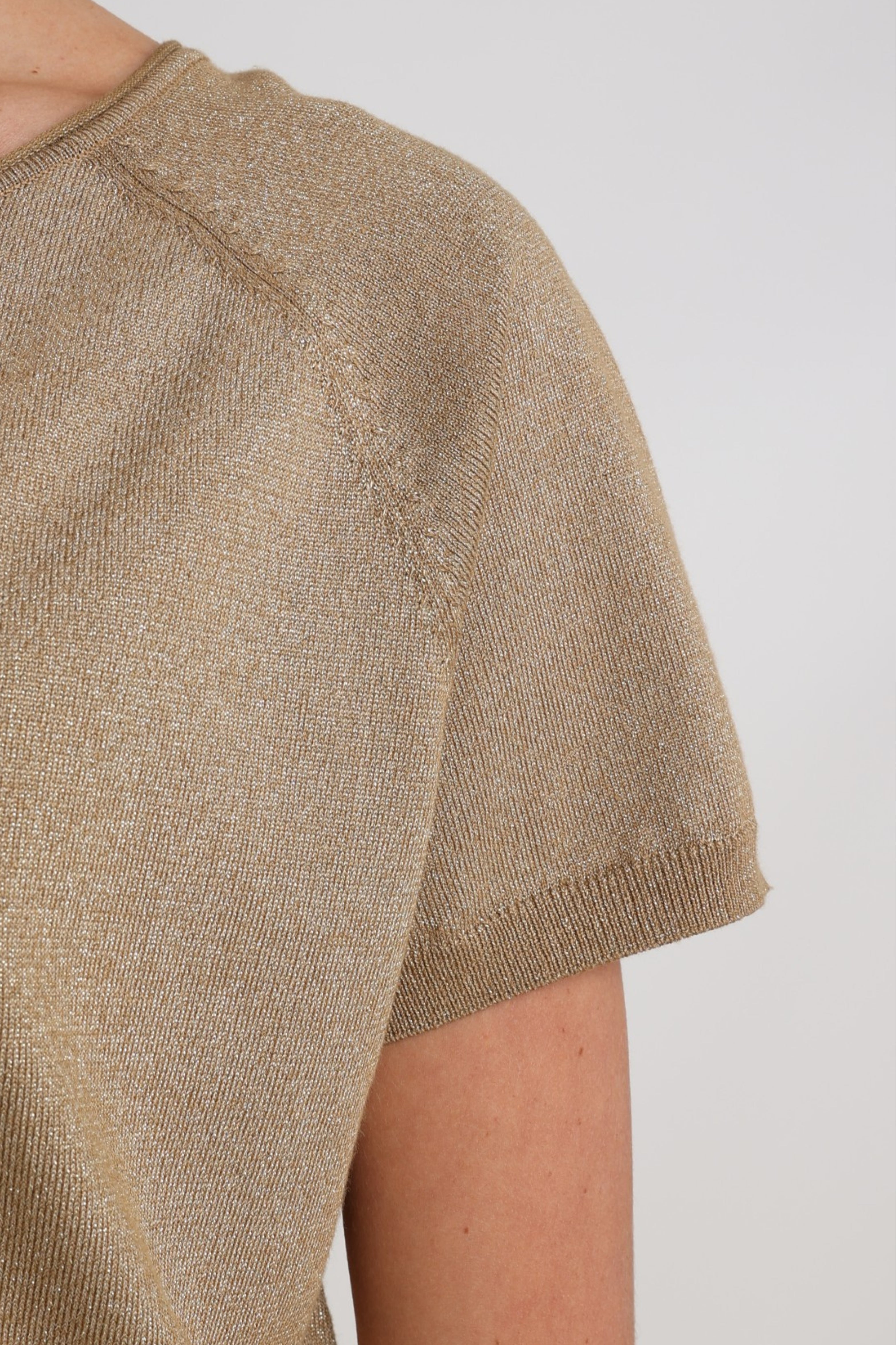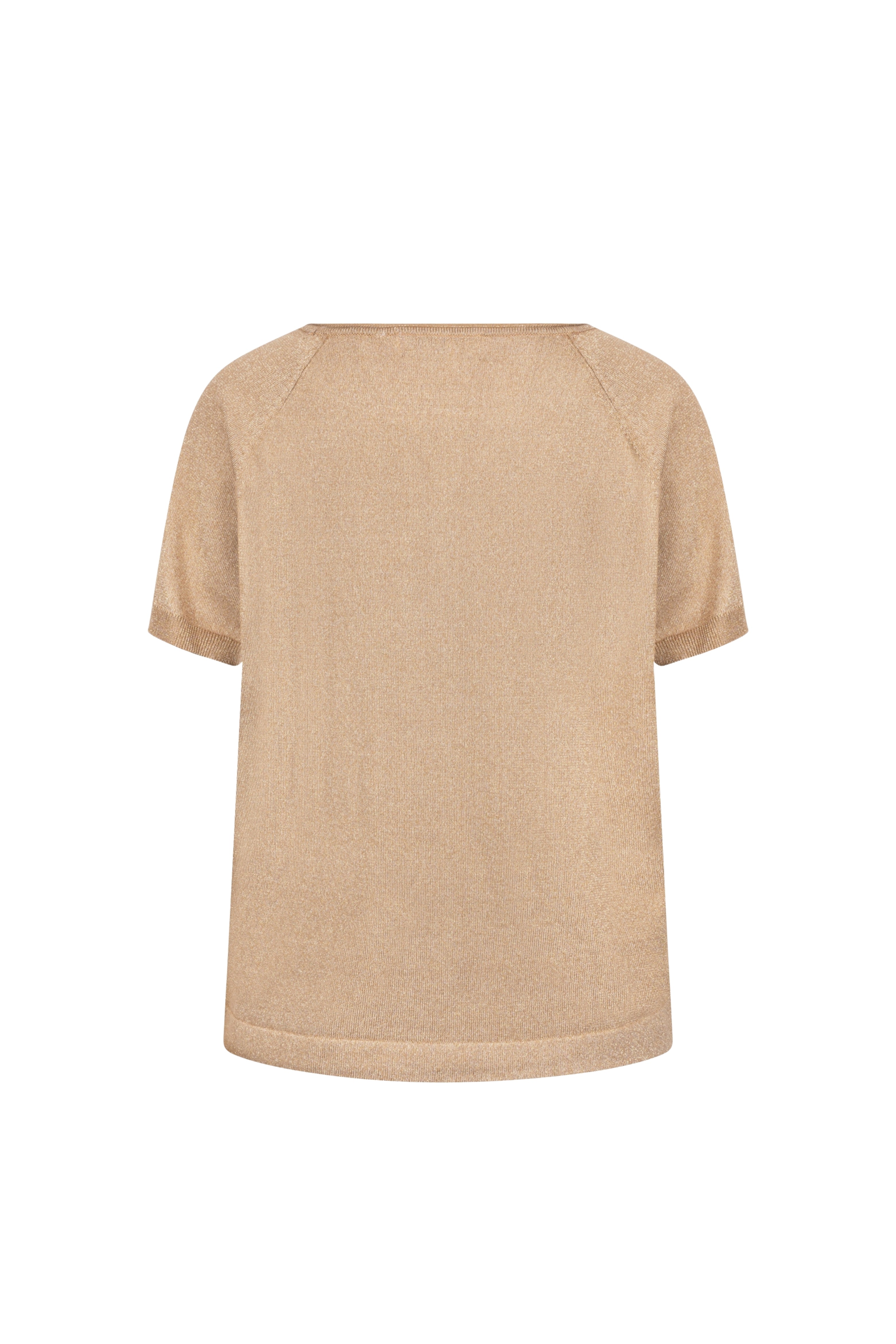 De Top Anita Lurex Camel van Nukus is een veelzijdige knit top met korte mouwen en een subtiele glans. Een tijdloos item dat eenvoudig te combineren is, het hele seizoen door.