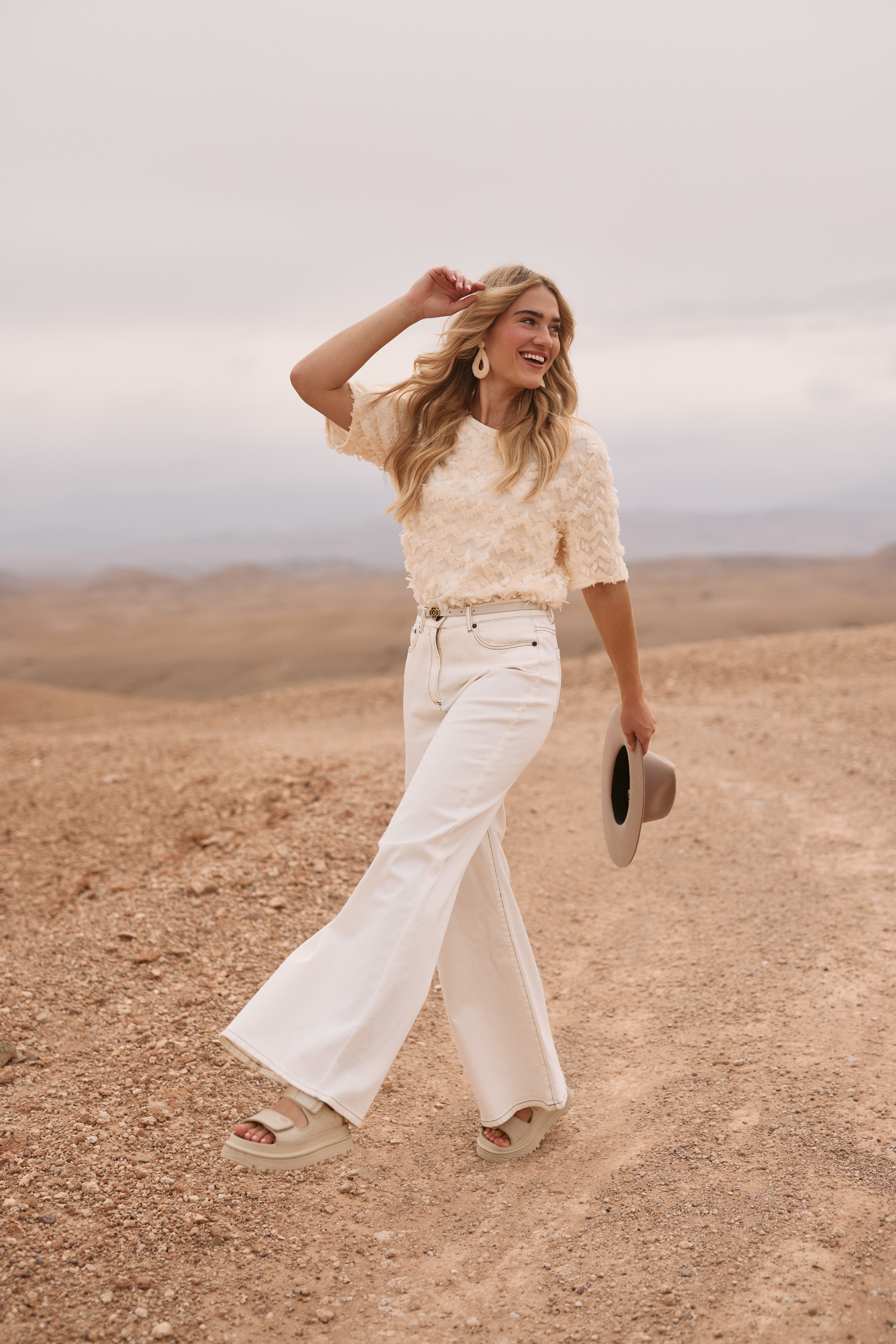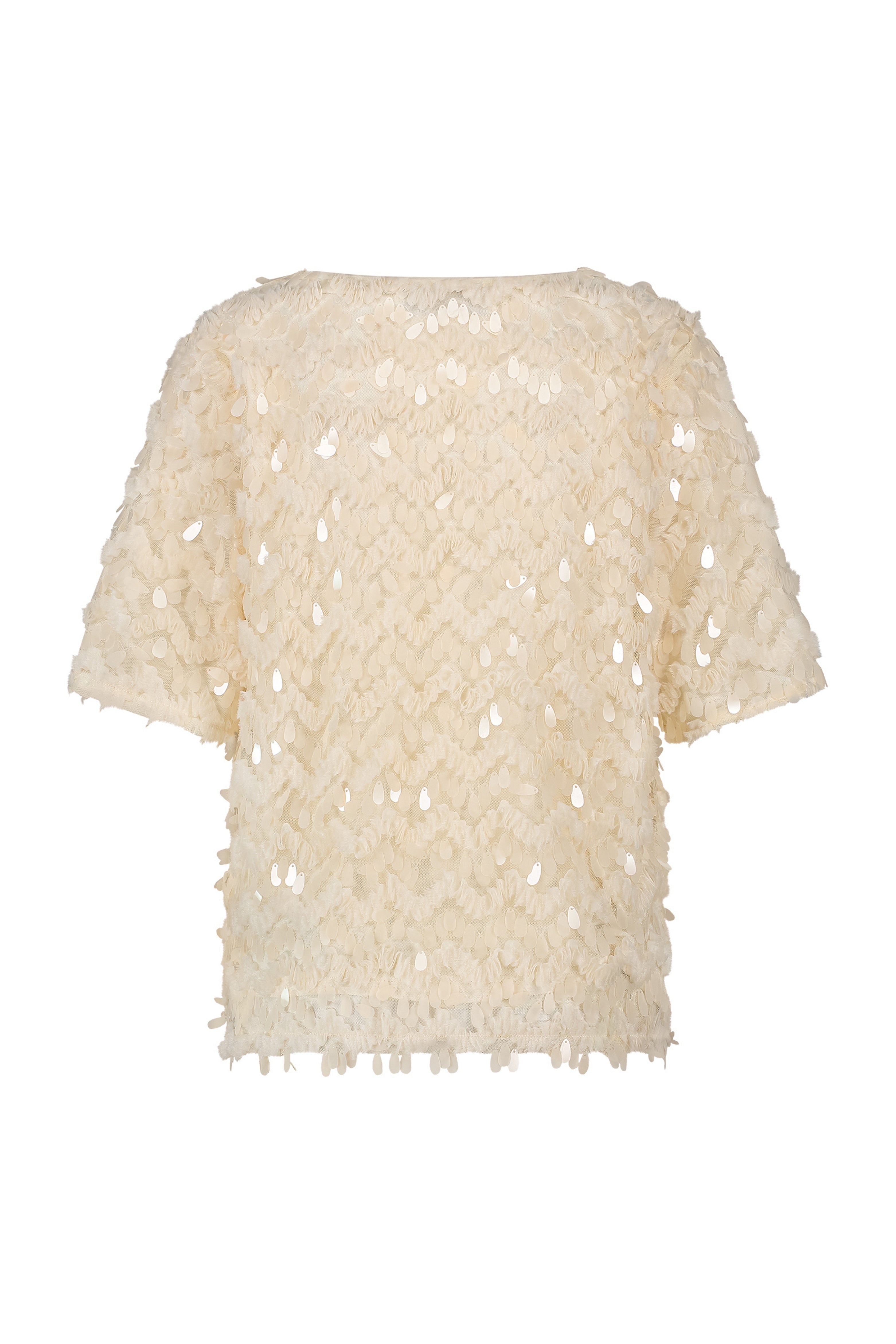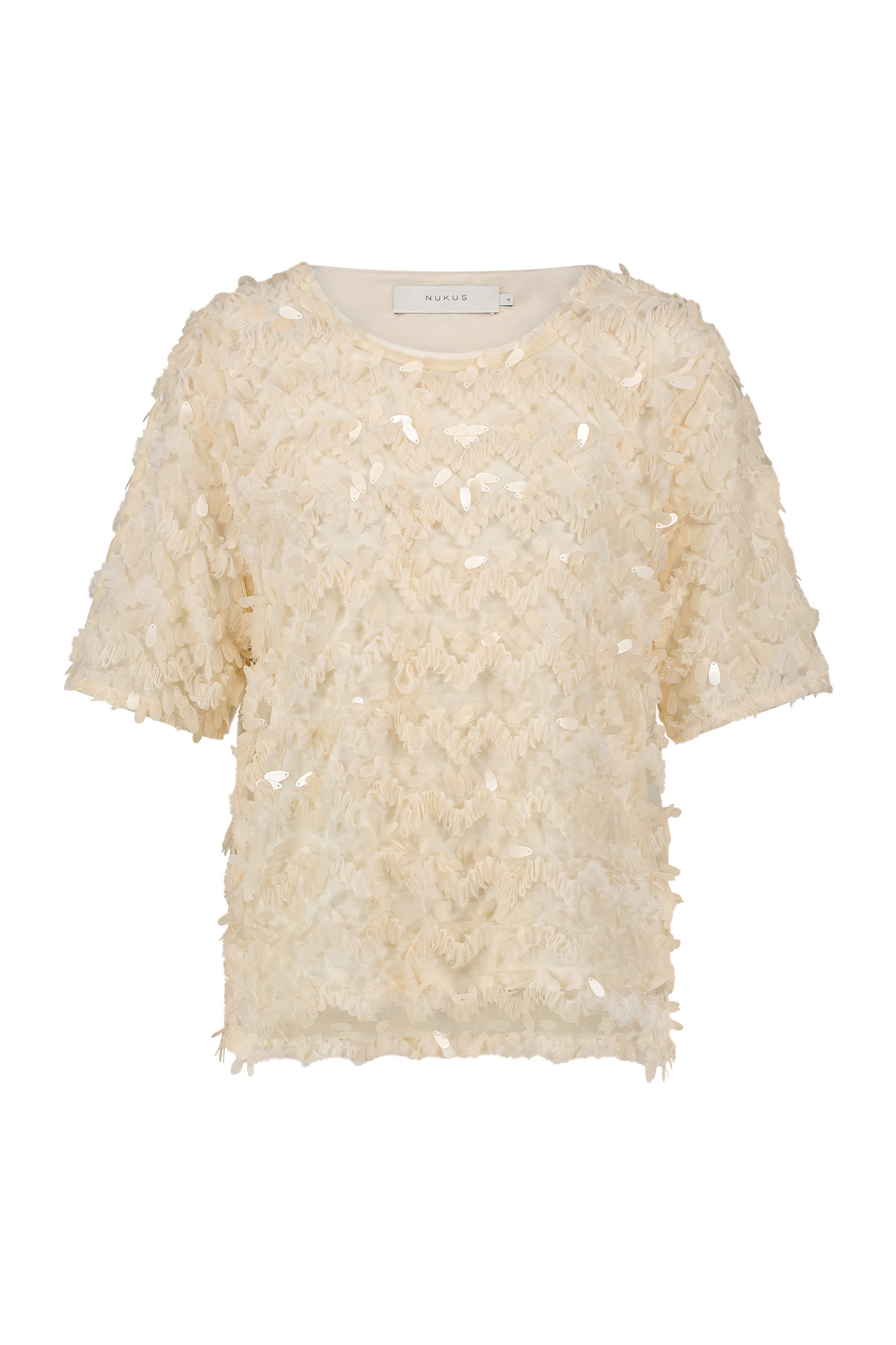 De NUKUS Top Aria Lace is een unieke en stijlvolle toevoeging aan jouw garderobe. Deze prachtige top in een zachte off-white tint is een toonbeeld van verfijning en romantiek. De delicate kantlaag is versierd met speelse bloemenaccenten en glinsterende pailletten, waardoor een luxueuze uitstraling ontstaat.