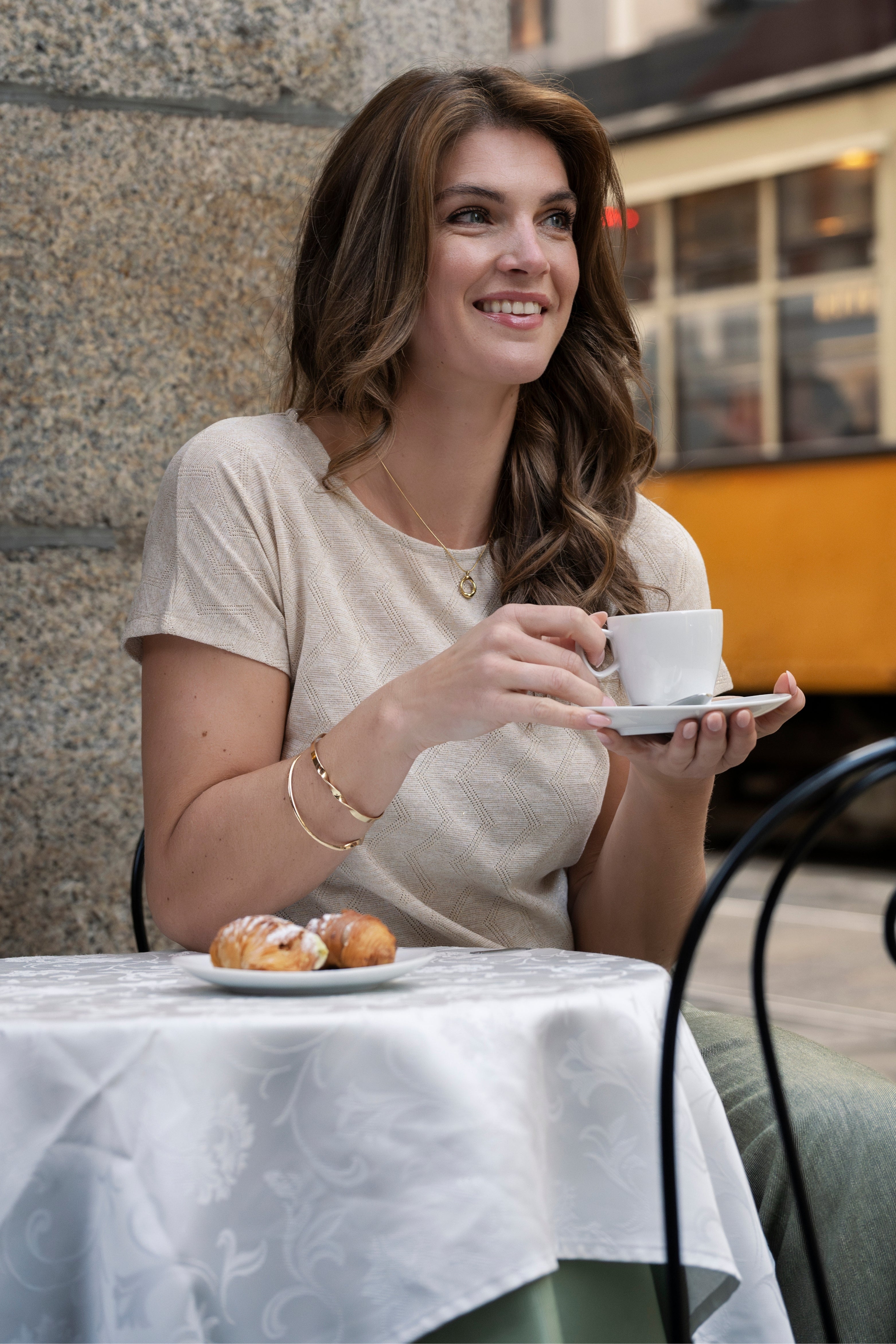 De Top Artemis Gold van Elvira is een stijlvolle en comfortabele top met subtiele structuur en glanzende lurex. De strikkoord-detail aan de onderkant geeft een speelse, vrouwelijke touch aan elke outfit.