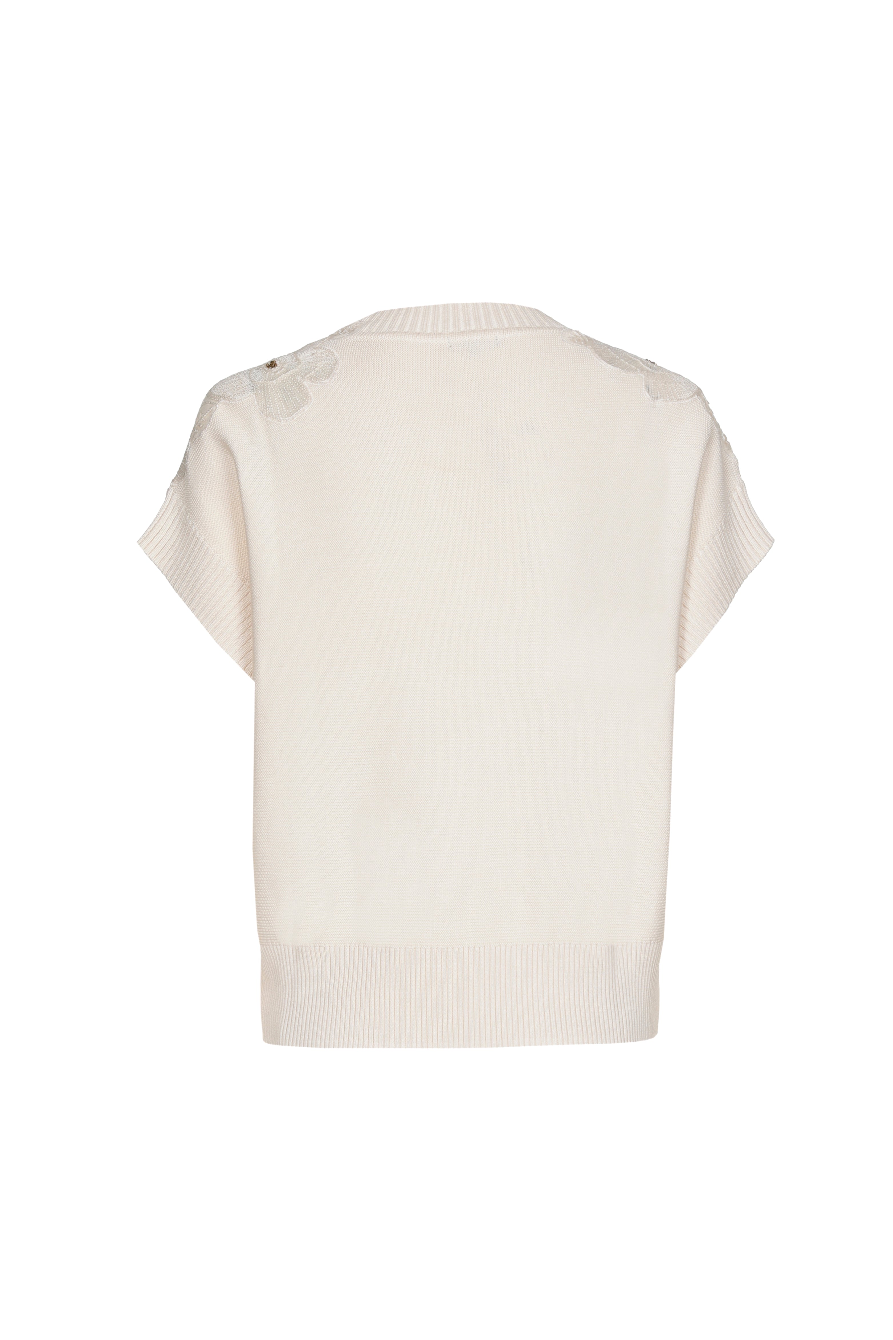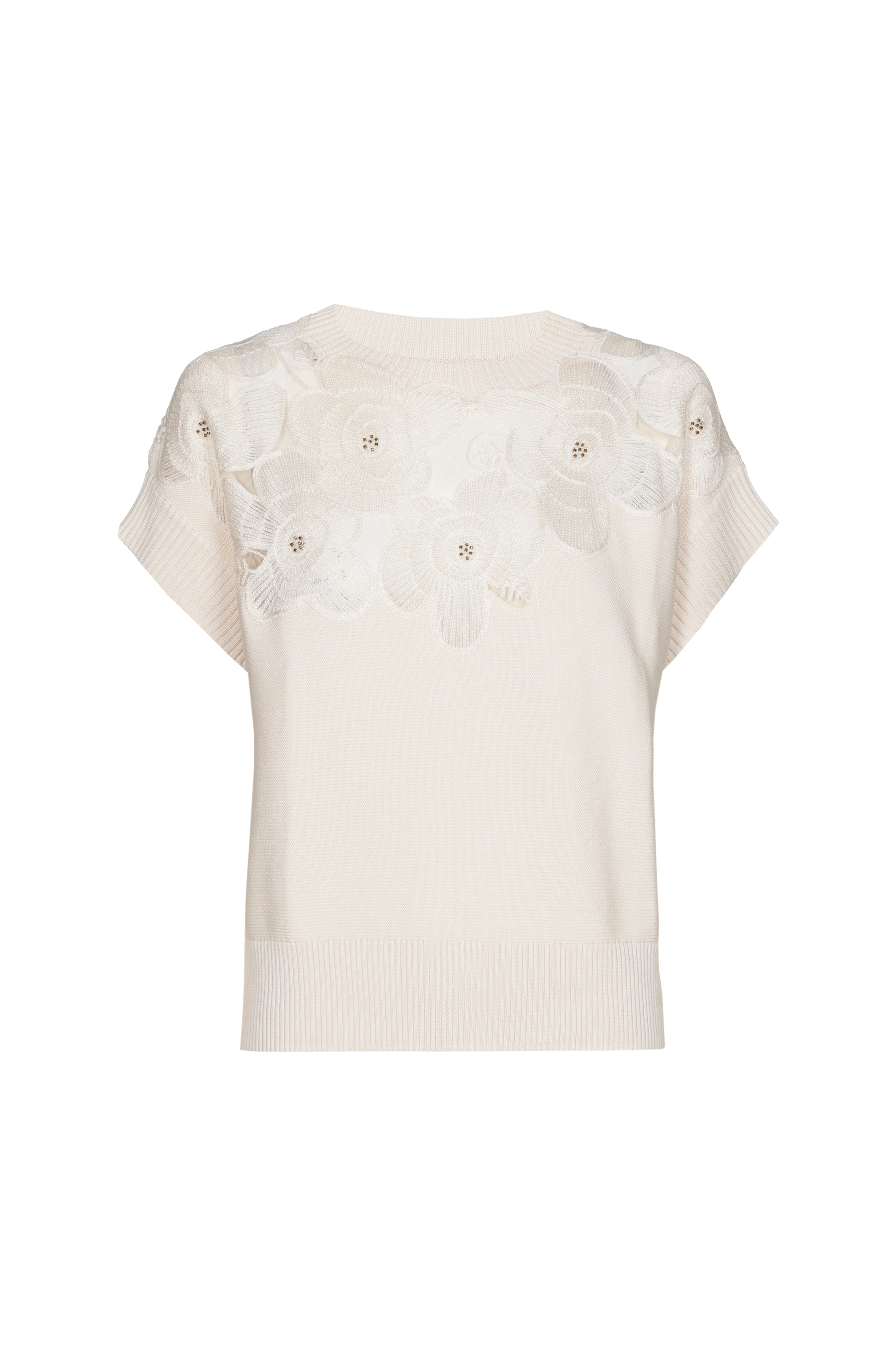 De Top Bloemdetail Natural van Caroline Biss is een elegante top met ronde hals. Het fijngebreide model heeft korte mouwen en rijke bloemenapplicaties op de voorkant. Perfect voor een chique zomerse look.