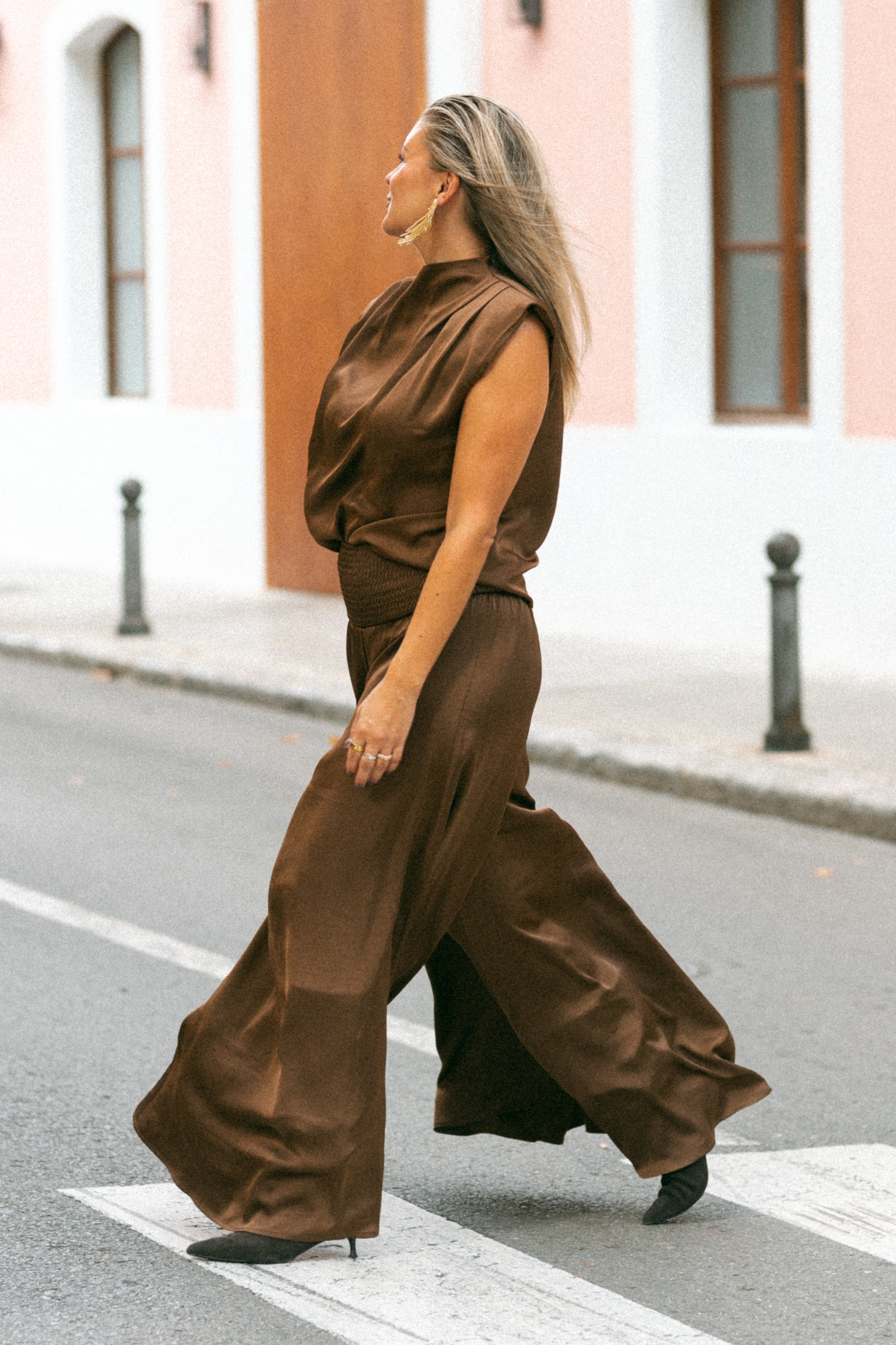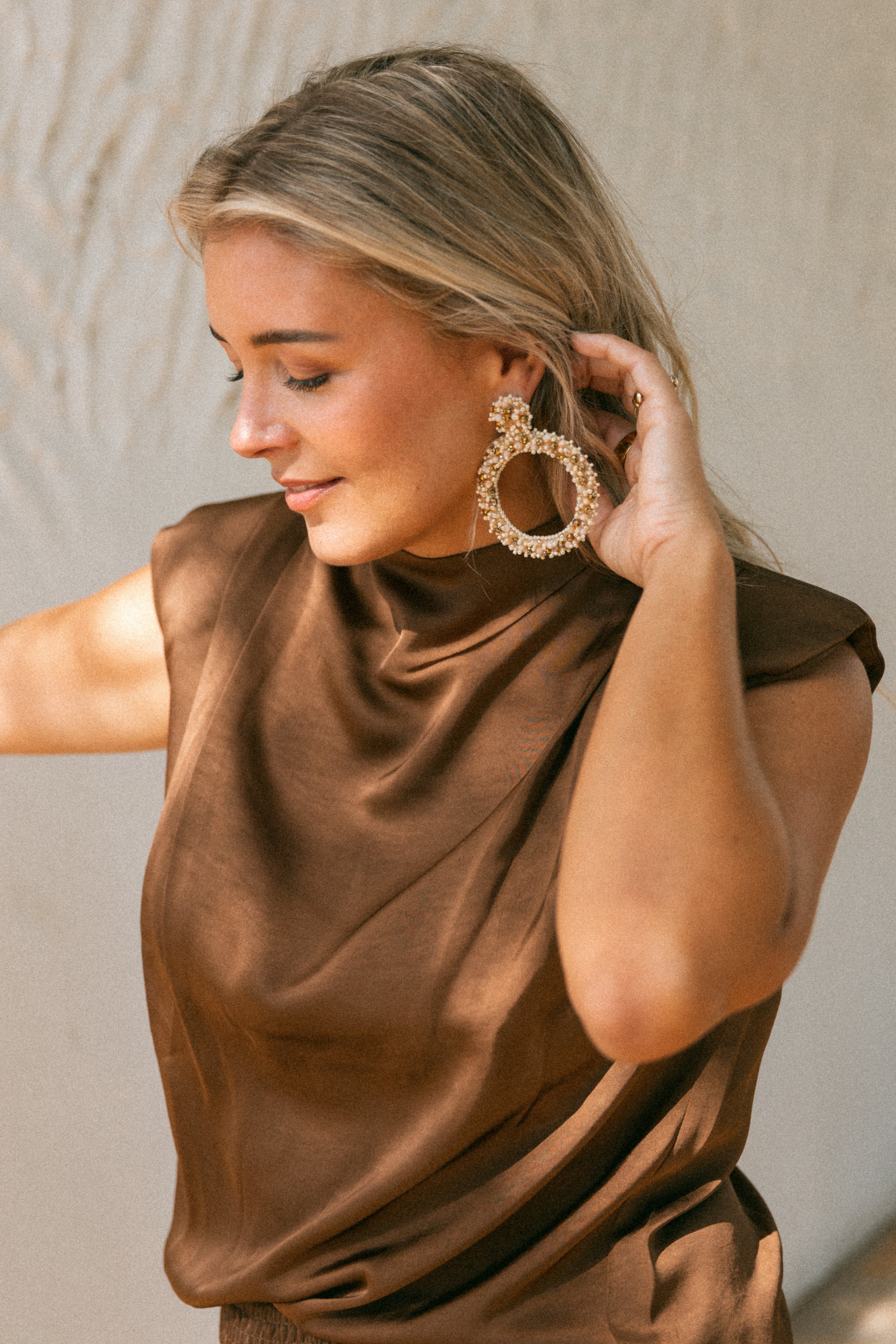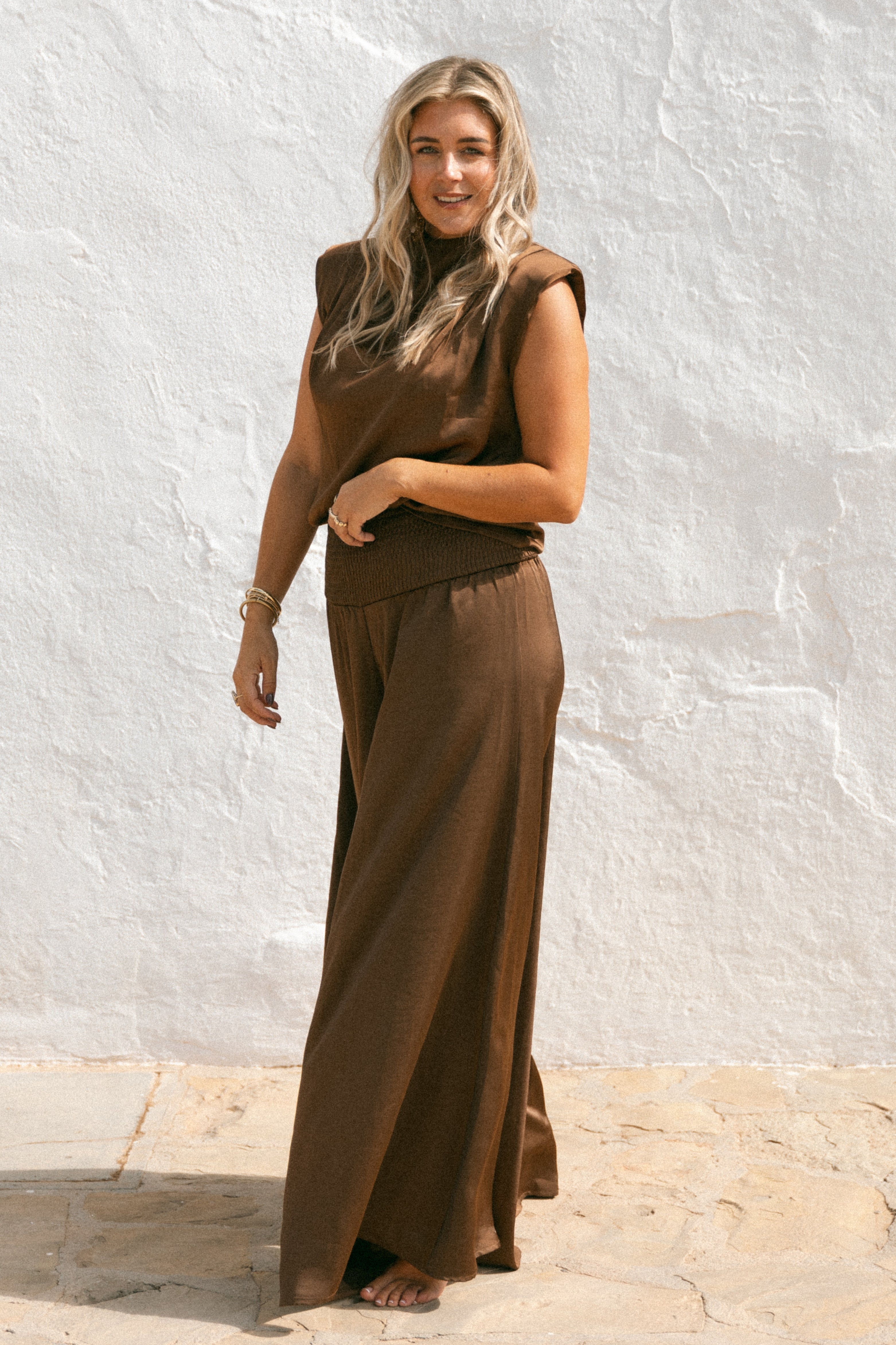 De Top Cariño Dark Brown van Bolina Island is een elegante top met hoge ronde hals. Soepelvallende, licht glanzende stof en subtiele schouderaccenten. Perfect voor diner of feest.